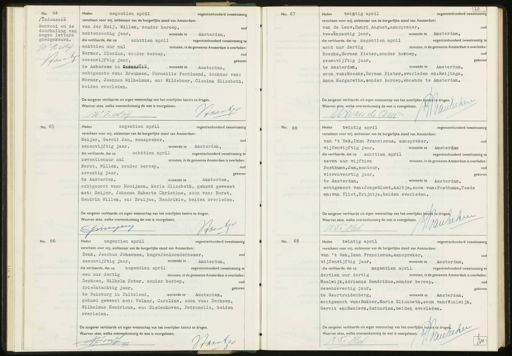 No. 64 Indonesië Renvooi en de doorhaling van negen letters goedgekeurd. 18 7/„ Meij Baand Heden negentien april negentienhonderd tweeënzestig verscheen voor mij, ambtenaar van de burgerlijke stand van Amsterdam: van der Meij, Willem, zonder beroep, oud achtenzestig jaar, wonende te Amsterdam, die verklaarde, dat op achttien april negentienhonderd tweeënzestig te achttien uur nul minuten, in de gemeente Amsterdam is overleden Wormer, Clasina, zonder beroep, oud zesenvijftig jaar, geboren te Ambarawa in Ondadésie,, wonende te Amsterdam, echtgenote van: Brenkman, Corneille Ferdinand, dochter van: Wormer, Joannes Wilhelmus, en: Wildeboer, Clasina Elisabeth, beiden overleden. De aangever verklaarde uit eigen wetenschap van het overlijden kennis te dragen. Waarvan akte, welke overeenkomstig de wet is voorgelezen. Baarts W J. Meij No. 67 Heden twijtig april negentienhonderd tweeënzestig verscheen voor mij, ambtenaar van de burgerlijke stand van Amsterdam: van de Leuv, Henri August,aanspreker, oud tweeënzestig jaar, wonende te Amsterdam, die verklaarde, dat op negentien april negentienhonderd tweeënzestig t acht uur dertig minuten, in de gemeente Amsterdam is overleden Roeske, Herman Pieter,zonder bepoep, oud geboren zesenvijftig jaar, wonende te Amsterdam, te Amsterdam, zoon van: Roeske, Herman Pieter,overleden en: Reijinga, Anna Margaretha,zonder beroep,wonende te Amsterdam. De aangever verklaarde uit eigen wetenschap van het overlijden kentijs te dragen. Vanteeker Waarvan akte, welke overeenkomstig de wet is voorgelezen. Avandeb No. 65 Heden negentien april negentienhonderd tweeënzestig verscheen voor mij, ambtenaar van de burgerlijke stand van Amsterdam: Meijer, Gerrit Jan, aanspreker, oud eenenvijftig jaar, wonende te Amsterdam, die verklaarde, dat op achttien april negentienhonderd tweeënzestig t zeventienuur nul minuten, in de gemeente Amsterdam is overleden o Borst, Willem, zonder beroep, geboren zeventig jaar, te Amsterdam, wonende te Amsterdam, echtgenoot van: Mooijman, Maria Elizabeth, gehuwd geweest met: Meijer, Johanna Huberta Christina, zoon van: Borst, Hendrik Willem, en: Bruijne, Hendrikie, beiden overleden. De aangever verklaarde uit eigen wetenschap van het overlijden kennis te dragen. Waarvan akte, welke overeenkomstig de wet is voorgelezen. Brantse Bmeyjeri No. 68 Heden twintig april negentienhonderd tweeënzestig verscheen voor mij, ambtenaar van de burgerlijke stand van Amsterdam: van 't Hek, Iman Franciscus, aanspreker, oud vijfenvijftig jaar, wonende te Amsterdam die verklaarde, dat op achttien april negentienhonderd tweeënzestig te zeven uur vijftien minuten, in de gemeente Amsterdam is overleden Posthuma, Jan,monteur, oud geboren vierenveertig Jaar, worende te Ansterdam, te Amsterdam, echtgenoot van: Jongebloet,Aaltje,zoon van: Posthuma,Taede en: van Vliet,Trijntje,beiden: overleden. De aangever verklaarde uit eigen wetenschap van het overlijden kentis te dragen J Vanbekeu Waarvan akte, welke overeenkomstig de wet is voorgelezen. J.V v Het No. 66 Heden negentien april negentienhonderd tweeënzestig verscheen voor mij, ambtenaar van de burgerlijke stand van Amsterdam: Donk, Jacobus. Johannes, begrafenisondernemer, ou zesenvijftig jaar, wonende te Amsterdam, die verklaarde, dat op negentien april negentienhonderd tweeënzestig te een uur dertig minuten, in de gemeente Amsterdam is overleden Derksen, Wilhelm Peter, zonder beroep, oud drieentachtig jaar, geboren te Duisburg in Duitsland, wonende te Amsterdam, gehuwd geweest met: Volmer, Caroline, zoon van: Derksen. Wilhelmus Hendricus, en: Diedenhoven, Petronella, beiden overleden. De aangever verklaarde uit eigen wetenschap van het overlijden kennis te dragen. Waarvan akte, welke overeenkomstig de wet is voorgelezen. JJovep Waarter No. 69 Heden twintig april negentienhonderd tweeënzestig verscheen voor mij, ambtenaar van de burgerlijke stand van Amsterdam: