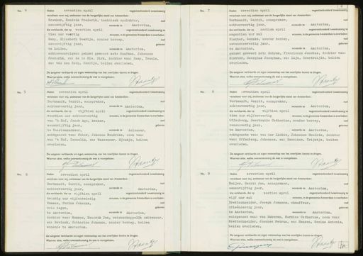 No. 4 Heden zeventien april negentienhonderd tweeënzestig, verscheen voor mij, ambtenaar van de burgerlijke stand van Amsterdam: Brenker, Hendrik Frederik, technisch opzichter, oud zesenvijftig jaar, wonende te Amsterdam, die verklaarde, dat op veertien april negentienhonderd tweeënzestig te tien uur veertig minuten, in de gemeente Amsterdam is overleden Ramp, Elisabeth Geertje, zonder beroep, oud zesenvijftig jaar, geboren te Leiden, wonende te Amsterdam, achtereenvolgens gehuwd geweest met: Knufman, Johannes Frederik, en: de la Rie, Dirk, dochter van: Ramp, Teunis, en: van den Berg, Neeltje, beiden overleden. De aangever verklaarde uit eigen wetenschap van het overlijden kennis te dragen. Waarvan akte, welke overeenkomstig de wet is voorgelezen. Haarde H Horenle No. 7 Heden zeventien april negentienhonderd tweeënzestig verscheen voor mij, ambtenaar van de burgerlijke stand van Amsterdam: Dortmundt, Gerrit, aanspreker, oud achtenveertig jaar, wonende te Amsterdam, die verklaarde, dat op zestien april negentienhonderd tweeënzestig te negentien uur nul minuten, in de gemeente Amsterdam is overleden Blatter, Renske, zonder beroep, oud zevenenzeventig jaar, geboren te Amsterdam, wonende te Amsterdam, gehuwd geweest met: Schram, Franciscus Jacobus, dochter van: Blatter, Georgius Josephus, en: Lijn, Geertruijda, beiden overleden. De aangever verklaarde uit eigen wetenschap van het overlijden kennis te dragen. Waarvan akte, welke overeenkomstig de wet is voorgelezen. Roantes Datmundt No. 5 Heden zeventien april negentienhonderd tweeënzestig verscheen voor mij, ambtenaar van de burgerlijke stand van Amsterdam: Dortmundt, Gerrit, aanspreker, oud achtenveertig jaar, wonende te Amsterdam, die verklaarde, dat op vijftien april negentienhonderd tweeënzestig te veertien uur achtenveertig minuten, in de gemeente Amsterdam is overleden van 't Hof, Jacob Age, kweker, oud geboren eenenvijftig jaar, te Haarlemmermeer, wonende te Aalsmeer, echtgenoot van: Faber, Johanna Hendrika, zoon van: van 't Hof, Cornelis, en: Wassenaar, Sjoukje, beiden overleden. De aangever verklaarde uit eigen wetenschap van het overlijden kennis te dragen. Waarvan akte, welke overeenkomstig de wet is voorgelezen. Baand J. Dertmundt No. 8 Heden zeventien april negentienhonderd tweeënzestig verscheen voor mij, ambtenaar van de burgerlijke stand van Amsterdam: Dortmundt, Gerrit, aanspreker, oud achtenveertig jaar, wonende te Amsterdam, die verklaarde, dat op vijftien april negentienhonderd tweeënzestig te tien uur vijfenveertig minuten, in de gemeente Amsterdam is overleden: Offenberg, Geertruida Catharina, zonder beroep, oud zesenzestig jaar, geboren te Amsterdam, wonende te Amsterdam, echtgenote van: van der Lichte, Johannes Hendrik, dochter van: Offenberg, Johannes, en: Goezinne, Trijntje, beiden overleden. De aangever verklaarde uit eigen wetenschap van het overlijden kennis te dragen Waarvan akte, welke overeenkomstig de wet is voorgelezen. Baad Hatmundf. No. 6 Heden zeventien april negentienhonderd tweeënzestig; verscheen voor mij, ambtenaar van de burgerlijke stand van Amsterdam: Dortmundt, Gerrit, aanspreker, oue achtenveertig jaar, wonende te Amsterdam, die verklaarde, dat op vijftien april negentienhonderd tweeënzestig te twintig uur vijfentwintig minuten, in de gemeente Amsterdam is overleden Kommes, Corine Johanna, gehooed drie dagen, M te Amsterdam, wonende te Amsterdam, dochter van: Hommes, Hendrik Jan, wetenschappelijk ambtenaar, en: Bavinck, Catharina Johanna, zonder beroep, beiden wonende te Amsterdam. De aangever verklaarde uit eigen wetenschap van het overlijden kennis te dragen. Waarvan akte, welke overeenkomstig de wet is voorgelezen. Baant Dortmana No. 9. Heden zeventien april negentienhonderd tweeënzestig verscheen voor mij, ambtenaar van de burgerlijke stand van Amsterdam: Meijer, Gerrit Jan, aanspreker, oud eenenvijftig jaar, wonende te Amsterdam, die verklaarde, dat op zestien april negentienhonderd tweeënzestig te vijf uur nul minuten, in de gemeente Amsterdam is overleden: Brettschneider, Joseph Joannes, chauffeur, oud drieënzestig jaar, geboren te Amsterdam, wonende te Amsterdam, echtgenoot van: van Eekeren, Hermina Catharina, zoon van: Brettschneider, Joannes Petrus, en: Hansen, Gesina Antonia, beiden overleden. De aangever verklaarde uit eigen wetenschap van het overlijden kennis te dragen. Waarvan akte, welke overeenkomstig de wet is voorgelezen. Baante Bneeen