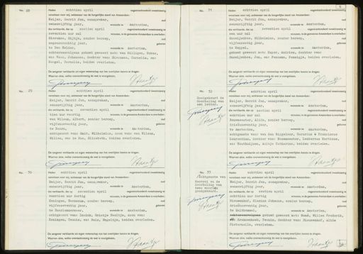 No. 28. Heden achttien april negentienhonderd tweeënzestig verscheen voor mij, ambtenaar van de burgerlijke stand van Amsterdam: Meijer, Gerrit Jan, aanspreker, oud eenenvijftig jaar, wonende te Amsterdam, die verklaarde, dat op zestien april negentienhonderd tweeënzestig t zeventien uur nul minuten, in de gemeente Amsterdam is overleden Siersmaa, Sijtje, zonder beroep, oud negenentachtig jaar, geboren te Den Helder, wonende te Amsterdam, achtereenvolgens gehuwd geweest met: van Milligen, Rokes, en: Vaes, Johannes, dochter van: Siersmaa, Cornelis, en: Mangel, Cornelia, beiden overleden. De aangever verklaarde uit eigen wetenschap van het overlijden kennis te dragen. Waarvan akte, welke overeenkomstig de wet is voorgelezen. Haants pjey No. 31 Heden achttien april negentienhonderd tweeënzestig verscheen voor mij, ambtenaar van de burgerlijke stand van Amsterdam: Meijer, Gerrit Jan, aanspreker, oud eenenvijftig jaar, wonende te Amsterdam, die verklaarde, dat op zeventien april negentienhonderd tweeënzestig te een uur nul minuten, in de gemeente Amsterdam is overleden: Snoeijenbos, Wilhelmina, zonder beroep, oud vijfenzestig jaar, geboren wonende te Amsterdam, te Meppel, gehuwd geweest met: Kuper, Andries, dochter van: Snoeijenbos, Jan, en: Fennema, Femmigje, beiden overleden. De aangever verklaarde uit eigen wetenschap van het overlijden kennis te dragen. Waarvan akte, welke overeenkomstig de wet is voorgelezen. Baank nespr No. 29 Heden achttien april negentienhonderd tweeënzestig verscheen voor mij, ambtenaar van de burgerlijke stand van Amsterdam: Meijer, Gerrit Jan, aanspreker, oud eenenvijftig jaar, wonende te Amsterdam, die verklaarde, dat op zeventien april negentienhonderd tweeënzestig te tien uur veertig minuten, in de gemeente Amsterdam is overleden van Wilsum, Albert, zonder beroep, oud geboren vijfenzeventig jaar, te Baarn, wonende te Amsterdam, echtgenoot van: Smit, Wilhelmina, zoon van: van Wilsum, Willem, en: de Man, Elizabeth, beiden overleden. De aangever verklaarde uit eigen wetenschap van het overlijden kennis te dragen. Waarvan akte, welke overeenkomstig de wet is voorgelezen. Hoantes Jmyeny No. 32 een letter. Goedgekeurd de doorhaling van Breeenr