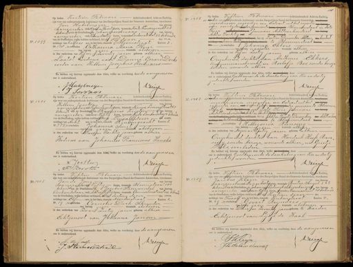 venveraerd, dat op Zestien December Achttien der honderd middags ten zeven en Tachtigven in het haie staande te Bloemendaal kanten de, is overleden Johanna Ekkers van beroep naaister wonende alhier in den ouderdom van vijf en zestig jaren geboren alhier Ongehuwd, dochter van Anthonie Ekkers timmermansknecht en Roelofje Bos, zonder beroep beiden wonende alhier En hebben wij hiervan opgemaakt deze Akte, welke na voortezing door ons is onderteekend. Goedkeurende de doorhaling van Vier en dertig gedrukte woorden Driessen No. 1401 Op heden Veertien Februari Achttienhonderd Acht-en-tachtig, zijn voor ons ondergeteekende Ambtenaar van den Burgerlijken Stand der Gemeente Amsterdam, verschenen: Willem Joosten, van beroep aan opzeker oud vijf en zeventig Jaren, wonende Nieuwe Looiersstraat 67 bekende van de Overledene, en Franciscus Kristen van beroep, aanspreker oud zes en Vijftig Jaren, wonende byde Lombardsteeg4 bekende van de Overledene, welke hebben verklaard dat op Twaalf dezer de voor middags ten Acht ure, in het huis, staande Rinbengracht Kanton 2 No. 774, is overleden Johanna Smit van broep geen wonende als boven in den ouderdom van Twee en Tachtig jaren geboren alhier Weduwe van Johannes Franciscus Heuske En hebben wij hiervan opgemaakt deze Akte, welke na voorlezing door de aangeversen ons is onderteekend. W Jooster Dreessen T.Kristen No. 1407 Op heden Vijftien Februari Achttienhonderd Achten-Tachtig is zijn door ons ondeygeteekende Ambtenaar van den Burgerlijken Stand der Gemeente Amsterdam, verschenen: ingeschreven ingevolge een Extract uit het van beroep register van ou overlyden daren wonende der gemeente Bloemen„ daal van de dreneen in dato Twee Januari van beroep Achttienhonderded Acht en Tachtigenen verendi van de Oerledang welke hehben verklaard, dat op Acht en Twintig December der Achttienhon middaar bon derd Zevenendertienen in hetvuedoorde te Bloemendaal Kanton de, is overleden Hillegonda Runsing van beroep geen wonende alhier in den ouderdom van Negen en dertig jaren geboren alhier Ongehuwd, dochter van Hendrik Hesse Run„ sing zonder beroep, wonende alhier, en Grietje sels, overleden En hebben wij hiervan opgemaakt deze Akte, welke uoveertering door ons is onderteekend. Goedkeurende de doorhaling van Vier en dertig gedrukte woorden — Driessen No. 1403 Op heden Vijftien Februari Achttienhonderd Acht en-Tachtig, zijn voor ons ondergeteekende Ambtenaar van den Burgerlijken Stand der Gemeente Amsterdam, verschenen: Jan de Jong van beroep aan opreker oud vijftig Jaren, wonende Bloemstraat 150 bekend van de Overledene en Jacobus Steenwinkel, van beroep bierhandelaar oud Acht en vijftig Jaren, wonende Commelinstraat 112 bekende van de Overledene, welke hebben verklaard, dat op dertien dezer des voor middags ten Elf ure, in het huis, staande Noorderstraat Kanton 2, No. 19, is overleden Cornelis Dirk Schreuder van beroep geen wonende als boven in den ouderdom van zes en zestig jaren geboren alhier Echtgenoot van Johanna Jansen En hebben wij hiervan opgemaakt deze Akte, welke na voorlezing door de aangeversen ons is onderteekend. J. de Jonst. Driessen J. Steenwinkel No. 1409 Op heden Viftien FebruariAchttienhonderd Aant en Tachtig, zijn voor ons opergeteekende Ambtenaar van den Burgerlijken Stand der Gemeente Amsterdam, verschenen: Jacobus Kleyn van beroep Jaanspreker oud Drie en zestig Jaren, wonende Buiten Singel 249 bekende van de Overledene, en Johannes Lodewijk Schimsheimer, van beroep aanspreker oud zeven en vijftig Jaren, wonende Sarnexstraat 78 bekende van de Overledene, welke hebben verklaard, oud op veertien dezer des middags ten Twaalf ure, in het huis, staande Vinkenstraat Kanton 4, No. 49, is overleden Govert Reijnders van bertep geen wonende als boven in den ouderdom van zrie en zeventig jaren geboren te Warder Echtgenoot van Lijdje de Waal En hebben wij hiervan opgemaakt deze Akte, welke na voorlezing door de aangevers en ons is onderteekend. Jeyn Driecsen JLe Schumstuimer