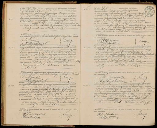 No. 115 Op heden Vyf Januari Achttienhonderd Acht-en-Tachtig zijn voor ons ondergeteekende Ambtenaar van den Burgerlijken Stand der Gemeente Amsterdam, verschenen: Johannes Maas van beroep opzichter oud zevenenvijftig Jaren, wonende Binnengasthuis bekende van de Overledene, en Albertus Krouwel van beroep opzichter oud zestig Jaren, wonende als boven bekende van de Overledene, welke hebben verklaard, dat op sier dezer des na middags ten Negen ure, in het huis staande Binnengasthuis Kanton 2, No. 10, is overleden Keeltje van Wiet van houen tgeen wonende Houtmankade 85 in den ouderdom van Drie en Twintig jaren geboren te Ouderkerk aan den Amste Echtgenoot van Frederik Mol En hebben wij hiervan opgemaakt deze Akte, welke na voorlezing door de aangevees en ons is onderteekend. Goedkeuren de de doorhaling van Twee gedrukte woorden I Maas Driessen vel 8 No. 121 Op heden Vyf Januari Achttienhonderd Acht-en-Tachtig, IN zijn voor ons ondergeteekende Ambtenaar van den Burgerlijken Stand der Gemeente van beroep aanopreker oud Eenen vijftig Jaren, wonende Haarlem i Amsterdam, verschenen: Willem Sermie 50 6 merplein 22 bebea de Overledene, Willem Gerholt x 5 47 van beroep aanspreker oud Vier en Zestig Nti Jaren, wonendeEgelanderstraat vobebamfan de Overledene, welke hebben: verklaard, dat op Twee dezer des na middag. ten Drie ure, in het huis, staande Daniel Stalpertstraat Kanton 2 No. 58, is overleden Grietje Bolff van beroep geen wonende Tweede Weteringdwarsstraat in den ouderdom van Een en zeventig jares geboren alhier Laatst weduwe van Georg Anton Otte, eerder van Jeremias Melchers En hebben wij hiervan opgemaakt deze Akte, welke na voorlezing door de aangevers en ons is onderteekend. Woernie Driessen W Gerholt No. 117 Op heden Vyf Januari Achttienhonderd Acht-en-Tachtig zijn voor ons ondergeteekende Ambtenaar van den Burgerlijken Stand der Gemeente Amsterdam, verschenen: Johannes Maas van beroep opzichter oud zeven en vijftig Jaren, wonende Binnengagthuis bekende van de Overledene, en Albertus Krouwel van beroep opzichter oud zestig Jaren, wonende als boven bekende van de Overledene, welke hebben verklaard, dat op Heden des voor middags ten Drie ure, in het huis staande Binnengasthuis Kanton 2 No. 10, is overleden Jacobus Liedermooi Aam beroep werkman wonende tweed Goudsbloemdwarsstra in den ouderdom van zestig jaren geboren alhier Echtgenoot van Adriana Catharina van Vliet En hebben wij hiervan opgemaakt deze Akte, welke na voorlezing door de aangevers en ons is onderteekend. Goedkeurende de doorhaling van Twee gedrukte woorden J. Maas. Driessen A Bouwel No. 123 Op heden Vijf Januari Achttienhonderd Aeht-en-Tachtig, zijn voor ons ondergeteekende Ambtenaar van den Burgerlijken Stand der Gemeente Amsterdam, verschenen: Albertus Hansz van beroep aanspzeker oud Drie en Zestig Jaren, wonende Lijnbaansgracht 101 bekende van de Overledene, en Hendrik Mlethöfer van beroep aanspreker oud Vijf en Vijftig Jaren, wonende Eerste Lindendwarsstraat 22 beken van de Overledene, welke hebben verklaard, dat op Drie dezer des middags ten Twaalf ure, in het huis, staande Lynbaansgracht Kanton 3, No. 129, is overleden Wilhelmina Taphee van beroep geen wonende als boven in den ouderdom van zes en Veertig jaren geboren alhier Echtgenoot van Hendrik Lippe En hebben wij hiervan opgemaakt deze Akte, welke na voorlezing door de aangevers en ons is onderteekend. A. Fransz. Driessen H Methofen No. 119 Op heden Vyf Januari Achttienhonderd Acht-en-Tachtig, zijn voor ons ondergeteekende Ambtenaar van den Burgerlijken Stand der Gemeente Amsterdam, verschenen: Hendricus Jacobus Markus van beroep venter oud vijf en TwintigJaren, wonende Noordermarkt 24 vader van de Overledene, en Willem Lodewijk van der Groen van beroep aansp zeker oud Vijf en Twintig Jaren, wonende Zeedik 124 bekende van de Overledene, welke hebben verklaard, dat of Drie dezer des na middags ten zes ure, in het huis, staande Sarphakstraat Kanton 1 No. 104, 's overleden Hendrik Markus van beroep geen wonende Noordermarkt 24 in den ouderdom van Een en Twintig maande geboren alhier zoon van Hendricus Jacobus Markus, en Neeltje Breukelaar En hebben wij hiervan opgemaakt deze Akte, welke na voorlezing door de aangevers en ons is onderteekend. HJ Murkus Driessen L van der Groen No. 125 Op heden vyf Janaari Achttienhonderd Acht-en-Tachtig, zijn voor ons ondergeteekende Ambtenaar van den Burgerlijken Stand der Gemeente Amsterdam, verschenen: Hendricus Bernardus van Schoonhoven, van beroep aanspzeker oud Negen en dertig Jaren, wonende Nieuwe Leliestraat 100 bekende van de Overledene en Adrianus Bastiaans van beroep aanspreker oud Acht en Veertig Jaren, wonende Kiolettenstraat 3 bekende van de Overledene, welke hebben verklaard, dat op vier dezer des voor middags ten Acht ure, in het huis, staande Jacob van Lennepstraat Kanton No. 76, is overleden Hendrik Carel Albert Kreff van beroep geen wonende als boven in den ouderdom van Twee en Twintig maanden geboren alhier zoon van Alica Catharina Krefft En hebben wij hiervan opgemaakt deze Akte, welke na voorlezing door de aangevers en ons is onderteekend. Driessen H B v Schoorbort A. Bastiaan