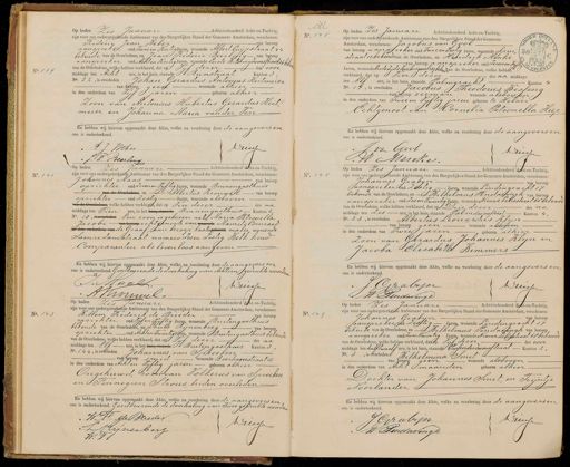 No. 139 Op heden Zes Januari Achttienhonderd Acht-en-Tachtig, zijn voor ons ondergeteekende Ambtenaar van den Burgerlijken Stand der Gemeente Amsterdam, verschenen: Frederig Jean Heber, an beroep aanspreker oud Twee en Veertig Jaren, wonende Albertluijpstraat 44 bekende van de Overledene, en Jean Frederie Beerling van beroep aanspreker oud Acht en Veertig Jaren, wonende Eerste Weteringswarsstraat 26 beken van de Overledene, welke hebben verklaard, dat op vyf dezer des voor middags ten Acht ure, in het huis, staande SRanstraat Kanton 3 No. 22, is overleden Johan Gerardus Antonius Heitmeier van beroep geen wonende alhier in den ouderdom van vijf jaren geboren alhier Zoon van Antonius Hubertus Gerardus Heitmeier en Johanna Maria van der VenEn hebben wij hiervan opgemaakt deze Akte, welke na voorlezing door de aangevers en ons is onderteekend. A J Jber Driecp J.F. Beerling M No. 145 13 Op heden Zes Januari Achttienhonderd Acht-en-Tachtig, zijn voor ons ondergeteekende Ambtenaar van den Burgerlijken Stand der Gemeente 17 C Amsterdam, verschenen: Jacobus van Gool van beroep aanmreker oud Twee en zestig Jaren, wonende Spui„597 3 straat 11 bekende van de Overledene, en Hendrik Menke r an beroep aanopreker oud Zeven en Vyftig Jaren, wonende Oude Zijds voorburgwal 139 beken dvan de Overledene, welke hebben rcEt verklaard, dat op Vier dezer des na middags ten Elf ure, in het huis, staande Palmgracht Kanton 4 No. 14, is overleden Jacobus Theodorus Bessing van beroep zeeman wonende als boven in den ouderdom van Twee en Vijftig jaren geboren te Helder Echtgenoot van Cornelia Petronella Hiep En hebben wij hiervan opgemaakt deze Akte, welke na voorlezing door de aangevers en ons is onderteekend. J van Gool Driessen A Menke. No. 141 Op heden Zes Januari Achttienhonderd Acht-en-Tachtig, zijn voor ons ondergeteekende Ambtenaar van den Burgerlijken Stand der Gemeente Amsterdam, verschenen: Johannes Maas van beroep opzichter oud zevenen Vijftig Jaren, wonende Binnengasthuis van de Overledene, en Albertus Krouwel van beroep opzichter oud zestig Jaren, wonende als boven van de Overledene welke hebben verklaard, dat op sier dezer des na middags ten Tien ure, in het huisstaande Binnengasthuis. — Kanton 2 No. 10, woverleden Een zoon is geboren uit, Maria Petronella Jacobi van hureep echtgenoote van wane Maurits Coenraad o den ouderden van de Graaf, van beroep kasten eoren maker, wonende Saenredamstraat numero Zes en Zestig Welk kind Comparanten als leven loos aangeven En hebben wij hiervan opgemaakt deze Akte, welke na voorlezing door de aangevers en ons is onderteekend. Goedkeurende de doorhaling van Achttien gedrukte woorden J. Saal. Driessen A Brouwel No. 147 Op heden zes Januari Achttienhonderd Achten-Tachtig, zijn voor ons ondergetelkende Ambtenaar van den Burgerlijken Stand der Gemeente Amsterdam, verschenen: Johannes Grabijn van beroep aanspreker oud zestig Jaren, wonende Lindengracht 12 bekende van de Overledene, en Wilhelmus Vendavingh van beroep aanopzeker oud zes en Twintig Jaren, wonende Nieuwe Leliestraat 68 bekende van de Overledene, welke hebben verklaard, dat op dhie dezer des na middags ten zes ure, in het huis, staande Palmdwarsstraat Kanton 4. No. 23, is overleden Albertus Leonardus Klijn van beroep geen wonende alsroven in den ouderdom van Twee jaren geboren alhier zoon van Gerardus Johannes Klijn en Jacoba Elisabeta Wimmers En hebben wij hiervan opgemaakt deze Akte, welke na voorlezing door de aangevers en ons is onderteekend. Grabijn Driessen W Pendavingh No. 143 Op heden Zes Januari Achttienhonderd Aht en-Tachtig, zijn voor ons ondergeteekende Ambtenaar van den Burgerlijken Stand der Gemeente Amsterdam, verschenen: Willem Frederik de Brieder van beroep opzichter oud vijf en vijftig Jaren, wonende Buitengasthuis bekende van de Overledene, en Louis Rijnenberg van beroep opzichter oud Achten Twintig Jaren, wonende Buitengasthuis bekende van de Overledene, welke hebben verklaard, dat op vyf dezer des na middags ten Elf ure, in het huis, staande Builengasthuis Kanton 3 No. 144, s overleden Johannes van Spreeken van beroep smid wonende Boerhaavestraat 12 in den ouderdom van Acht en Vijftig jaren geboren alhier a/ Ongehuwd, zoon van Polkerus van Spreeken en Fennegien Strous, beiden overledenEn hebben wij hiervan opgemaakt deze Akte, welke na voorlezing door de aangeversen, ons is onderteekend. Goedkeurende de doorhaling van Twee gedrukte woorden vel W.H. de Brieder Driessen ijnerberg In 9 No. 149 Op heden Zes Januari Achttienhonderd Achten-Tachtig, zijn voor ons ondergeteekende Ambtenaar van den Burgerlijken Stand der Gemeente Amsterdam, verschenen: Johannes Grabijn van beroep Jaanspreker nd zertig Jaren, wonende Lindengracht 17 bekende van de Overledene, en Wilhelmus Sendavingh van beroep aanspreker oud zes en Twintig Jaren, wonende Nieuwe deliestraat 68 bekende van de Overledene, welke hebben verklaard, dat op sif dezer des voor middags ten half twaalf ure, in het huis, staande Passeerderdwarsstraat Kanton 2, No. 3, is overleden Wilhelmina Smit van beroep geen wonende als boven in den ouderdom van Schismaanden geboren alhier Oochter van Johannes Smit, en Trijntje Noorlander En hebben wij hiervan opgemaakt deze Akte, welke na voorlezing door de aangeversen ons is onderteekend. J Grabin Driessen W Pendavings