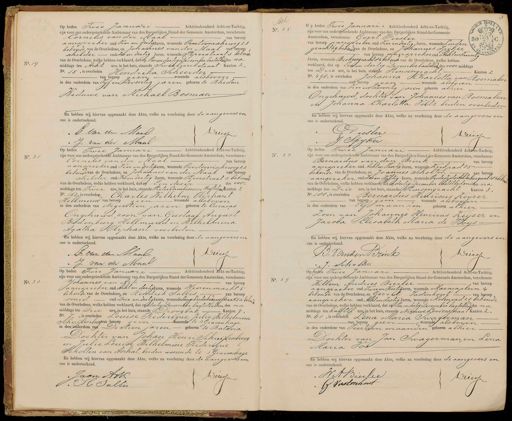 No. 19 Op heden Twee Januari Achttienhonderd Acht-en-Tachtig, zijn voor ons ondergeteekende Ambtenaar van den Burgerlijken Stand der Gemeente Amsterdam, verschenen: Cornelis van der Maal van beroep aanspreker oud vier en dertig Jaren, wonende Overtoomsche weg 22 bekende van de Overledene, en Johannes van der Maal van beroep schilder oud zes en dertig Jaren, wonende Peperstraats bekende van de Overledene, welke hebben verklaard, dat op Een endertig December laatstlagdes na middags ten Acht ure, in het huis, staande Sweblinckstraat Kanton 2, No. 15, ss overleden Hendrika Scheerder van beroep geen wonende als boven in den ouderdom van vif en zeventig jaren geboren te Rheden a Beduwe van Michael BosmanEn hebben wij hiervan opgemaakt deze Akte, welke na voorlezing door de aangevers en ons is onderteekend. E van der Maal. Driessen J. van der Maal Ad No. 25 Op heden Twee Januari Achttienhonderd Acht-en-Tachtig, P zijn voor ons ondergeteekende Ambtenaar van den Burgerlijken Stand der Gemeente Amsterdam, verschenen: Geert Piesler 8 1 119 van beroep aandreker oud vieren dertig Jaren, wonende Linden t F3 De gracht69 bekend van de Overledene, en Johannes Sijker van beroep aanspreker oud Acht en Twintig verklaard, dat op Een en dertig December laatstle des voor middags ten Drie ure, in het huis, staande Pinsengracht Kanton 2 No. 490, is overleden Johanna Charlotta van Rosmalen van beroep geen wonende als boven in den ouderdom van vier en Zeventig jaren geboren alhier Ongehuwd, dochter van Johannes van Rosmalen en Johanna Charlotta Voltz beiden overleden En hetben wij hiervan opgemaakt deze Akte, welke ua voorlezing door de aangevers en ons is onderteekend. Gusler Driessen J Spijker No. 21 Op heden Twee Januari Achttienhonderd Acht-en-Tachtig, zijn voor ons ondergeteekende Ambtenaar van den Burgerlijken Stand der Gemeente Amsterdam, verschenen: Cornelis van der Maal van beroep aanspreker oud Vier en dertig Jaren, wonende Overtoomscheweg 22 bekende van de Overledene, en Johannes van der Maal van beroep schilder oud zesendertig Jaren, wonende Peperstraat s bekende van de Overledene, welke hebben verklaard, datop Een dezer des voor middags ten Tweee ure, in het huis, staande Pieter Corneliszoon Hoofdwg Kanton 2 No. 162, s overleden Charles Wilhelm Dliphant Hellmund van beroep geen wonende aloboven in den ouderdom van Negentien jaren geboren te Caraçao Ongehuwd, zoon van Gustaaf August Bodenburg Hellmund en Wilhelmina Agatha liphant overleden En hebben wij hiervan opgemaakt deze Akte, welke na voorlezing door de aangevers in ons is onderteekend. C. van den Maal. Driessen J. van der Maal No. 2 Op heden Twee Januari Achttienhonderd Achten-Tachtig, zijn voor ons ondergeteekende Ambtenaar van den Burgerlijken Stand der Gemeente Amsterdam, verschenen: Bernardus van den Brink van beroep aanspreker oud Achten Veertig Jaren, wonende Kerkpad 75 bekende van de Overledene, en Joannes Scholten van beroep aanspreker oud zes en vijftig Jaren, wonende Oude Zijds Achterburgwal 184 beken van de Overledene, welke hebben verklaard, dat e dertig December Caatstleden ds na middags ten Drie ure, in het huis, staande Prinsengracht Kanton 3, No. 180, s overleden Bernardus Henricus Keijzer van beroep geen wonende als boven in den ouderdom van iesmaanden geboren alhier zoon van Johannes Henricus Keijzer en Jacoba PElisabeth Maria de HoysEn hebben wij hiervan opgemaakt deze Akte, welke na voorlezing door de aangevers en ons is onderteekend. JP. Vanden Berink. Driessen J. Scholten No. 23 Op heden Twee Januari Achttienhonderd Achten-Tachtig, zijn voor ons ondergeteekende Ambtenaar van den Burgerlijken Stand der Gemeente Amsterdam, verschenen: Johannes van Agk van beroep Jaanspreker oud acht en dertig Jaren, wonende Heerenmarkt 5 bekende van de Overledene, en Hendrik Sallis van beroep smid oud Drie en dertig Jaren, wonende Lange Leidscheswarsstraat 52 bekend van de Overledene, welke hebben verklaard, dat op dertig December laatstleden des na middags ten Drie ure, in het huis, staande Googbak Kanton 3, No. 7, is overleden Louise Frederique Julie Wilhelmine Schuijlenburgan beroep geen wonende te 'sGravenhage in den ouderdom van Dertien jaren geboren te Batavia Dochter van Johan Henri Schuijlenburg en Julie Louise Wilhelmine Frederigul Scholten van Aschat, beiden wonende te 's Gravenhage En hebben wij hiervan opgemaakt deze Akte, welke na voorlezing door de aangevers in ons is onderteekend. Jaan ArK Driessen P.H Sallis No. 29 Op heden Twee Januari Achttienhonderd Acht-en-Tachtig, zijn voor ons ondergeteekende Ambtenaar van den Burgerlijken Stand der Gemeente Amsterdam, verschenen: Willem Andries Bierlee van beroep aanspreker oud Twee en Veertig aren, wonende Marnixplein 4 bekende van de Overledene, en Gerrit Vastenhout van beroep aanspreker oud Acht en zestig Jaren, wonende Molenpad 2o bekende van de Overledene, welke hebben verklaard, dat op Een en dertig December laatstuides na middags ten half Elf ure, in het huis, staande Nieuwe Looiersstraat Kanton 2, No. 61, is overleden Lena Maria Swaderman van beroep geen wonende als boven in den ouderdom van Veerten maanden geboren alhier. Dochter van Jan Swagerman, en Lend Maria Vos En hebben wij hiervan opgemaakt deze Akte, welke na voorlezing door de aangevers en ons is onderteekend. WA Biurlee Dreessen G Vastenhout