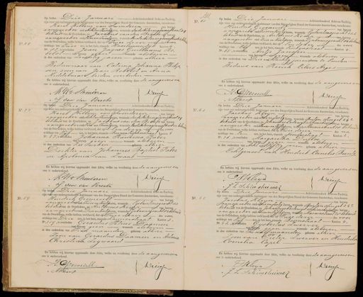 No. 55 Op heden Drie Januari Achttienhonderd Acht-en-Tachtig, zijn voor ons ondergeteekende Mmbtenaar van den Burgerlijken Stand der Gemeente Amsterdam, verschenen: Karel Willem van Swinderen van beroep aanppreker oud Acht enTwintig aren, wonende der de Weteringdwarsstraat 29 bekende van de Overledene, en Jacobus van den Broeke van beroep aanspreker oud Vier en Twintig uren, wonende Eerste Weter ingewarsstraat 44 bebe van de Overledene, welke hebben verklaard, dat opTwee dezer des voor middags ten Twee ure, in het huis, staande Haarlemmerdijk Kanton No. 87, s overleden Jean Jaques Guillaume Robelof van beroep geen wonende als boven in den ouderdom van zeventig jaren geboren alhier Weduwnaar van Catrina Johanna Philipsen zoon van Jean Robelot en Anna Middelman, beiden overleden En hebben wij hiervan opgemaakt deze Akte, welke na voorlezing door de aangevers en ons is onderteekend. KW v Brinderen Driessen J. van den Broeke M No. 61 Op heden Drie Januari Achttienhonderd Acht-en-Tachtig, zijn voor ons ondergeteekende Ambtenaar van den Burgerlijken Stand der Gemeente Amsterdam, verschenen: Hendrik Groenevelt van beroep aanspreke oud Twee en Veertig Jaren, wonende Egelantiersgracht 122 bekende van de Overledene, en Antonius Kemp van beroep aanspreker oud Drie en Veertig Jaren, wonende Lijnbaansgeacht 84 bekende van de Overledene, welke hebben verklaard, dat of Een deder des voor middags tenElf ure, in het huis, staande Sinkendiraal Kanton 4. No. 65, ss overleden Antje Janssen van beroep geen wonende als boven in den ouderdom van Drie en Tachtig jaren geboren te Emden Weduwe van Ferich Eilers ArjesEn hebben wij hiervan opgemaakt deze Akte, welke na voorlezing door de aangevers en ons is onderteekend. H: Groeridel Driessen Akemp No. 57 Op heten Drie Januari Achttienhonderd Acht-en-Tachtig zijn voor ons ondergeteekende Ambtenaar van den Burgerlijken Stand der Gemeente Amsterdam, verschenen: Karel Willem van Swinderen van beroep aanspreker oud Acht en Twintiaren, wonende der de Weteringdwarsstraat 29 bekende van de Overledene, en Jacobus van den Broeke van beroep aanspreker oud Vier en TwintigJJaren, wonende Eerste Weteringswarsstraat 44 bekend van de Overledene, welke hebben verklaard, dat op Een dezer des voor middags ten Vijf ure, in het huis, staande Binnen Tisscherstraat Kanton 1 No. 27, s overleden Johanna Francisca Faber ban beroep geen wonende als boven in den ouderdom van zes Tweken geboren alhier Dochter van Johannes Baptist Faber en Apolonia van ZwaalEn hebben wij hiervan opgemaakt deze Akte, welke na voorlezing door de aangevers en ons is onderteekend. KWoMinderen Driessen f. van den Broeke No. 63 Op heden Drie Januari Achttienhonderd AettenTachtig, zijn voor ons ondergeteekende Ambtenaar van den Burgerlijken Stand der Gemeente Amsterdam, verschenen: Jacobus Kleyn van beroep aanopreker oud Drie en zestig Jaren, wonende Buiten Singel 24c bekende van de Overledene, en Johannes Lodewijk Schomskelmer van beroep aanspreker oud zeven en Vijftig Jaren, wonende Marniastraat 78 bekend van de Overledene, welke hebben verklaard, dat op Twee dezer des na middags ten Een ure, in het huis, staande Noorderstraat Kanton 2 No. 76, iss overleden Margaretha Dufloor van beroep geen wonende als boven in den ouderdom van Acht en Vyftig jaren geboren alhier B Echtgenoot van Hendrik Cornelis Bunte En hebben wij hiervan opgemaakt deze Akte, welke na voorlezing door de aangevers en ons is onderteekend. JKleyn Driessen J L Schinstuumer No. 59 Op heden Drie Januari Achttienhonderd Acht en-Tachtig, zijn voor ons ondergeteekende Ambtenaar van den Burgerlijken Stand der Gemeente Amsterdam, verschenen: Hendrik Groenevelt van beroep, aanspreker oud Twee en Veertig Jaren, wonende Agelantiersgracht 122 bekende van de Overledene, en Antonius Kemp van beroep aanspreker oud Drie en Veertig Jaren, wonende Lynbaansgracht 84 bekende van de Overledene, welke hebben verklaard, dat op Twee dezer des voor middags ten Drie ure, in het huis, staande Laurierstraat Kanton 3 No. 219, ss overleden Gerardus Petrus Daamen van beroep geen wonende als bovenin den ouderdom van zien maanden geboren alhier zoon van Gerardus Saamen en Antonia Christina Zegwaard. En hebben wij hiervan opgemaakt deze Akte, welke na voorlezing door de aangeversen ons is onderteekend. A. Groenedelb. Drtessen Akep No. 65 Op heden Drie Januari Achttienhonderd Aenten-Tachtig, zijn voor ons ondergeteekende Ambtenaar van den Burgerlijken Stand der Gemeente Amsterdam, verschenen: Jacobus Kleyn van beroep Jaanspreker oud Drie enzestig Jaren, wonende Buiten singel 2 47 bekende van de Overledene, en Johannes Lodewijk schimsheimer beroep aan opreker oud zevenenVijftig Jaren, wonende Marnixstraat 78 bekende van de Overledene, welke hebben verklaard, dat op Twee dezer des voor if ure in het huis, staande Boomstraat kanton 4, middags ten zij No. 42, geverleden Gysbertus Zwerver vanhareen geen wonende als boven in den ouderdom van Twaalf maanden geboren alhier zoon van Pieter Zwerver en Hendrika Cornelia Capel En hebben wij hiervan opgemaakt deze Akte, welke na voorlezing door de aangeveisen ons is onderteekend. Jleijn Driessen J L. Schuustumer