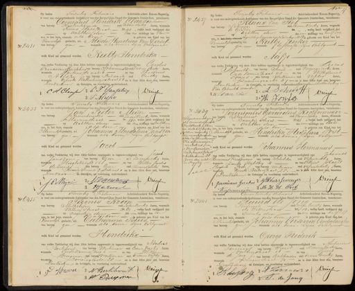 No 2431 Op heden Twintig Februari Achttienhonderd Een-en-Negentig is voor ons ondergeteekende Ambtenaar van den Burgerlijken Stand der Gemeente Amsterdam, verschenen: Coenraad Hendrik Claasen. van beroep Kantoorbediende oud zesen dertig Jaren, wonende Frans Halsstraat No. 90, welke heeft verklaard dat op achttien dezer des na middags ten Vier is geboren een Kind van he ure, in het huis, staande als boven Vrouwelijk geslacht, uit Alyda Hendrica Van Versel. van beroep geen wonende als boven, zijne Echtgenoot welk Kind zal genaamd worden Neeltje Hendrika van welke Verklaring wij deze Akte hebben opgemaakt in tegenwoordigheid van Carolus Franciscus Gersteling van beroep schoenmaker oud zesen dertig Jaren, wonendesartenstraat6 en van Theodouw Alessie van beroep Bediende oud veertig Jaren. wonende Groote Kattenburgerstraat 56 en is deze akte door ons, benevens Denvasteren de Getuigen, na Voorlezing onderteekend C.H. Claassen 2 C P Gersteling Driessen 3 T Mlessie No. 2434 In Op heden Twintig Februari Achttienhonderd Eeren-Negentig, is voor ons ondergeteekende Ambtenaar van den Burgerlijken Stand der Gemeente Amsterdam, verschenen: Klaas van Pier oud EenenVeertig Jaren, wonende van beroep Schijpper te Grakt, N, welke heeft verklaard dat op achttien dezer des voor middags ten half drie ure, in het huis, staande zijnschipliggende aan de Leidschegracht Bis geboren een Kind van het Vrouwelijk geslacht, uit Neeltje, Jonker van beroep genn wonende te Grapt zijne Echtgenoot welk kind zal genaand worden Aakje van welke Verklaring wij deze Akte hebben opgemaakt in tegenwoordigheid van Lucat Schuit- van beroep Smid oud negenendertig Jaren, wonende Oude Loodersstraat 28 en van Wilhelmus Ionjes van beroep werkman oud Vijftig Jaren, wonende Lauriegracht 67 en is deze Akte door ons, benevens Den Vaderen de Getuigen, na voorlezing onderteekend Goedgekeurd de doorhaling van Vier gedrukte woorden 2: L Schuurf Driesen K van Diel 31„ 7 14 No 2433 Op heden Twintig Fetrurrj Achttienhonderd Een-en-Negentig is voor ons ondergeteekende Ambtenaar van den Burgerlijken Stand der Gemeente Amsterdam, verschenen an Pieter Meijer van beroep Armenberocker oud zesenveertig Jaren, wonende Marnixstraat No. 331, welke heeft verklaard da op achttien dezer des na middags ten zalftien ure, in het huis, staande alpboven is geboren een kind van het Oannelik geslacht, uit Johanna Magdalena Janszen van beroep geen wonende als boven: zijne Echtgenoot welk Kind zal genaamd worden JAcob van welke Verklaring wij deze Akte hebben opgemaakt in tegenwoordigheid van Jacob janszen van beroep geen oud zesenzestig Jaren, wonende Hoogtekadyk 56 en van Willen Jacrbus de zwart van beroep Geen oud Tweeen dertig Jaren, wonende Tweede Hugs de Grootstraat 1 en is deze Akte door ons, benevens Den Vader de Getuigen, na voorlezing onderteekend. 2JSanvn Driecsen J P Meijer 3 WJ de Zwark No. 2439 „der Arrondissements Volgens machtiging Rechtbank alhier, in dato Elf Mei 1800 N acht en negentig d is in nevensstaande akte de fmilienaar Kessenmeijer verbeterd in„ Kerssemeijer. Zie By voegsel folio 12 Amsterdam 28 x Juni 1800 acht H en Negentig sehol„ Op heden Twintig Februari Achttienhonderd Een-en-Negentig is voor ons ondergeteekende Ambtenaar van den Burgerlijken Stand der Gemeente Amsterdam, verschenen: teronimus Gerardus Kessenmeyer zinan beroep Mllachinist oud vierendertig Jaren, wonende Barentsr straat No 46 welke heeft verklaard dat op achttien dezer des voormiddags ten acht tier Voo ure, in het huis, staande als boven is geboren een Kind van he Mannelijk geslacht, uit Hendrika Hesselina Post de van beroep geen wonende als boven zijne Echtgenoot naar r , welk Kind zal getaamd worden Johannes Hermanus 3 012 5 van welke verklaring wij deze aate hebben opgemaaht in tegenwoordigheid van Johannes Hermanus Kerssemeijer van beroep schilder oud vijfenzestig Jaren, wonende Zwarte Bijlsteeg 4 en van Meint Hessel Hendrik Post van beroep werkman oud vijfentwintig Jaren wonende Groote Bickersstraat 25 en is dete Akte door ops, benevens DenVaderen de Getuigen na voorlezing onderteekend. Driessen J Geromrnus Geradus 2 G HVers Seneyer 3 M. H.H. Post No 2435 Op heden Twintig Februai Achttienhonderd Een-en-Negentig is voor ons ondergeteekende Ambtenaar van den Burgerlijken Stand der Gemeente Amsterdam, verschenen: Teunis Kroon van beroep Melkslijker oud zesenveertig Jaren, wonende Willem Straat No. 69, welke heeft verklaard da op negentien dezer des na middags ten Een alftboven is geboren een Kind van het ure, in het huis, staande Vrouwelijk geslacht, uit Catharina Buis van beroep geen wonende als boven: zijne Echtgenoot welk Kind zal genaamd worden Hendrika van welke Verklaring wij deze Akte hebben opgemaakt in tegenwoordigheid van Nicolaas Berkhout van beroep werkman oud Eenenveertig Jaren wonende OudeKennissteeg o en van Willem Brugman van beroep werkman oud Tweeenviftig Jaren wonende Loviersgracht 28 en is deze Akte door ons, benevens Dan Vaderen de Getuigen, na voorlezing onderteekend. rressen P Vrovue 2 N Berkhout 3 W Duymen „ No. 2441 Kessenmeijer Op hedek Eenentwintig Februari Achttienhonderd Een-en-Negentig is voor ons ondergeteekende Ambtenaar van den Burgerlijken Stand der Gemeente Amsterdam, verschenen: Ruurd de J van beroep Bediende oud achten twintig Jaren, wonende de Wittenstraat M 13, welke heeft verklaard dat op Twintig dezer des na middags ten Kalf Elf ure, in het huis, staandeals boven is geboren ten kind van het Mannelijk geslacht, uit Johanna Versenia Verdoolaeghe van beroep geen wonende als boven: zijne Echtgenoot welk Kind zal genaamd worden George Frederik van welke Verklaring wij deze Akte hebben opgemaakt in tegenwoordigheid van Antonius Termans van beroep smid oud zevenenveertig Jaren, wonende voetboogstraat 16 en van Tjeerp de Jong van beroep Boekbinder oud drieentwintig Jaren, wonende Langenstraat 79 en is deze Akte door ons, benevens Lesvaderen de Getuigen, na voorlezing onderteekend. Driessen Hleraug hermers 1 3 I. de Jang