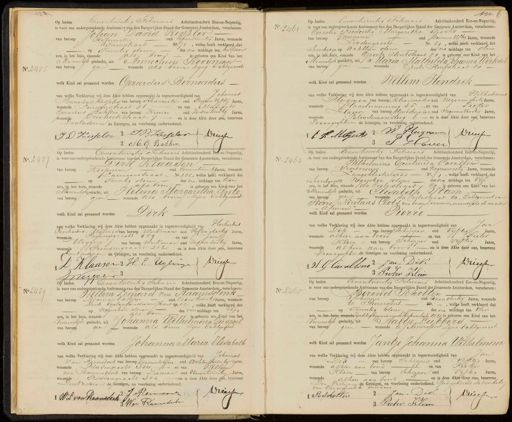 No. 2455 Op heden Eenentwintig Februari Achttienhonderd Een-en-Negentig, is voor ons ondergeteekende Ambtenaar van den Burgerlijken Stand der Gemeente Amsterdam, verschenen: Johan David Resseler van beroep Sostermak oud Eenentwintig Jaren, wonende Tuinstraat No. 70, welke heeft verklaard dat op Twintig dezer des na middags ten hafzeven ure, in het huis, staande als boven is geboren een Kind van het Mannelijk geslacht, uit Annechien Rooyman van beroep genn wonende, als boven, zijn Echtgenoot welk Kind zal genaamd worden Gerardus Bernardus van welke Verklaring wij deze akte hebben opgemaakt in tegenwoordigheid van Johannes Bernardus Kesseler van beroep schonmaker oud Twieenvijftig Jaren, wonende Lindenstraat 36 en van Milliuits Gerardus Bakser van beroep Kruier oud zesentwintig Jaren, wonende Driehoekstraat 7 en is deze Akte door ons, benevens DenVaderin de Getuigen, na voorlezing onderteekend. J D Kesseler & J B: Kesseler Driessen No. 2461 M Op heden Eenentwintig Februari Achttienhonderd Een-en-Negentig is voor ons ondergeteekende Ambtenaar van den Burgerlijken Stand der Gemeente Amsterdam, verschenen: Cornelia Frederika Margaretha Tjerks van beroep Vroedvrouw oud zevenenvyftig Jaren, wonende Lindengracht No. 89, welke heert verklaard, dat in haar byzijn op achttien dezer des na middags ten drie ure, in het huis, staande Groote Houtstraat 20 is geboren eene Kind van het Mannelijk geslacht, uit Maria Mathilda Johanna Wirkse van beroep geen wonende Groote Houtstraat 20 welk Kind zal getaamd worden Willem Hendrik van welke Verklaring wij deze Akte hebben opgemaakt in tegenwoordigheid van Wilhelsous Bloegman van beroep kleermaker oud negenendertig Jaren. wonende Haarlemmerweg 35 en van Pieter Haven van beroep Houtdraaier oud negenenveertig Jaren, wonende Blindemansteeg 6 en is deze Akte door ops, benevens De aangeepteren de Getuigen, na voorleting onderteekend. C F Mejerts W. Vloegman Driessen S H: No. 245 Op heden Eenentwintig Februari Achttienhonderd Pet-en-Negentig is voor ons ondergeteekende Ambtenaar van den Burgerlijken Stand der Gemeente Amsterdam, verschenen: Dirk Klaasen van beroep Koopman oud EenentwintiJaren, wonende Laurierstraat No. 105, welke heeft verklaard dat op Twintig dezer des na middags ten tien ure, in het huis, staande . afdbooen, is geboren een kind van het Mannelijk geslacht, uit Helena Margareina Inte van beroep geen wonende als boven zijne Echtgenoot welk Kind zal genaamd worden Dirk van welke Verklaring wij deze Akte hebben opgemaakt in tegenwoordigheid van Habertus Everhardus, Vijlings van beroep werkman oud vyf en dertig Jaren, wonende Frinsengracht 459 en van Jan Wiggers van beroep werkman oud zesendertig Jaren, wonende 16 Prinsengracht 312 en is deze Akte door ons, benevens ten Vaderen de Getuigen, na voorlezing onderteekend. Driessen D Klaaser 2 H E Uyem 25 No. 2463 Op heden Eenentwintig Februari Achttienhonderd Een-en-Negentig is voor ons ondergeteekende Ambtenaar van den Burgerlijken Stand der Gemeente Amsterdam, verschenen: Wilhelmina Geertruida Cavallina van beroep Vroedvrouw oud negenenzestig Jaren, wonende Langebleekerspad No.1, welke heeft verklaard dat in haar byrun op negentien dezer des ng middags ten Vyf ure, in het huis, staande Vda Cosbastraat 80, is geboren een Kind van het Mannelijk geslacht, uit Elisabeth Stam van beroep geen wonende da Costastraat 80 Echtgenoot van Pierre Nicolaas Cots, van beroep Zeeman, wonende als de mode Afweren "— welk kind tal genaand worden Pierre van welke Verklaring wij deze Akte hebben opgemaakt in tegenwoordigheid van Jan Dik van beroep schipper oud Vijftig Jaren, wonende alhier aan voord en van Pieter Klein van beroep schipper oud vijftig Jaren, wonende alhier aan boord en is deze Akte door ons, benevens De aangeefteren de Getuigen na voorlezing onderteekend. W G Cavalling Jan Dik Driessen 3 Pieter Klein No 2459 JWigs Op heden 11 Eenentwintig Februari Achttienhonderd Een-en-Negentig, is voor ons ondergeteekende Ambtenaar van den Burgerlijken Stand der Gemeente Amsterdam, verschenen: Willem Leonard van Raamsdonk van beroep Diamantslijper oud zesen twintig Jaren, wonende Derde Egelantiersdwarsstraat No. 12, welke Heeft verklaard dat op negentien dezer des voormiddags ten Vyf ure, in het huis, staande aes voor is geboren een Kind van het Vrouwelijk geslacht, uit Johanna Wilhelmina Luspoel van beroep geen wonende als boven: zijne Echtgenoot welk Kind zal genaamd worden Johanna Maria Elisabeth van welke Verklaring wij deze Akte hebben opgemaakt in tegenwoordigheid van Jchanwor van Raamsdonk van beroep Diamantslijker oud achtentwintig Jaren. wonende Prinsengracht 30214 en van Willem van Raamsdonk van beroep zeeman oud Vierentwintig Jaren wonende Prinsingracht 304 en is deze Akte door ons, benevens Den Vaderen de Getuigen, na voorlezing onderteekend. Driessen. W L: van Raamsobak J aHaamaand 3 Wee Raamsdeh No. 2465 Op heden Eenentwintig Februari Achttienhonderd Een-en-Negentig is voor ons ondergeteekende Ambtenaar van den Burgerlijken Stand der Gemeente Amsterdam, verschenen: Berend Scholten van beroep schinper oud Eenendertig Jaren, wonende te Amersfoort No., welke heeft verklaard dat op Twintig dezer des na middags ten vier ure, in het huis, staande zijn schipliggende aan de Houtmankade U U is geboren een Kind van het Vrouwelijk geslacht uit Galtje Lubbers van beroep geen wonende te Amersfoort zijne Echtgenoot welk Kind zal genaamd worden Jantje Johanna Wilhelmina van welke Verklaring wij deze Akte hebben opgemaakt in tegenwoordigheid van Jan Dit van beroep schipper oud vijftig Jaren wonende alhier aan boord en van Pieter Klein van beroep schipper oud Vijftig Jaren, wonende alhier aan boord en is deze Akte door ons, benevens, Den Vaderen de Getuigen, na voorlezing onderteekend. oedgekeurd de doorhaling van Vier gedrukte woorden Jan. Dirr Driessen P Scholten 3 Pieter Klein