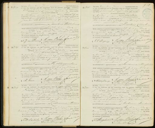 No. 7291 Op heden Zeventien Juni negentienhonderd een is voor ons Ambtenaar van den burgerlijken stand der gemeente Amsterdam, verschenen: Christiaan Johannes van Heeren, van beroep toekbrukker oud vierentwintig jaren, wonende actiien, die ons heeft verklaard dat op heden des voor middags ten Elf ure, in het huis Egelantierstraat 180 in deze gemeente is geboren een kind van het mannelijk geslacht, ut zijne echtgenoote Johanna Jacoba Sal zonder beroep wonende alhieraan welk kind worden gegeven de voornaamen van Jacobus Wilhelmus Welke verklaring is geschied in tegenwoordigheid van Cen dirton eek van beroep ambtenur oud VEenendertig jaren, wonende teauden amtee en van Pieker van Donger van beroep ambtenaar oud veertig jaren, wonende alhier En is hiervan opgemaakt deze akte, die door ons, den aangever en de getuigen, na voorlezing is onderteekend. C.J. van Beeren H. van Beek Jui 3 P van Dingen No 7298 Op heden zeventien uni negentienhonderd een, is voor ons Ambtenaar van den burgerlijken stand der gemeente Amsterdam. N verschene: Edouard Charles Bagnay- C van beroep kruidenien bediende oud tweeendertig jaren, wonende : achiier, die ons heeft verklaard dat op heden des voor middags ten Een ure, in het huis Lindenstraat 82 in deze gemeente is geboren een kind van het mannelijkgeslacht, uit zijne echtgenoote Elisabeth Lassche zonder beroep wonende alhier van delk kind word en gegeven de vooratmen en Bertus Carel Welke verklaring is geschied in tegenwoordigheid van Hendrick van Beek van beroep ambtinari, oud Eenendertig jaren, wonende tiandukenber en van Peteran Donger van beroep Ambtnaar oud veertig jaren, wonende achier En is hiervan opgemaakt deze akte, die door ons, den vangener en de getuigen, na voorlezing is onderteekend. EC Bagnag & H. van Beek Incie J van Donpe No 7294 Op heden Zzeventien Juni negentienhonderd een is voor ons Ambtenaar van den burgerlijken stand der gemeente Amsterdam, verschenen Lourens Keur van beroep behanger oud dertig jaren, wonende achiier e ons heeft verklaard dat op veertien dezer des voor middags ten Elf ure, in het huis Dapberchaat 49— in deze gemeente is geboren een kind van het vauwelijk geslacht, uit zijne echtgenoote Reetje Snoek zonder beroep wonende alhier aan welk kindwordt gegeven de voornaaa van HillegondaWelke verklaring is geschied in tegenwoordigheid van Cendrik van Beek van beroep ambtnari oud Eenendertig jaren, wonende te ouderamtel en van Pieturn Dongen van beroep Ambtwaar oud veertig Jaren, wonende altieen En is hiervan opgemaakt deze akte, die door ons, den vangever en de getuigen, na voorlezing is onderteekend. 2 H. van Beek uier 1 L Keur. 3 P van Donger No 7308 Op heden zeventien Junu negentienhonderd een, is voor ons Ambtenaar van den burgerlijken stand der gemeente Amsterdam, verschenen: Wilhelmus Kraaijkamp van beroep metaulshraaur oudeenendertig jaren, wonende achiier, die ons heeft verklaard dat op zestien dezer des voormiddags ten Een ure in het huis Rinkenhuot 38 in deze gemeente is geboren een kind van het vrouwelijk geslacht, uit zijne echtgenoote Alida Magtilda Snyjders zonder beroep wonende alhier aan welk kind word en gegeven de voornamen van Susanna Magtildo Welke verklaring is geschied in tegenwoordigheid ge Hendrik van Beck van beroep aubtaar oud Eenendertig jaren, wonende teander atie en van Pieter van Donger van beroep Ambtwaar oud veertig jaren, wonende alhier En is hiervan opgemaakt deze akte, die door ons, den aangever en de getuigen, na voorlezing is onderteekend. WKraaykamp 2 H: van Beeke Inces 3 P Van Doreg No. 7296 Op heden zeventien Juni negentienhonderd een is voor ons Ambtenaar van den burgerlijken stand der gemeente Amsterdam, verschenen, ornelis Martin Santint Van beroep Htuladon oud drieen dertig jaren, wonende achier, die ons heeft verklaard dat op veertien dezer des na middags ten tien ure in het huis Fannius Scholtenstraat 8 5an deze gemeente is geboren een kind van het vauwelijk geslacht, uit zijne echtenvale Susanna Cornelia Vellekoop zonder beroep winende alhier aan welk kind worden gegeven de voorna me van Catharina Maria Welke verklaring is geschied in tegenwoordigheid van Jendutoar Sech van beroep ambtraar oud DEenendertig jaren, wonende Jesder amstel en van PietervanDingen van beroep ambtenan oud veerti jaren, wonende alhir En is hiervan opgemaakt deze akte, die door ons, den vangever en de getuigen, na voorlezing is onderteekend. CM: Santink 2 H van Beeke 3 I vn Donren No 7302 Op heden zeventien Juni negentienhonderd een is voor ons Ambtenaar van den burgerlijken stand der gemeente Amsterdam, verschenen: Johannes Josephus Haagedoorn. van beroep besteller oud veertig jaren, wonende achier, die ons heeft verklaard dat op zestien dezer des voormddags te twee ure, in het huis Rozentraat 14 in deze gemeente is geboren een kind van hetmunnelijk geslacht, uit zine echt envote Anna Elisabeth Driehuijs zonder beroep winende alhier aan welk kind worden gegeven de voornamen van Antoon Frederik Welke verklaring is geschied in tegenwoordigheid van Hendrik van Beek van beroep ambtinaag oud Eenendertig jaren, wonende leanderduntie en van Pieteram Dongen van beroep Ambtinaar oud veertig jaren, wonende alhier En is hiervan opgemaakt deze akte, die door ons den aangever en de getuigen, na voorlezing is onderteekend. JJ Hangedaan 2 H: van Beekenne J van Deraug