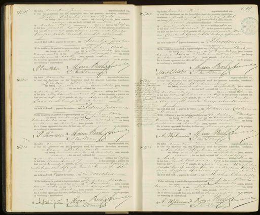 van beroep soumalint oud zesendertig jaren, wonende C 3 alhier, die ons heeft verklaard dat op veertien dezer des na middags te tes ure, 5 in het huis Dusaitstraat 7 in deze gemeente is geboren een kind van het mannelijk geslacht, uit zijne echtgenoote Johan1 na Carolma Gros zooder beroep wonende alhier. aan welk kind wordt gegeven de voornaam van Theodorus Welke verklaring is geschied in tegenwoordigheid van Hendrch aan Bech van beroep ambtnaar oud Eenendertig jaren, wonende tianderantie en van Pictes van Dorjer van beroep ambtenaar oud veertig jaren, wonende alhier En is hiervan opgemaakt deze akte, die door ons, den aangever en de getuigen, na voorlezing is onderteekend. 2 H van BeekJrn 1. Mart Eliket J van Donu No 7318 Op heden zeventien Juni negentienhonderd een is voor ons Ambtenaar van den burgerlijken stand der gemeente Amsterdam, verschenen: Pieter Simmer van beroep, koetoier oud vierendertig jaren, wonende alhier, die ons heeft verklaard dat op zestien dezer des na middags ten zeven ure in het huis Repuliersdwvanstaatii in deze gemeente is geboren een kind van het minnelijk geslacht, uit zijne chhtgenoote Betje Laas zonder beroep wonende alhier aan welk kind worden gegeven de voornamen van Petrus Johannes Welke verklaring is geschied in tegenwoordigheid van endukaan Beek van beroep ambtnaar oud Eenendertig jaren, wonende bander amtie en van Picter van Don van beroep ambtnaar oud veertig jaren, wonende alhier En is hiervan opgemaakt deze akte, die door ons, den aangever en de getuigen, na voorlezing is onderteekend. 2 H van Beekemul P Timmer J van Donrie 7324 Dit kind is door Maria Geertring Meijvogel bij akte op heden erkend Zie geb. 1911 reg. 37818 Amsterdam,: 23 Februari 1911. Meiagsaalla Dit kind is door C FFrarciscui Wolff bij huwelijk alhier op 16 October 1912 voltrokken wet Maria Geertruid. Meijvegel met hare toestamming erkens Amsterdam 18 October 1912 t Mlargéchalla a Op heden zeventien Juni negentienhonderd een is voor ons Ambtenaar van den burgerlijken stand der gemeente Amsterdam, verschenen: inde Aakke Wijbrandus van beroep vroedvruu oud vijfendertig jaren, wonende alhier, die ons heeft verklaard dat in haar bijzijn kend. o op zestien dezer des voormiddags ten twee ure, in het huis Utrechtchedvansstraat bi in deze gemeente is geboren een kind van het vrauwelijk geslacht, uit Maria Geertruida Meijvogel zonder beroep wonende alhier ijk der aan welk kind worden gegeven de voorna mi van Johanna Catharina Maria zre Welke verklaring is geschied in tegenwoordigheid van Hendrik van Beck van beroep ambtinaar oud neenendertig jaren, wonende teanderamter en van PicteraanDonge van beroep aembtinaar oud veertig jaren, wonende alhier En is hiervan opgemaakt deze akte, die door ons, de aangeefster en de getuigen, na voorlezing is onderteekend. A. Wijbrander H van Beekmeel J van Donrsse No 1328 Op heden zeventien Juni negentienhonderd een is voor ons Ambtenaar van den burgerlijken stand, der gemeente Amsterdam, verschenen, Aron Belenfante- van beroep muziehonderwijzer oud Eenen dertig jaren, wonende alhier, die ons heeft verklaard dat op veertien dezer desna middags ten Elf ure, in het huis Hobbemastraat in deze gemeente is geboren een kind van het nauwwelijk geslacht, uit zijne echtgenoote Georgine Antoinette Hesse zonder beroep vonnde alhier aan welk kind wordt gegeven de voornaam van Dorothea Welke verklaring is geschied in tegenwoordigheid van Genduk van Beek. van beroep ambtnaar oudEenendertig jaren, wonende teanderamdel en van Pietervan Dorgen van beroep ambtinaar oud veertig Jaren, wonende alhier En is hiervan opgemaakt deze akte, die door ons, den vangever en de getuigen, ua voorlezing is onderteekend. 1 Aug. detie fortie Len Belpeel J van Donree No 7326 Op heden zeventien Juni negentienhonderd een, is voor ons Ambtenaar van den burgerlijken stand der gemeente Amsterdam, verschenen: Aafke Wijbrandus van beroep voediranu oud vijfendertig Jaren, wonende alhier, die ons heeft verklaard dat inhaar bijzijn op heden des voor middags ten twiel ure, in het huis Eerste Oosterparkstraat 99 in deze gemeente is geboren gen kind van het vanwellijk geslacht, uit tJohanna van Wassenberg zonder beroep echtgenoote van Nicolaas Wilhel mus Peijpers banketbakker afwezig wonende beiden alhier aan welk kind worden gegeven de voornam van Maria Charlotte Welke verklaring is geschied in tegenwoordigheid van Consuhaanb Beek van beroep ambtnaar oud enendertig jaren, wonende tiandedumtie en van Pietraan Donger van beroep ambtwaar oud veertig jaren, wonende achier En is hiervan opgemaakt deze akte, die door ons de aangeefster en de getuigen, na voorlezing is onderteekend. A: Wijbrandur H: aan BeekIn J: van Dortgle