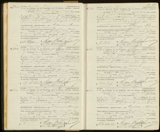 No 7328 Op heden zeventien Juni negentienhonderd een is voor ons Ambtenaar van den burgerlijken stand der gemeente Amsterdam, verschenen: Albertus Fenger van beroep schommakier oud negenendertig jaren, wonende achier, die ons heeft verklaard dat vijftien dezer des na middags te vijf ure in het huis tweede Jan Steenstraat 19 in deze gemeente is geboren een kind van het mannelijk geslacht, uit zijne eihtgenoote Frederika Maria Barbara Bovekampzonder beroep wonende alhier aan welk kind worden gegeven de voornamen van Antonius Francis„ Cus Maria Welke verklaring is geschied in tegenwoordigheid van Hendrik van Beek van beroep ambtnan oud Eenendertig jaren, wonende tiandeamter en van Pieteraan Donsen van beroep ambtnaar oud veertig Jaren, wonende alher En is hiervan opgemaakt deze akte, die door ons, den aangever en de getuigen, na voorlezing is onderteekend. 2 H van Beek Shredle A Lenyer J van Dongen No 7334 12 S.S Op heden achttien Juni negentienhonderd een is voor ons Ambtenaar van den burgerlijken, stand der gemeente Amsterdam, verschenen: Jacob Rok van beroep malenaan oud vijfen dertig jaren, wonende alhier, die ons heeft verklaard dat op heden des voor middags ten vijf ure, in het huis Jacob van Lennepstraat 15 in deze gemeente is geboren een kind van het vauweligtgeslacht, uit zijne cehtin arte uifske Ramminga zonder beroep wonende achier aan welk kind worden gegeven de voornamen van Klaasje Reins Welke verklaring is geschied in tegenwoordigheid van Cendrikaan Beek van beroep ambtinaar oud Eenendertig jaren, wonende te onderantel en van Pieteraan Doujer van beroep ambtinaar oud veertig jaren, wonende alhier En is hiervan opgemaakt deze akte, die door ons, den aangever en de getuigen, na voorlezing is onderteekend. 2 H van Beekpul — J. Irok 3 J Van Donree No. 7338 Op heden zeventien Juni negentienhonderd een is voor ons Ambtenaar van den burgerlijken stand der Cgemeente Amsterdam, verschenen: Gerardus David Verlaan van beroep bubattelaar oud negenentwintig jaren, wonende alhier, die ons heeft verklaard dat op veertien dezer des na middags ten vijf ure, in het huis Potgieterstraat 1 in deze gemeente is geboren een kind van het vauwelijk geslacht, uit zijne echtgenoote Frederiks Barendena Dorothea van den Busken zonder beroep wonende alhier aan welk kind worden gegeven de voornamen van Cornelia Maria Wilhelmina Welke verklaring is geschied in tegenwoordigheid van Hendrikaan Beek van beroep ambtenaar oud eenendertig jaren, wonende tianderdmsten en van Pictrraan Dongen van beroep bmbtinan oud veertig jaren, wonende alhier En is hiervan opgemaakt deze akte, die door ons, den vangever en de getuigen, na voorlezing is onderteekend. H: van Beek Junle G D ilerlaar 3 P Van Dongen No 7336 Op heden achttien Juni negentienhonderd een is voor ons Ambtenaar van den burgerlijken stand der gemeente Amsterdam, verschenen: Satse de Wol van beroep keennaker oud vijftig jaren, wonende alhier, die ons heeft verklaard dat op zeventien dezer des voor middags ten vier ure, in het huis Eerste Witerindwarstraat 29 in deze gemeente is geboren een kind van het mannelijk gesacht, uit zijne echtgenoote Jacobe de Vries zonderberoep wonende alhier aan welk kindwordt gegeven de voornaam van Jacob Welke verkaring is geschied in tegenwoordighed vanHendrikaan Beek van beroep ambtnaar oud Eeenendertig jaren, wonende te onderamstel en van Pieter van Donjer van beroep Ambtaaar oud veertig jaren, wonende achier En is hiervan opgemaakt deze akte, die door ons, den aangever en de getuigen na voorlezing is onderteekend. M. de Holf. 2 H. van BeekJru PJ Van Denrese No 7332 Op heden zeventien Juni negentienhonderd een is voor ons Ambtenaar van den burgerlijken stand der gemeente Amsterdam, verschenen: Nicolaas Rnemeijer van beroep werkman oud achten dertig jaren, wonende achiur, die ons heeft verklaard dat op ventien dezer des voor middags totenen ure in het huis Billamijstraat 140 in deze gemeente is geboren een kind van het vroumeli geslacht, uit zijne echtgenoote Jacoba Barends zonder beroep wonende alhier aan welk kind worden gegeven de voornamen van Johanna Marga retha Welke verklaring is geschied in tegenwoordigheid van Hendrik van Beek van beroep ambtinaar oud Eenendertig jaren, wonende tiandeamtil en van Pietervassonger van beroep ambtwaar oud veertig jaren, wonende alhier En is hiervan opgemaakt deze akte, die door ons, en de getuigen na voorlezing is onderteekend. de aangaver verklaarde piet te keunnen schrijven 2 Hvan ak vcl 3 P van Donm No. 7338 Op heden achttien Junui negentienhonderd een is voor ons Ambtenaar van den burgerlijken stand der gemeente Amsterdam, verschenen: Willem Adrianus de Ridder van beroep peanostemmmer oud zevenentwintig jaren, wonende achier, die ons heeft verklaard dat op hatien dezer des voormiddags ten tienue ik het huis FrediuaHen du k plantroen 12 in deze gemeente is geboren een kind van het vauwelik geslacht, uit zijne eehtgenoate Agatha Maria van Saest zonderbroep wonende alhier aan welk kind worden gegeven de voornamen van Agatha Maria Welke verklaring is geschied in tegenwoordigheid van Henduk van Beel van beroep ambtmaar oud Eenendertig jaren, wonende tander amte en van Pieteraar Dorjen van beroep Ambtinaar oud veertig jaren, wonende alhier En is hiervan opgemaakt deze akte, die door ons den aangever en de getuigen, na voorlezing is onderteekend. WA de Raedden 2 H. ven Beekenile J van Doozen