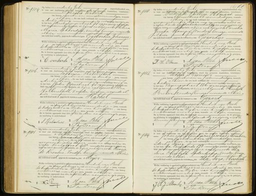 No. 9104 Op heden eenendertig Juli negentienhonderd een is voor ons Ambtenaar vandan burgerlijken wold der gemeente Amsterdam, verschenen Cornelis Verkerk van beroep werkman oud zevenenveertigaren, wonende alhier, die ons heeft verklaard dat op dertig dezer des voormiddags ten negen ur id het huis Rusterburgerstraat 91- in deze gemeente is geboren ge kind van het mannelife geslacht, uit zijne echtgenoote Helena Maria Schoordijk, zonder beroep, wonende alhier aan welk kindworden gegeven de voornamenen Gysbertus, Johannes Welke verkaring is geschieding genoordigheid a Herdrik van Brick van beroep amlhenaar oud eenendertig jaren, wonende te Onder cmstelen van Pieter van Lorgen, van beroep ambtenaaroud veertig jaren, wonende alhier En is hiervan opgemaakt deze akte, die voor ons, den aangeveren de getuigen na voorlezing is onderteekend. C verkerk 2 H. van Beek iile 3 Puugt No. 9110. 603 Op heden eenendertig Juli negentienhonderd een is voor ons Oudteraar van denBurgenijken hand der gemennt Amsterdam, verschenen Frederik Prillem Vitmans. van beroep tooneelknecht oud eenendertig jaren, wonende alhier, die ons heeft verklaard dat op negenentwintig dezer des vanonddags ten zes ure, in het huis Korte Leidschedwarsstraat 194, deze gemeente is geboren een kinge van het mannelijkgeslacht, uit zijne echtgenoote Cornelia Jacoba Kampf, zonder beroep, wonende alhier dan welk kind word gegeven de voornaam van raraus Welke verkaring is geschied in tegenwoordigheid an Hendrik van Beek. van beroep ambtenaar oud eenendertig jaren, wonende te Ander Amstel en van Pieter van Langen, van beroep ambtenaar oud veertig jaren, wonende alhier En is hiervan opgemaakt deze akte, die door ons, den aangever en de getuigen, na voorlezing is onderteekend. mnace 2 H van Beek P: W„ OelmanrSngte No. 9106 4 Op heden eenendertig Juli negentienhonderd een is voor ons Ambtenaar van den burgerlijken staad der gemeente Amsterdam, verschenen: Solsman Hatverstad van beroep werkman oud dertig Jaren, wonende alhier, die ons heeft verklaard dat en dertig dezer des voor middags ten vijf ure, in het huis voden Breestraat 4d. in deze gemeente isgeboren een kind van het kerouwelykgeslacht, uit zijne echtgenoote Sa Hallerstadt, zonder beroep, wonende alhier aan welk kindwordt gegeven de voornaamdan Rachel. Welke verklaring is geschied in tegelvoordigheid van Herdrik van Beek van beroep ambtenaar oud eenendertig jaren, wonende te onder AAmstel en van Pieter van Dongen, van beroep ambtenaaroud veertig jaren, wonende alhier En is hiervan opgemaakt deze akte, dp door ons, den aangeveren de getuigen na voorlezing is onderteekend. Aureli 2H. van Beek S Halsertadt 3 P vn Donsen No. 9112 Op heden eenendertig Juli negentienhonderd een is voor ons Anttenaar van dan burgeriken, stand der, gemeente Amsterdam, verschenen: Petrus ismeijer van beroep werkman oud zevenendertigenen, wonende alhier, die ons heeft verklaard dat op hedenes noamiddags ternegen ure, in het huis Wagenaarstraat 146. in deze gemeente is gboren een kind van het mannelik geslacht, uit zijne echtgenoote Elisabeth Breker, zonder beroep wonende alhier. aan welk kindwordt gegeven de voornaam van Gerard. Welke verklaring is geschied in tegenwoordigheid van Hendrik van Beek van beroep ambtenaar oud eenendertig jaren, wonende te Onderstensselen van Pieter van Longen, van beroep ambtenaarend veertig jaren, wonende alhier en de getuigen, En is hiervan opgemaakt deze akte, die deer ons, na woorleiing is ondertezend, verklarende de aangever niet te kunnen schryven H: van Beek Zucte 3 P van Donvr No 9108 Op heden eenendertig Juli negentignhonderd een is voor ons Ambtenaar van te burgerlijken stand der geteehte Amsterdam, verschenen Nathaniel van Fraag van beroep diamankstipper oud eenendertig jaren, wonende alhier, die ons heeft verklaard dat opnegenentwintig dezer des na middags ten tien ure in het huis kerkstraat 41 an deze gemeente is geboren een kind van het mannelik geslacht, uit zijne echtgenoote Rroosje de Kromme, zonder beroep, wonende alhier aan welkkind vordt gegeven de voornaamvan Meyer Welke verklaring is geschied in tegenwoordigheid van Hendrik van Beek. van beroepmmbtenaar oud eenendertig jaren, wonende te AuderAmstel en van Pieter van Dongen van beroep ambtensdrond veertig jaren, wonende alhter En is hiervan opgemaakt deze akte, die vor oud den aangever en de getuigen na voorlezing is onderteekend. H: van Beek mel 1:J v Vraay 3 P van DorgerJr No. 9114 Op heden eenen dertig Juli negentignhonderd een, is voor oud Ambtenaar van den Brenken stand, der gemeente Amsterdam, verschenen: Johannes Henaricus Jacobus Mombervan beroep boekdiukker oud tweeentwintigaren, wonende alhier, de ons heeft verklaard dat op dertig dezer des voormiddags ten zeven ure, in het huis da lostakade 173 in zeze gemeente is geboren ten kind van het vrouwelyfgeslacht, uit zyne echtgenoote sda Sara Emabeth Sodenkamp, zonder beroep wonende alhier. aan welk kind worden gegeven de voornamen van Sa, sara, Elisabeth. Welke verklaring is geschieding genwoordigheid va Hendrik van Beek van beroep awlteraaroud eenendertig jaren, wonende te bugter Amstelen van Pieter van Longen, van beroep ambtenaar oud veertig jaren, wonende alhier En is hiervan opgemaakt deze akte, die door ons den aangever en de getuigen, na voorlezing is onderteekend. J: H: J: Momber H: van Teek Juste 3 Jvn Dorv