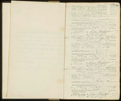 195 in het huis Nassaukade 317 in deze gemeente is geboren een kind van het vrouwelijkgeslacht, uit zijne echtgenoote Maria EElisabeth Fliester zonder beroep wonende alhier aan welk kindwordt gegeven de voornaam van Jacoba- Welke verklaring is geschied in tegenwoordigheid van Cendrik van Beek van beroep ambtnaar oud Veenen dertig jaren, wonende te anderanutie en van Pietervan Dorger van beroep Ombtmaar oud veertig jaren, wonende actiier En is hiervan opgemaakt deze akte, die door ons, den aangever en de getuigen na voorlezing is onderteekend. 2 H van Beeksnicie P.W. de Wit J Van Dirgen 57204 No. 7206 Op heden vijftien Juni negentienhonderd een, is voor ons Ambtenaar van den burgerlijken stand der gemeente Amsterdam, verschenen: Eduard Louis Smits van beroep amblinaar oud drieendertig jaren, wonende achiuel, die ons heeft verklaard dat op dertien dezer des voormiddags ten dul ure, in het huis Bosbom Jousjacutstraat 61 in deze gemeente is geboren eer kind van het mannelijk geslacht, uit zijne echtgenoote Cornelia Molijn zonder beroep wonende Jal hier Cornelis aan welk kind wordt gegeven de voornaam van Welke verklaring is geschied in tegenwoordigheid van enstrik van Beek van beroep ambtmaar oud Eenen dertig jaren, wonende teander anutel en van PieterwanD ingen van beroep ambtnaar oud veertig jaren, wonende achier En is hiervan opgemaakt deze akte, die door ons,den aangever en de getuigen na voorlezing is onderteekend. 2 H van Beekmee 1 CP Smits. J Van Dingers Op heden uittien zuni negentienhonderd een is voor ons Ambtenaar van den burgerlijken stand der gemeente Amsterdam, verschenen: Pieter Wilhelm van der Mart van beroep likeurstaker oud negenentwintig jaren, wonende alhier, die ons heeft verklaard dat op veertien dezer des voormiddags ten vier ure, in het huis Bilderdijkkade oro in deze gemeente is geboren een kind van het mannelijk geslacht, uit zijne echtgenoote Mengsje Müller zonderbaays wonende alhier aan welk kindworden gegeven de voornamen van Pieter Wilhelm Welke verklaring is geschied in tegenwoordigheid van Hendrik van Beek van beroep ambtinam oud Eenendertig jaren, wonende tiande amstel en van Pieter van Dongen van beroep Ambtinaar oud venti Jaren, wonende alhier En is hiervan opgemaakt deze akte, die door ons den aangever en de getuigen na voorlezing is onderteekend. J P:W. v/d Mark 2 H vvan Betepen M 3 J Van Dornens