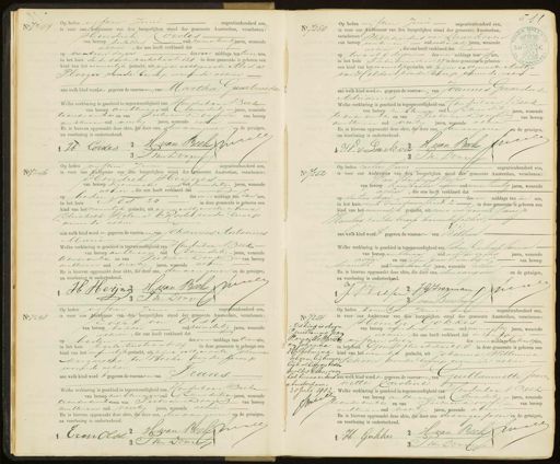 No 7244 Op heden vijftien Juni negentienhonderd een is voor ons Ambtenaar van den burgerlijken stand der gemeente Amsterdam, verschenen: Hendrik ordes van beroep bestellen oud zeven en twinti jaren, wonende alhier, die ons heeft verklaard dat op ventien dezer des voor middags ten twee ure, in het huis derde Oosterparkstroat 121 in deze gemeente is geboren eer kind van het vrouwelijk geslacht, uit zijne echtgenoote Alida Ploeger zonder beroep wonende alhier aan welk kind worden gegeven de voornamen van Martha Juurtruida Welke verklaring is geschied in tegenwoordigheid van Hendukaar Bees van beroep ambtinari oud Geenendertig jaren, wonende lianderauntie en van Pieterou D oner van beroep ambtenaar oud veertig jaren, wonende actien En is hiervan opgemaakt deze akte, die door ons, den aangever en de getuigen, na voorlezing is onderteekend. H: Lordes 2 H van Beek mule J van Den No. 7259 5 IS Op heden vijftien Juni negentienhonderd een, is voor ons Ambtenaar van den burgerlijken stand der gemeente Amsterdam, 15 117½ versehenen: Willebrordus van Laarhoven van beroep werkman oud acht en dertig Jaren, wonendeu /1 altiier, die ons heeft verklaard dat op twaalf dezer des na middags ten vijf ure, in het huis Koeliedwarsstraat 27 in deze gemeente is geboren 10 uni een kind van het mannelikgeslacht, uit zijne echtgenoote Kaltje van Helder zonder beroep wonende alhier aan welk kind worden gegeven de voornamen van Joannes Gerardus Adrianus Welke verklaring is geschied in tegenwoordigheid van Cendukour Beek van beroep Ambtenamr oud Renerdatig — jaren, wonende te ouderkmtel en van Pietwaar Donjer van beroep ambtnaar oud veertig jaren, wonende alhier En is hiervan opgemaakt deze akte, die door ons, den aangever en de getuigen na voorlezing is onderteekend. Wil 2 H. van Beek &W. v. Laa rKorn 3 J van Donger No 7246 Op heden vyftien Juni negentienhonderd een is voor ons Ambtenaar van den burgerlijken stand der (gemeente Amsterdam, verschenen: Hendrik Heijnes van beroep sigarenmaker oud Eenendertig jaren, wonende alhier, die ons heeft verklaard dat op heden des voormiddags ten Een ure, in het huis Jls29 in deze gemeente is geboren een kind van het mannelijk geslacht, uit zijne echtenoole Arma Elisabeth Helena Rode zonder beroep wonende, alhier aan welk kind word en gegeven de voornamen van Johannes Antonius Marie Welke verklaring is geschied in tegenwoordigheid van Hendrikar Beek van beroep ambtnaar oud EEenendertig jaren, wonende te anderamtee en van Pietervan Dongen van beroep ambtinaar oud veertig jaren, wonende alhier En is hiervan opgemaakt deze akte, die door ons, den aangever en de getuigen na voorlezing is onderteekend. H. Heijne H van Beek muei 3 S. van Donge No 7252 Op heden zestien eeno negentienhonderd een is voor ons Ambtenaar van den burgerlijken stand er gemeente Amsterdam, verschenen: JJan Theodorus Visser van beroep troodbakker oud zeven en twintig jaren, wonende alhier, die ons heeft verklaard dat op dertien dezer des na middags ten een ure, in het huiseerte Tuindaarsstraat in deze gemeente is geboren een kind van het mannelijk gesacht, uit zijne echtgenoote Jansje Ramlag zonder beroep wonende alhier aan welk kindvordt gegeven de voornaam van Willem. Welke verklaring is geschied in tegenwoordigheid van Johan Gerhard serman van beroep ambtenaar oud achten vijftig jaren, wonende alhier en van Johan van Beresteijn van beroep beambte ou zevenentwintig jaren, wonende alhier En is hiervan opgemaakt deze akte, die dóór ons, den aangever en de getuigen, na voorlezing is onderteekend. mie JVVisse & JBerman JJ. van Beresteijn No 7248 Op heden vijftien Juni negentienhonderd een, is voor ons Ambtenaar van den burgerlijken stand der gemeente Amsterdam, verschenen: vert van Olst van beroep bakker oud zesendertig jaren, wonende alhier, die ons heeft verklaard dat op heden des voor middags ten tien ure, in het huis Egelantierstraat in deze gemeente is geboren een kind van het minnelijk geslacht, uit zijne echtenoote Johanna Margaretha ter Beeke zonder beroep wonende alhier aan welk kind wordt gegeven de voornaam van JansWelke verklaring is geschied in tegenwoordigheid van Gendrik van Reek van beroep ambtinaar oud Eenendertig jaren, wonende teanderdmite en van Pectervan Donzer van beroep Ambtenaar oud veertig jaren, wonende alhier En is hiervan opgemaakt deze akte, die door ons, den aangener en de getuigen ua voorlezing is onderteekend. H van Beek mrie brenElst J van Dourte No 7254. „ Dit kind is door Guillauwe kas Rorpeille Opriëek en Johanna in Wilhelmina schoen, bij huwe lijk alhier op heden voltrokken, voor het hunne erkend 3a Amsterdam, 30 Juli 1902, W. Apbn NU. Op heden zeventien Juni negentienhonderd een, is voor ons Ambtenaar van den burgerlijken stand der gemeente Amsterdam, verschenen; Heintje Gokkes toon van beroep voedernuw oud vierenvijftig jaren, wonende aan alhier, die ons heeft verklaard dat in haarbijzijn rel vijftien dezer des middags ten twaalf ure, in het huis Govertflinckstraat 158 in deze gemeente is geboren een kind van het vrouwelijk geslacht, uit Johanna Willemina eschoen zonder beroep wonende alhier leden voor va aan welk kind worden gegeven de voornaeme van Guillanmette Jean nette Caroline 2. Welke verklaring is geschied in tegenwoordigheid van Jondrikaris& Seek van beroep ambtinani oud Eenendertig jaren, wonende leoudenamtel en van PicterauDoncen van beroep ambtenaar oud veertig jaren, wonende alhier En is hiervan opgemaakt deze akte, de door ons de aangeefster en de getuigen, na voorlezing is onderteekend. 2. H. van Beek Junie H Gakker J van Doron