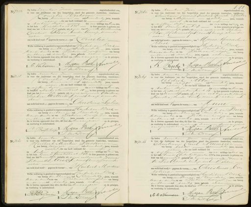 No 7256 Op heden Zeventien Juni negentienhonderd een is voor ons Ambtenaar van den burgerlijken stand der gemeente Amsterdam, verschenen: ornelis Verboom van beroep timmerman oud tweeentwintig jaren, wonende alhier, die ons heeft verklaard dat op zestien dezer des nu middags ten twee ure, in het huis Riuterstraat 138 in deze gemeente is geboren een kind van het vramwelijk geslacht, uit zijne echtgenoote Willemina Carolma Kloor vonder beroep wonende alhier aan welk kind wordgegeven de voornaam van Cornelia Welke verklaring is geschied in tegenwoordigheid van Hindrik van Beek van beroep ambtman oud Vienendertig jaren, wonende tianden knute en van Pieteraam Dongen van beroep Ambtnaar oud veertig Jaren, wonende alhier En is hiervan opgemaakt deze akte, die door ons, den aangavier en de getuigen, na voorlezing is onderteekend. C: Verboom 2 H van Beek mene 3 S Van Donree No. 7262 Op heden Zeventien Juni negentienhonderd een, is voor ons Ambtenaar van den burgerlijken stand der gemeente Amsterdam, verschenen Christian Ponrad Friedrich Heinrich Reuter van beroep Missimair oud veertig jaren, wonende actiul, die ons heeft verklaard dat op vijftien dezer des na middags ten negen ure, in het huis Binnenkast3 in deze gemeente is geboren een kind van het vrouwelijk geslacht, uit zijne echtiroote saphie Elise Huemmelijen zonder beroep wonende alhier aan welk kind worden gegeven de voornamen van Maria Konradine Elise Welke verklaring is geschied in tegenwoordigheid van Hendrik van Heek van beroep ambtinaar oud Eenendertig jaren, wonende tionder anutie en van Pieter van Donger van beroep ambtwaar oud veertig jaren, wonende alhier. En is hiervan opgemaakt deze akte, die door ons, den aangever en de getuigen na voorlezing is onderteekend. K. Reute H van Beek Smide 3 Van D Ongen No 7258 Op heden zeventien Juni negentienhonderd een is voor ons Ambtenaar van den burgerlijken stand der gemeente Amsterdam, verschenen. Cornelis Buijtenhuijs van beroep timmerman oud zesendertig jaren, wonende alhier, die ons heeft verklaard dat op vijftien dezer des voorkiddags ten twee ure, in het huis Nieuwe Nieuwstraat 10 in deze gemeente is geboren een kind van het vauwelijk geslacht, uit zijne eehtgenoote Christina Sophia Wetterling zonder beroep wonende alhier aan welk kind zord en gegeven de voornamen van Christina Sophia Welke verkaring is geschied in tegenwoordigheid van Hendrik van Beek van beroep ambtmaar oud Eenendertig jaren, wonende teander amtie en van Pieter van Dongen van beroep Ambtmaar oud veertig Jaren, wonende alhier En is hiervan opgemaakt deze akte, die door ons, den aangaier en de getuigen, na voorlezing is onderteekend. K Buiterhuryd H van Beek muet 3 D No 7214 Op heden zeventien Juni negentienhonderd een is voor ons Ambtenaar van den burgerlijken stand der gemeente Amsterdam, verschenen: Aldrik Alta van beroep schipper oud zevenendertig jaren, wonende achiier, die ons heeft verklaard dat op zertien deser des voor middags ten tuil ure, in het huis Kattenburger Kruisstrraat in deze gemeente is geboren een kind van het mannelijk geslacht, ut zijne echtgenoote Boukje Feenstra zonder beroep wonende alhier aan welk kind word gegeven de voornaam van Mnne Welke verkaring is geschied in tegenwoordigheid van Censtrik van Beek van beroep Ambtinaar oud zenendertig jaren, wonende te auderamtel en van Pieteraun Donjer van beroep ambtmaar oud veertig jaren, wonende alhier En is hiervan opgemaakt deze akte, die door ons, en de getuigen na voorlezing is onderteekend. verklaringe de aannoer igens een gehek aan zijn peesterkond niet te kennenocttiven 2 H van Velk Meeld J: van Donrees No 7260 Op heden zeventien Juni negentignhonderd een, is voor ons Ambtenaar van den burgerlijken stand der gemeente Amsterdam, verschenen: Huibert Martin Passenier (van beroep reiziger oud drieentwintig jaren, wonende alhuis, die ons heeft verklaard dat op heden des voor middags ten Een ure, in het huis Gover linekstraat 172 in deze gemeente is geboren een kind van het mannelijk geslacht, uit zijne echtgenoote Joanna Petronella Wickel zonder beroep wonende alhier van vdekkkind zodden gegevende vooromen va Huibert Martin Welke verklaring is geschied in tegenwoordigheid van Hendrik van Jech van beroep ambtinarn oud VEenendertig jaren, wonende teanderamtie en van Pieterau Dongen van beroep ambtenaar o8 veertig jaren, wonende alhier En is hiervan opgemaakt deze akte, die door ons, den vangever en de getuigen ua voorlezing is onderteekend. H Passenin Hven Beekmacte 3 J van Dorve No 72 66 Op heden zeventien Juni negentienhonderd een, is voor ons Ambtenaar van den burgerlijken stand der gemeente Amsterdam, verschenen: Christiaan Carel Neumeier van beroep bakker oud zevenendertig jaren, wonende achier, die ons heeft verklaard dat op vijftien dezer des na middags ten zes ure, in het hurs tweede (ontantijnHuijgerstraat, N in deze gemeente is geboren een kind van het vauwelijk geslacht, uit zijne eehtgenoote Janna te Poel zonder beroep wonende achier aan welk kind worden gegeven de voornamen van Christina Ca rolina Welke verklaring is geschied in tegenwoordigheid van Hendrik van Beck van beroep ambtenaar, oud Eenendertig jaren, wonende tiende ambe en van Joetuam Donger van beroep ambtnaar oud veertig jaren, wonende alhier En is hiervan opgemaakt deze akte, die door ons den vangever op de getuigen, na voorlezing is onderteekend. 1 C: C: Neumerie2 H van Belher J van Dortgen