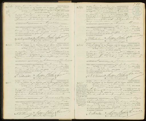 No 7248 Op heden zeventien Juni negentienhonderd een is voor ons Ambtenaar van den burgerlijken stand der gemeente Amsterdam, verschenen: Johannes de Coeg van Oelwinen van beroep werkman oud drieentwitig jaren, wonende alhier, die ons heeft verklaard dat op veertien dezer des na middags ten Een ure, in het huis Polanenstraat 39 in deze gemeente is geboren een kind van het wamdelijkgeslacht, uit zijne echtgenoote Anna Peters zonder beroep wonende alhier aan welk kindwordt gegeven de voornaam van Agatha- Welke verklaring is geschied in tegenwoordigheid van Cendut van Beek van beroep ambtinarig oud Eenendertig jaren, wonende te anderamtie en van Picteram D onder van beroep Ambtinaanoud veertig jaren, wonende achien En is hiervan opgemaakt deze akte, die door ons, den vangener en de getuigen, na voorlezing is onderteekend. H van Beek vaaele J. de Coeq van Delwijnen J Van Domeg No 7274 7 Op heden zeven tien turi negentienhonderd een, is voor ons Ambtenaar van den burgerlijken stand der gemeente Amsterdam verschenen: Johannes Petrus Heukeshoven van beroep kantoorbediende oud Eenendertig jaren, wonende 5 alhier, die ons heeft verklaard dat op veertien dezer des voormiddags ten Elfte, 315 2445 in het huis Leidschekade 59 in deze gemeente is geboren een kind van het vouwwelijkgeslacht, uit zijne eehtgenoote Maria Hermanna Elisabert Rupertzonder be„ roep wonende alhier van dek kid vard en gegoeven de voorhun gen Anna Maria Welke verklaring is geschied in tegenwoordigheid van Hendrik van Beek van beroep ambtnarr oud Eenendertig jaren, wonende tianderante en van Pieterman Dongen van beroep ambtnaar oud veertig jaren, wonende alhier En is hiervan opgemaakt deze akte, die door ons, den aangever en de getuigen na voorlezing is onderteekend. JJ Heukerhoren Hven Beek Smice J Van Dorgen No 7270 Op heden Zeventien Juni negentienhonderd een, is voor ons Ambtenaar van den burgerlijken stand der gemeente Amsterdam, verschenen: Pieter Ditmeijer. van beroep metsclaar ouddertig jaren, wonende achie, die ons heeft verklaard dat op vijftien dezer des voormiddags ten due ure, in het huis Laurienkadt 10 in deze gemeente is geboren een kind van het mannelik geslacht, uit zijne echtgenoote Elisabeth atharina Sproet zonder beroep wonende alhier aan welk kindworden gegeven devoorsma ven Johannes Hendricus Welke verklaring is geschied in tegenwoordigheid van Hendrik van Beek van beroep ambtwaar oud Eenendertig jaren, wonende teanden amtie en van Pieteran Loren van beroep ambtenvor oud veertig jaren, wonende alhier En is hiervan opgemaakt deze akte, die door ons, den aangever en de getuigen, na voorlezing is onderteekend. 2 H van Beek ol C: Ditmeyer J. van Done No 7276