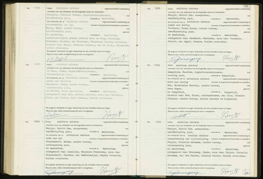 No. 1096. Heden zeventien oktober negentienhonderd tweeënzestig verscheen voor mij, ambtenaar van de burgerlijke stand van Amsterdam: Hartgers, Johannes Herman, begrafenisondernemer, oud drieenzestig jaar, wonende te Amsterdam, die verklaarde, dat op vijftien oktober negentienhonderd tweeënzestig te eenentwintig uur nul minuten, in de gemeente Amsterdam is overleden: Knaap, Sara, zonder beroep, oud drieentachtig jaar, geboren te Amsterdam, wonende te Amsterdam, achtereenvolgens gehuwd geweest met: de Jong, Frederik; Kruisman, Jacobus, en: Kruisman, Hendricus Jacobus Albertus, dochter van: Knaap, Johannes Jacobus, en: de Rooij, Elisabeth; beiden overleden. De aangever verklaarde uit eigen wetenschap van het overlijden kennis te dragen. Waarvan akte, welke overeénkomstig de wet is voorgelezen. Jaantjr J H. Hagef No. 1099 Heden achttien oktober negentienhonderd tweeënzestig verscheen voor mij, ambtenaar van de burgerlijke stand van Amsterdam: Meijer, Gerrit Jan, aanspreker, oud tweeënvijftig jaar, wonende te Amsterdam, die verklaarde, dat op zeventien oktober negentienhonderd tweeënzestig te negen uur dertig minuten, in de gemeente Amsterdam is overleden Voorhaar, Frans Lucas, zonder beroep, oud tweeënzeventig jaar, geboren te Amsterdam, wonende te Amsterdam, echtgenoot van: Berkhout, Hendrika, zoon van: Voorhaar, Gerrit, en: Appel, Gesina, beiden overleden. De aangever verklaarde uit eigen wetenschap van het overlijden kennis te dragen. Waarvan akte, welke overeenkomstig de wet is voorgelezen. aant Gmeejiy No. 1097 Heden achttien oktober negentienhonderd tweeënzestig verscheen voor mij, ambtenaar van de burgerlijke stand van Amsterdam: de Haan, Jouke, begrafehisondernemer, oud vierenvijftig jaar, wonende te Amsterdam, die verklaarde, dat op zeventien oktober negentienhonderd tweeënzestig te zeven uur vijftien minuten, in de gemeente Amsterdam is overleden: Kuhlmann, Johan, zonder beroep, oud achtenzestig jaar, geboren, te Sloten, thans Amsterdam, wonende te Amsterdam, echtgenoot van: Bos, Grietje Alberta, zoon van: Kuhlmann, Paul, en: Geurts, Aria Johanna, beiden overleden. De aangever verklaarde uit eigen wetenschap van het overlijden kennis te dragen. Waarvan akte, welke overeenkomstig de wet is voorgelezen. JaanJ Jaeften No. 1100 Heden achttien oktober negentienhonderd tweeënzestig verscheen voor mij, ambtenaar van de burgerlijke stand van Amsterdam: Langedijk, Maarten, begrafenisondernemer, oud veertig jaar, wonende te Langedijk, die verklaarde, dat op zeventien oktober negentienhonderd tweeënzestig te drie uur dertig minuten, in de gemeente Amsterdam is overleden: Bak, Wilhelmina Maartje, zonder beroep, oud twee dagen, geboren; te Langedijk, wonende te Langedijk, dochter van: Bak, Klaas, scheepsbouwer, en: Glas, Hermine Johanne, zonder beroep, beiden wonende te Langedijk. De aangever verklaarde uit eigen wetenschap van het overlijden kennis te dragen. Waarvan akte, welke overeenkomstig de wet is voorgelezen. J Vevante No. 1098 Heden achttien oktober negentienhonderd tweeënzestig verscheen voor mij, ambtenaar van de burgerlijke stand van Amsterdam: Meijer, Gerrit Jan, aanspreker, oud tweeënvijftig jaar, wonende te Amsterdam, die verklaarde, dat op zeventien oktober negentienhonderd tweeënzestig te acht uur nul minuten, in de gemeente Amsterdam is overleden Nieuwenhoff, Abram, zonder beroep, oud achtenzestig jaar, geboren; te Amsterdam, wonende te Amsterdam, echtgenoot van: Achilles, Theodora Frederika, zoon van: Nieuwenhoff, Jacobus, en: Hubbelmeijer, Sophia Cornelia, beiden overleden. De aangever verklaarde uit eigen wetenschap van het overlijden kennis te dragen. Waarvan akte, welke overeenkomstig de wet is voorgelezen. Krantz neyen No. 1101 Heden achttien oktober negentienhonderd tweeënzestig verscheen voor mij, ambtenaar van de burgerlijke stand van Amsterdam: Meijer, Gerrit Jan, aanspreker, oud tweeënvijftig jaar, wonende te Amsterdam, die verklaarde, dat op zestien oktober negentienhonderd tweeënzestig te eenentwintig uur vijfenvijftig minuten, in de gemeente Amsterdam is overleden: Cuijon, Cornelis Abraham, zonder beroep, oud vierenzestig jaar, geboren wonende te Amsterdam, te Amsterdam, echtgenoot van: Kruisweg, Janke, zoon van: Cuijon, Cornelis Abraham, en: van Keulen, Jansina Jacoba, beiden overleden. De aangever verklaarde uit eigen wetenschap van het overlijden kennis te dragen. Waarvan akte, welke overeenkomstig de wet is voorgelezen. Baant Ineging