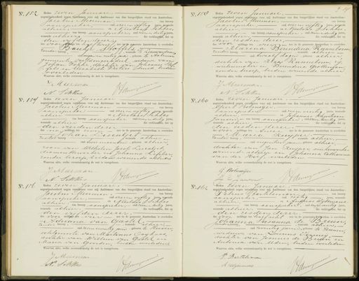 No. 152 Heden zeven Januari, negentienhonderd negen verschenen voor mij Ambtenaar van den burgerlijken stand van Amsterdam Jacobus Meerman, van beroep aanspreker, oud vier en vijftig jaren, wonende alhier, en Nicolaas Sikkes, van beroep aanspreker, oud zevenendertig jaren wonende alhier die verklaarden, dat op den vyfden dezer des voor valags ten half twaalf ure, in de gemeente Amsterdam is overleden Baukje Stoffels, zonder beroep, wonende te Leeuwarden oud negen en zestig jaren, geboren te Aalzum gemeente Oortdongeradeel weduwe van Johan Fokke dochter van Johannes Slof „sels en Elisabeth Pieters Smid, beiden overleden. Waarvan akte, welke overeenkomstig de wet is voorgelezen. J Meerman Adommgen N. Sihtes No. 158 Heden zeven Januari, negentienhonderd negen verschenen voor mij Ambtenaar van den burgerlijken stand van Amsterdam: Jacobus Meerman, van beroep aanspreker oud vier en vijftig jaren, wonende alhier en Nicolaas Sikkes van beroep aanspreker, oud zeven en dertig jaren wonende alhier, die verklaarden, dat op den zesden dezer, des voor middags ten vier ure in de gemeente Amsterdam is overleden Klazina Berendina Runneboom zonder beroep, wonende alhier oud twaalf dagen, geboren alhier dochter van Klaas Runneboom, rij„ wielenmaker en Berendina Grolleman zonder beroep, beiden wonende alhier Waarvan akte, welke overeenkomstig de wet is voorgelezen. J Mierman. Ademijneur N. Schken No. 154 Heden zeven Januari negentijenhonderd negen verschenen voor mij Ambtenaar van den burgerlijken stand van Amsterdam, Jacobus Meerman van beroep aanspreker oud vier en vijftig jaren, wonende alhier en Nicolaas Sikkes van beroep aanspreker oud zevenendertig jaren wonende alhier die verklaarden, dat op den vierden dezer des na middags ten zeven ure in de gemeente Amsterdam is overleden ohan Liscalje wonende alhier zonder beroep oud twee maanden, geboren alhier zoon van Wilhelm Jacob Liscaljet diamantbewerker en Johanna Lefeber zonder beroep, beiden wonende alhier Waarvan akte, welke overeenkomstig de wet is voorgelezen. JeHierman Ademigmeenen N. Sikter No. 160 Heden zeven Januari, negentienhonderd negen verschenen voor mij Ambtenaar van den burgerlijken stand van Amsterdam: Geert Bolmeijer, van beroep aanspreker, oud zes en veertig jaren, wonende alhier, en Johannes Christiaan Jansen, van beroep aanspreker, oud vier en twintig Jaren wonende alhier die verklaarden, dat of den zesden dezer. des voor middags ten Auler ure in de gemeente Amsterdam is overleden Maria Kuijper zander beroep wonende alhier, oud negentien jaren, geboren alhier, dochter van Jan Kuijper, suikerwerker wonende alhier en Johanna Catharina van der Hoef, overleden. Waarvan akte, welke overeenkomstig de wet is voorgelezen. G Bolmeijer Ademijn J C Jansen No. 156 Heden zeven Januari negentienhonderd negen verschenen voor mij Ambtenaar van den burgerlijken stand van Amsterdam, Jacobus Meerman, van beroep aanspreker, oud vier en vijftig jaren, wonende en Nieoldas Sikkes alhier van beroep aanspreker oud zevenendertig jaren wonende alhier, die verklaarden, dat of den vyjfden dezer des voor middags den vier ure in de gemeente Amsterdam is overleden Adriana van Gastel zonder beroep, wonende alhier, oud zes en zeventig jaren, geboren te Hoeven echtgenoote van Martinus Ooijkaas, dochter van Willem van Gastel en Maria van Goorden, beiden overleden. Waarvan akte, welke overeenkomstig de wet is voorgelezen. J Muiman Jdoet N:o Sinkes No. 162 Heden zeven Januari negentienhonderd negen verschenen voor mij Ambtenaar van den burgerlijken stand van Amsterdam: Petrus Bartelsman, van beroep aanspreker, oud zestig jaren, wonende alhier en Andrias Wijdemant van beroep aanspreker, oud eenen veertig jaren wonende alhier, de verklaarden, dat op den zesden, dezer des voor middags ten half acht ure in de gemeente Amsterdam is overleden Johanna Susanna de Bruin, zonder beroep, wonende alhier. oud zeventig jaren, geboren te Drunen weduwe van Lourens Vermey dochter van Joannes de Bruin en Antonia van Mden, beiden overleden Waarvan akte, welke overeenkomstig de wet is voorgelezen. P Bartelsma Adem A Wijdemans.