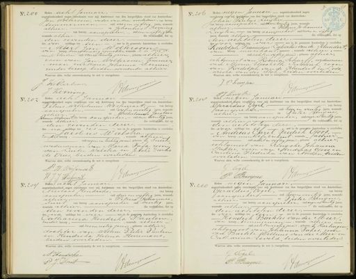 No. 200 Heden acht Januari negentienhonderd negen (verschenen voor mij Ambtenaar van den burgerlijken stand van Amsterdam Jan Woltersom, vader van den overledene, van beroep timmerman, oud vier en vijftig, Jaren, wonende alhier, en Johannes Kooning van beroep aanspreker, oud een en vijftig Garen wonende alhier, die verklaarden, dat of den zevenden dezer. des voor middags ten ttien ure in de gemeente Amsterdam is overleden Albert Jan Woltersom van beroep bouwkundig opzichter, wonende te de steeg ge „meent Rheden oud vier en twintig jaren, geboren alhier zoon van Jan Woltersom fimmer, „man en Maria Johanna Leinen, zonder beroep, beiden wonende alhier. Waarvan akte, welke overeenkomstig de wet is voorgelezen. Woltersom Ademagen J Koom No. 20 C 4 Heden negen Januari negentienhonderd negen verschenen voor mij Ambtenaar van den burgerlijken stand van Amsterdam: 1 50½ Johan Saulus Luijten van beroep aanspreker, oud vierentwintig jaren, wonende alhier en Petrus Johannes 2 Luiten, van beroep aanspreker oud zeven en vijftig Jaren, wonende alhier die verklaariten, dat op den achtsten dezer, des voor middags ten vier ure in de gemeente Amsterdam is overleden Roedolph Franciscus Lubertus van de Klundert, van beroep muzikant,, wonende alhier oud achten vijftig jaren, geboren alhier, echtgenoot van Rosina Scharff, weduwnaar van Maria Elisabeth Inbrink zoon van Roedolph van de Klundert en Lodo„ „wieska van der Stok, beiden overleden Waarvan akte, welke overeenkomstig de wet is voorgelezen. J P Luysen Ademyjneu No. 202 Heden acht Januari negentienhonderd negen vergekenen voor mij Ambtenaar van den burgerlijken stand van Amsterdam Petrus Wilhelmus Arssenract, van beroep vanspieker, oud vijfenveertig jaren, wonende alhier, en Wilhelmus Jacobus Johannes Wissenract van beroep aanspreker, oud een en twintig jaren wonende dlhier, die verklaarden, dat op den zevenden dezer, des na middags ten zes ure in de gemeente Amsterdam is overleden Jacobus Walstra zonder beroep, wonende alhier. oud negen en tachtig jaren, geboren te Sneek weduwnaar van Maria Fafa zoon van Luitze Walstra en Jetske Durks de Vries, beiden overleden. Waarvan akte, welke overeenkomstig de wet is voorgelezen. Adeno P: W: Wissemaet W.J J. Wissenraat No. 208 PJ. Luyter Heden negen Januari¬ negentienhonderd negen verschenen voor mij Ambtenaar van den burgerlijken stand van Amsterdam: Gerardus Vogel van beroep aanspreker, oud twee en veertig jaren, wonende alhier, en Pieter Buyne van beroep aanspreker, oud negen en twintig jaren wonende alhier de verklaarden, dat op den achtsien dezer des voor middags ten elf ure in de gemeente Amsterdam is overleden — Andreas Garel Fredrik Goos, van beroep meubelfabrikant, wonende alhier. oud acht en vijftig jaren, geboren alhier echtgenoot van Kingske Johanna Staller, zoon van Andreas Goos en Carolina Fredrika van Norden beiden overleden. Waarvan akte, welke overeenkomstig de wet is voorgelezen. G Vogel Ademg P: Bruyne No. 201 Heden acht Januari, negentienhonderd negen verschenen voor mij Ambtenaar van den burgerlijken stand van Amsterdam Nicolaas Hendriks, van beroep aanspreker, oud drie en vijftig jaren, wonende alhier en Petrus Johannes Smit van beroep aanspreker oud veertig jaren wonende alhier, die verklaarden, dat op den zevenden dezer, des nia middags ten vier ure in de gemeente Amsterdam is overleden Catharina Hendrika Paulen- zander beroep,, wonende alhier oud zes en zestig jaren, geboren alhier dochter van Willem Pieter Paulen en Hendrika Helena Heeremans, beiden overleden. Waarvan akte, welke overeenkomstig de wet is voorgelezen. N. Hendriks Jdamet P. J. Smit No. 210 Heden negen Januari, negentienhonderd negen verschenen voor mij Ambtenaar van den burgerlijken stand van Amsterdam, Gerardus, Vogel, van beroep aanspreker oud tweeenveertig jaren, wonende alhier, en Pieter Bruyne, van beroep aanspreker, oud negenentwintig jaren wonende alhier, die verklaarden, dat op den achtsten dezer des voor middags ten vtien ure in de gemeente Amsterdam is overleden Hendrik Barteles van der Meer„ van beroep timmerman wonende alhier oud achtenzestig jaren, geboren te Harlingen echtgenoot van Johanna Takes, zoon van Bartele Willems van der Meer en Catharina Esveld beiden overleden Waarvan akte, welke overeenkomstig de wet is voorgelezen. G. Sogel. Idim P. Bruyne