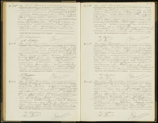 No. 248 Heden elf Januari, negentienhonderd negen verschenen voor mij Ambtenaar van den burgerlijken stand van Amsterdam Jacobus Meerman, van beroep aanspreker, oud vier en vijftig jaren, wonende alhier en Nicolaas Sikkes van beroep aanspreker, oud zeven endertig jaren wonende alhier, die verklaarden, dat op len achtsten dezer des na Giddags ten vierr ure in de gemeente Amsterdam is overleden Hendrika Hartman wonende alhier zonder beroep oud zes weken, geboren alhier dochter van Wilhelmina Maria Hartman, dienstbode, wonende alhier. Waarvan akte, welke overeenkomstig de wet is voorgelezen. Jden J Mierman N. Sikker No. 254 K. 22 Heden elf Januari negentienhonderd negen verschenen voor mij Ambtenaar van den burgerlijken stand van Amsterdam: Willem Rijkers, van beroep beambte, oud drie en veertig jaren, wonende alhier, ep Franciscus Leeners van beroep beambte oud tweeen dertig jaren wonende alhier, die verklaarden, dat of - heden. des voor middags ten vijf ure in de gemeente Amsterdam is overleden ogelina Komyn zonder beroep wonende alhier. oud zeven maanden, geboren alhier dochter van Valk Romin, diamant„ „ versteller en Matje Naarden, zonder beroep, beiden wonende alhier. Waarvan akte, welke overeenkomstig de wet is voorgelezen. W Rijkers Adomien J Siner No. 258 Heden elf Januari negentienhonderd negen verschenen voor mij Ambtenaar van den burgerlijken stand van Amsterdam Johannes Huijzer, van beroep aanspieker, oud vierendertig jaren, wonende alhier en Christiaan Bijvoet, -van beroep aanspreker, oud een en dertig jaren wonende alhier, die verklaarden, dat op den negenden dezer. des voor middags ten drie ure in de gemeente Amsterdam is overleden Petrus Cornelis Rok wonende alhier, vander beer, oud twee jaren, geboren alhier zoon van Gerardus Kok melkslijter en Wilhelmina Johanna Nieuwendijk zonder beroep, beiden wonende al hier. Waarvan akte, welke overeenkomstig de wet is voorgelezen. J. Huijzer Ademegna CBijvoek No. 256 Heden elf Januari negentienhonderd negen verschenen voor mij Ambtenaar van den burgerlijken stand van Amsterdam: Willem Rijkers, van beroep beambte oud drie en veertig jaren, wonende alhier en Franciscus Leeners van beroep beambte oud tweeen dertig jaren wonende alhier die verklaarden, dat op