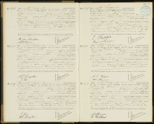No. 6103 Heden acht September negentienhonderd vif zijn voor ons Ambtenaar van den burgerlijken stand der gemeente Amsterdam, verschenen: Coenraad van Houten, van beroep portier, oud negen en dertig jaren, wonende alhier en Petrus Johannes Napoleon Vennix, van beroep portier oud drieenzestig jaren die ons hebben verklaard, dat op wonende alhier ten zesden dezer des voor middags ten zes ure in de gemeente Amsterdam is overleden Johanna Wilhelmina Antonia van Teelen van beroep dienstbode, wonende alhier, is beval len van een oud kind dat zij als, geboren levenloos aangeven En is hiervan opgemaakt deze akte, die na voorlezing door de aangevers en ons is onderteekend, tevens goedkeurende de doorhaling van vier gedrukte woorden C Ce. van Houten P JV Vennu No. 6109 U0 10