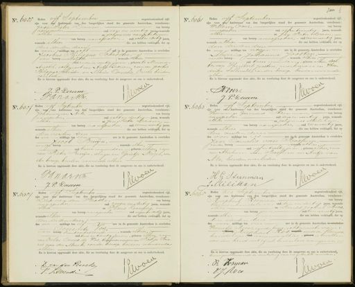 No. 6055 Heden vijf September negentienhonderd vijf zijn voor ons Ambtenaar van den burgerlijken stand der gemeente Amsterdam, verschenen: Jan Pieter Taam, van beroep aanstrieker oud een en veertig jaren, wonende alhier en Johannes van Art, van beroep annsrieker oud acht en dertig jaren, wonende alhier die ons hebben verklaard, dat op den derden dezer des voor middags ten acht ue in de gemeente Amsterdam is overleden Jacobus Philippus Schroder van beroep melkslijker, wonende alhier, oud zeven en veertig jaren, geboren te Nieuwer- Amstel, echtgenoot van Antje Loenen, zoon van Jacobus Philippus Schröder, en Maria Cornelia Evers, beiden overleden. En is hiervan opgemaakt deze akte, die na voorlezing door de aangevers en ons is onderteekend. J. P. Daum Janarkn No. 6061 Juir Heden vijf September negentienhonderd zin zijn voor eng Ambtenaar van den burgerlijken stand der gemeente Amsterdam, verschenen: Willem Over, van beroep aanspreker, oud vijfen twintig Jaren, wonende alhier en Jan Pieter Daam, van beroep aanspreker, oud eenen veertig jaren wonende alhier die ons hebben verklaard, dat op den derden dezer des nn middags ten negen ure in de gemeente Amsterdam is overleden Maria Johanna Joosten zonder beroep, wonende alhier oud twee maanding, geboren alhier, doch ter van Huibert Jooeten, werkman en Hen„ drika Solleveld, zonder beroep, beiden wonende alhier En is hiervan opgemaakt deze akte, die na voorlezing door de aangevers en ons is onderteekend. C W.over J: P. Daam No. 6057 Heden vijf September negentienhonderd vijf zijn voor ons Ambtenaar van den burgerlijken stand der gemeente Amsterdam, verschenen: Johannes van Ark, van beroep aanspreker, oud acht en dertig jaren, wonende en Jan Pieter Daam, alhier van beroep aanspreker, oud eenen veertig jaren wonende alhier die ons hebben verklaard, dat of den vierden dezer des na — middags ten een ure in de gemeente Amsterdam is overleden Jacob Bruijn. zonder beroep, wonende alhier oud twee maanden-, geboren alhier, zoon van Pieter Bruijn, slager en Grietje Nagel, zon„ der beroep, beiden wonende alhier. En is hiervan opgemaakt deze akte, die na voorlezing door de aangevers en ons is onderteekend Vanarkm Jel J. P. Daam No. 6063 Heden vijf September negentienhonderd vijf zijn voor ons Ambtenaar van den burgerlijken stand der gemeente Amsterdam, verschenen Hermanus Gerardus Heenman, van beroep aanwieker, oud drie en veertig jaren, wonende alhier en Johannes Milikan, van beroep aanspreker, oud zesen veertig jaren wonende alhier die ons hetben verklaard, dat op den vierden dezer des voor middags ten zes ure in de gemeente Amsterdam is overleden Jan Cornelis van Rossum zonder beroep wonende alhier oud vijf en tachtig jaren, geboren alhier, zoon van Abraham van Rossum en Antje van Nie, beiden overleden. En is hiervan opgemaakt deze akte, die na voorlezing door de aangevers en ons is onderteekend. HG Steenman do 11 J Milian No. 6059 Heden vijf September negentienhonderd vijf zijn voor ons Ambtenaar van den burgerlijken stand der gemeente Amsterdam, verschenen: Dirk van den Broeke, van beroep aanspreker, oud zeven en dertig jaren, wonende alhier. en Floris Revendig, van beroep aanspreker oud negen en dertig jaren die ons hebben verklaard, dat op wonende alhier den derden dezer des na middags ten elf 86 ure in de gemeente Amsterdam is overleden Oene de Vos. van beroep kantoorbediende wonende alhier, oud twee en twintig jaren, geboren alhier, zoon van Eelse Oenes de Vos, timmerman en Fokje Kin„ zes van der Mark, zonder beroep, beiden wonende alhier. En is hiervan opgemaakt deze akte, die na voorlezing door de aangevers en ons is onderteekend.