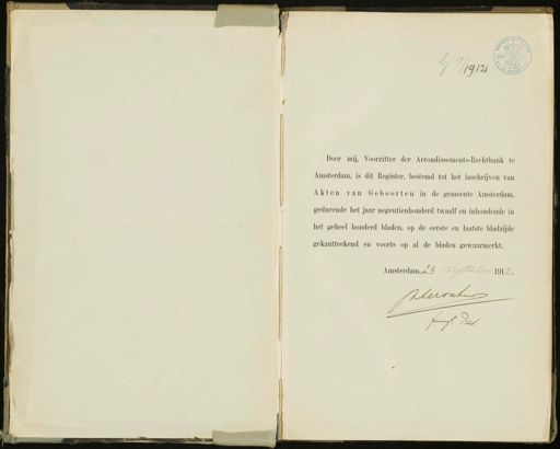 Stadsarchief Amsterdam, archieftoegang 5009, Archief van de Burgerlijke stand, inventarisnummer 7686, Geboorten, Akten, Registers van geboorteakten, 1912, deel 19