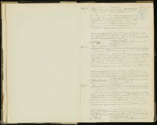 No 40801 Eerste blad Heden zeven October negentienhonderd twaale, Kteraot verscheen voor mij Ambtenaar van den burgerlijken stand van Amsterdam: St Gysbert Otten, bootwerker oud zesendertig jaren, wonende alhier, die verklaarde, dat 50½6 1 op vijf dezer, des na middags ten acht ure, i in deze gemeente Barentszstraat 47 is geboren 9ontt een kind van het mannelijk geslacht, uit zijne echtgenoote Bernardina Stijgers zonder beroep wonende alhier, aan welk kind wordt gegeven de voornaam van Johannes. Gedaan in tegenwoordigheid van Jan van Loest, ambtengaa oud acht en twintig jaren, wonende alhier en van Jan Rudolf Munneke Ambtenaar oud vierentwintig jaren, wonende alhier. Waarvan akte, welke overeenkomstig de wet is voorgelezen. vanoert. 3 Aaameete Heunerhalla 1 G. Osten No 10803 Heden Zeven October negentienhonderd twaalf, verscheen voor mij Ambtenaar van den burgerlijken stand van Amsterdam: Johannes Theodorus Adrianus Becht. handelsagent, oud zesenveertig jaren, wonende alhier, die verklaarde, dat op vier dezer, des na middags ten elf ure, in deze gemeente van dstadestraat 277 is geboren een kind van het mannelijk geslacht, uit zijne echtgenoote Chilippina Cornecia Vroomb, zonder beroep, wonende alhier aan welk kind worden gegeven de voornamen van Nicolaas Ootarus- Gedaan in tegenwoordigheid van Jan van Loest, ambtenaar oud acht entwintig jaren, wonende alhier en van Jan Rudslf Munneke Ambtenaar oud vierentwintig jaren, wonende alhier Waarvan akte, welke overeenkomstig de wet is voorgelezen.- JAansoert. Menagéchalla JThABecht. 3 Anwelber No 20895 Heden Zeven October negentienhonderd twaalf, verscheen voor mij Ambtenaar van den burgerlijken stand van Amsterdam: Jan Zant houtwerker, oud achtendertig jaren, wonende alhier, die verklaarde, dat op zesdezer de voor middags ten zes ure, in deze gemeente treete Spaarndammerstraat 77 is geboren een kind van het vrouwelijk geslacht, uit zijne echtgenoote Lena Catharina Bulder, zonder beroep, wonende alhier aan welk kind worden gegeven de voornamen van Lena Catharina Gedaan in tegenwoordigheid van Jan van Soest, Ambtenaar oud achtentwintig jaren, wonende alhier en van Jan Rudolf Munneke ambtenaar, oud vierentwintig jaren, wonende alhier, Waarvan akte, welke overeenkomstig de wet is voorgelezen.- JVanvoert J Zant Menrgechalla 5 Munnebes