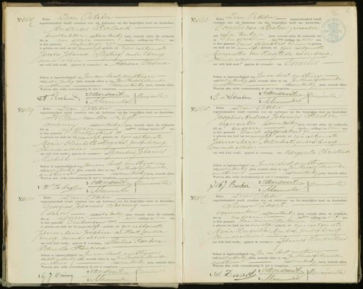 No 10807 Heden Zeven October negentienhonderd twaalf, verscheen voor mij Ambtenaar van den burgerlijken stand van Amsterdam: Andreas Roeland broodbakker, oud tweeentwintig jaren, wonende alhier, die verklaarde dat op vier dezer, des na middags ten tien ure, in deze gemeente Nassankade 490 is geboren een kind van het vrouwelijk geslacht, uit zijne echtgenoote Jacoba Johanna Sligting, zonder beroep, wonende alhier aan welk kind worden gegeven de voornaamen van Adriana Clasina. Gedaan in tegenwoordigheid van Jan van Soest, Ambtenaar oud acht en twintig jaren, wonende alhier en van Jan Rudslf Manneke ambtenaal oud vierentwintig jaren, wonende alhier. Waarvan akte, welke overeenkomstig de wet is voorgelezen. van soeit. Aurgeehalle 1A Roelam Mi No 19813 Heden Zeven October negentienhonderd twaaf, N verscheen voor mij Ambtenaar van den burgerlijken stand van Amsterdam: n A. Cornelis van Straten, ijzerwerkeretie oud vijf en twintig jaren, wonende alhier, die verklaarde, dat op zes dezer, des voormiddags ten vier ure, 38 Ont in deze gemeente Daniel Stalpertstraat 60 is geboren een kind van het mannelijk geslacht, uit zijne echtgenoote Margaretha van Huisstede, zonder beroep, wonende alhier aan welk kind wordt gegeven de voornaamm van Cornelis Gedaan in tegenwoordigheid van Jan van Soest, ambtenaar oud achtentwintig jaren, wonende alhier en van zn Rudolf Munneke ambtenaar oud vierentwintig jaren, wonende alhier vame ischalla C. v Straken J van Boers. 3 M uke No 14809 Heden Zeven October negentienhonderd twaalf, verscheen voor mij Ambtenaar van den burgerlijken stand van Amsterdam: Willem van der Lugt, Werkman, oud drie entwintig jaren, wonende alhier, die verklaarde dat op vijf dezer, de voor middags ten acht ure, in deze gemeente Guillijnstraat 133 is geboren een kind van het mannelijk geslacht, uit zijne echtgenoote Maria Elisabeth Hogers, zonder beroep, wonende alhier, aan welk kind worden gegeven de voornamen van Gerardus Johannes Michiel Gedaan in tegenwoordigheid van Jan van Loest, ambtenaar oud achtentwintig Jaren, wonende alhier en van Jan Ridolf Munneke ambtenaar oud vierentwintig jaren, wonende alhier. Waarvan akte, welke overeenkomstig de wet is voorgelezen. Jan Voert Menagéchalla W v/d. Leugt Muinake No1.0815 Heden Zeven October negentienhonderd twaalf, verscheen voor mij Ambtenaar van den burgerlijken stand van Amsterdam: Josephus Andreas Johannes Becker, kopergieter, oud vierentwintig jaren, wonende alhier, die verklaarde dat op zesdezer, des na middags ten Een ure, in deze gemeente Daniel Stalpertstraat 90 is geboren een kind van het vrouwelijk geslacht, uit zijne echtgenoote Johanna Maria Arkenbout, zonder beroep, wonende alhier. aan welk kind worden gegeven de voornamen van Margareta Christina Gedaan in tegenwoordigheid van Jan vantoest, ambtenaar oud acht entwintig jaren, wonende alhier en van Jan Rudalf Manneke ambtenaar, oud vierentwintig jaren, wonende alhier, Waarvan akte, welke overeenkomstig de wet is voorgelezen. Vanvoert. Mensricvall JHJ. Beeker Munute No 10811 Heden Zeven Cotsber negentienhonderd twaalf, verscheen voor mij Ambtenaar van den burgerlijken stand van Amsterdam: Georgis Johannes Suring slager, oud acht en twintig jaren, wonende alhier, die verklaarde dat op vijf dezer, des na middags ten vier ure, in deze gemeente Centuurbaan 354 is geboren een kind van het vrouwelijk geslacht, uit zijne echtgenoote Johanna Maria Josephina van Hout, zonder beroep, wonende alhier, aan welk kind worden gegeven de voornamen va Paulina Barbara Petronella Francisca. Gedaan in tegenwoordigheid van Jan van Loest, ambtenaar oud acht entwintig jaren, wonende alhier en van Jan Rudalf Munneke, ambtenaar, oud vierentwintig jaren, wonende alhier. Waarvan akte, welke overeenkomstig de wet is voorgelezen. Jansoeit. Eenagéchello 1G J Tining 3Memeeli No 11817 Heden Zeven October negentienhonderd twaalf, verscheen voor mij Ambtenaar van den burgerlijken stand van Amsterdam: Siemon Zwart, tigarenmaker, oud zevenentwintig jaren, wonende alhier, die verklaarde, dat op zesdezer, des voormiddags ten elf ure, in deze gemeente Haarlemmer Honttuinen 68.A is geboren een kind van het mannelijk geslacht, uit zijne echtgevoote Maria Hendrika Nomber, zonder beroep, wonende alhier. aan welk kind worden gegeven de voornamen vanohannes Hendrikus. Gedaan in tegenwoordigheid van Jan van Soest, ambtenaar oud acht entwintig Jaren, wonende alhier en van Jan Rudalf Munneke Ambtenaar oud vierentwintig jaren, wonende alhier Waarvan akte, welke overeenkomstig de wet is voorgelezen. J Jan Voert Menagéchalla J: Dwar Meeke