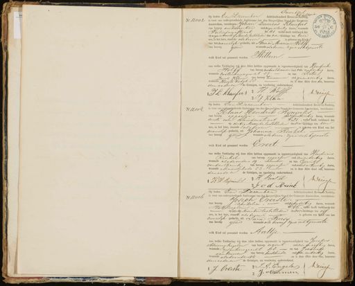 No. 12002 Perste bGad, vomis. 1 Op heden Een December Achttienhonderd Zeven-en-Tachtig is voor ons ondergeteekende Ambtenaar van den Burgerlijken Stand der Gemeente 13 FD 1 Amsterdam, verschenen: Johan Laurens Klautus van beroep suikerwerker oud negenentwintig Jaren, wonende 150 Poeliednaustraat No. 41 welke heeft verklaard dat 2 OE op negen entwintig November lantstleden des na middags ten twee ure, in het huis, staande als boven is geboren een kind van het mannelijk geslacht, uit Anna Maria Wolf van beroep geen wonende als boven zijne echtgenoote welk Kind zal genaamd worden Willem van welke Verklaring wij deze Akte hebben opgemaakt in tegenwoordigheid van Hendrik Wolff van beroep metaaldraarer oud vier endertig Jaren wonende Oostenbingergracht 57 en van Pieter Jacob Klein van beroep timmerman oud zesenveertig Jaren, wonende Hoorte Kadijk 88 en is deze Akte door ns, benevens den vnderen de Getuigen, na voorlezing onderteekend. I L klautus 2 H. Wolff: Driessen 3 JJ Klan No 12004 Op heden Een December Achttienhonderd Zeven-en-Tachtig is voor ons ondergeteekende Ambtenaar van den Burgerlijken Stand der Gemeente Amsterdam, verschenen: Klaas Hendrik Rijninks van beroep oppasser oud vijfentwintig Jaren, wonende eerste van Samdenstraat No 21, welke heeft verklaard dat op dertig November laatstleden des na middags ten een ure, in het huis, staande als boven is geboren een Kind van het mannelijk geslacht, uit Johanna Hinkel van beroep geen wonende als boven zijne echtgenoote welk Kind zal genaamd worden Overt. van welke Verklaring wij deze Akte hebben opgemaakt in tegenwoordigheid van Hendricus Rinkel van beroep oppasser oud eenendertig Jaren, wonende als de ouders 19. en van Gerrit van den Brink van beroep oppasser oud achtentwintig Jaren, wonende Maurtskade 53 en is deze Akte door ons, benevens den order en de Getuigen, na voorlezing onderteekend. KH: Rijnink 2 H Renkel Driessen 3 G vd Brink No 12006 Op heden Een December Achttienhonderd zesonsen-Tachtig is voor ons ondergeteekende Ambtenaar van den Burgerlijken Stand der Gemeente Amsterdam, verschenen Joseph Overstevan beroepninkelier oud vijfendertig Jaren, wonende Waterlooplen N.o 46, welte heeft verklaard dat op dertig November laatstleden des voormiddags ten vijf ure, in het huis, staande als boven is geboren een kind van het vouwelijk geslacht, uit Sara Sinsy van beroep geen wonende als boven zijne echtgenoote welk Kind zal genaamd worden Aaltje. van welke Verklaring wij deze Akte hebben opgemaakt in tegenwoordigheid van Jacobus Adrianus Engelen van beroep agent oud vier en vijftig Jaren, wonende gelantiersgracht 158 en van Johannes van Ommen van beroep boekbinder oud vien endertig Jaren, wonende als de ouderstik en is deze Akte door ons, benevens den vader en de Getuigen, na voorlezing onderteekend 2J. A. Engelen Driessen J. Overste 3 J. vCmmen