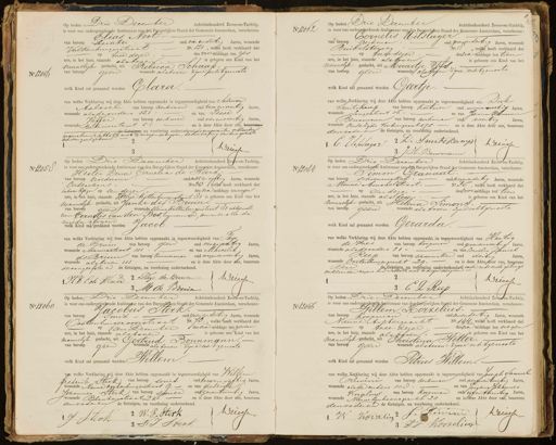 No 12959 Op heden Drie December Achttienhonderd Zeven-en-Tachtig is voor ons ondergeteekende Ambtenaar van den Burgerlijken Stand der Gemeente Amsterdam, verschenen. Elias Nool van beroep slachter oud vierendertig Jaren, wonende Valkenburgerstraat No. 121, welke heeft verklaard dat op twe dezer des voormiddags ten zes ure, in het huis, staande als boven is geboren een Kind van het nonwelijk geslacht, uit Rebecca Schaap van beroep geen wonende als boven: zijne sechtgenoote welk Kind tal genaamd worden Clara van welke Verklaring wij deze Akte hebben opgemaakt in tegenwoordigheid van Palsmon Aalsoel van beroep zerkman oud tweeenveertig Jaren wonende als de ouders 121 en van Isace Veffer van beroep zerkman oud vierenveertig Jaren, wonende BAtroierstraat 51 en is deze Akte door ons, benevens aaden getgedens vooehde onderaeterd de contaranten vrklaarten negenshun Sabbath niet te mogen schryven, de doortiafing van drie getokte Driecsen No 12962 op heden Drie December Achttienhonderd Zeven-en-tachtig is voor ons ondergeteekende Ambtenaar van den Burgerlijken Stand der Gemeente Amsterdam, verschenen Cornelis &uslager van beroep werkman oud zevenendertig Jaren, wonende Buiksloterneg No0, welke heeft verklaard de op tneederer denn middags ten tien ure, in het huis, staande als boven is geboren een Kind van het vrouwelijk geslacht, uit Maartje Uts van betoep geen wonende als boven zijne echtgenoote welk Kind val genaamd worden Glertje. van welke Verklaring wij deze Akte hebben opgemaakt in tegenwoordigheid van Dirk Suitskamp van beroep koetsier oud veertig Jaren, wonende Lougestraat 56 en van Johann Hemann Beusmann van beroep zerkman oud veertig Jaren, wonende Oude Zijds Voorbirrgwals 72 en is deze Akte door ons, benevens den voder en de Getuigen, na voorlezing onderteekend. Ee Hyplager D. Smitskamp Driessen 3 JH. Beuss No 12958. Op heden Drie December Achttienhonderd tegen-en-Tachtig is voor ons ondergeteekende Ambtenaar van den Burgerlijken Stand der Gemeente Amsterdam, verschenen: Hester Dina Cornelia de Weerd, van beroep troedvroum oud acht en vijftig Jaren, wonende No 30 welke heeft verklaard dat Ouderchans. in haar bijzijn op een dezer des na middags ten negen ure, in het huis, staande Letirje Kattenburgerstraat O1 is geboren een Kind van het mannelik geslacht, uit Janke de Bruin van beroep geen wonende kleine Kattenburgerstraat 81 echtgenooten van Cornelis van den Bos, timmerman, wonende als de moeder alnegeni welk Kind zal geaamd worden Jacob. van welke Verklaring wij deze Akte hebben opgemaakt in tegenwoordigheid van Thys de Bruin van beroep geen oud vierenzeventig Jaren, wonende Mariunstraat 111 en van Marelis deBruin van beroep timmermar oud negenenveertig Jaren, wonende als boven 111 en is deze Akte door eus, benevens devangeefster en de Getuigen, na voorlezing onderteekend. HD Cdte Hleerd Thyn de Bruin Driessen 3 M. de Bruin No 12064 Op heden Drie December Achttienhonderd Zevon-en-Tachtig is voor ons ondergeteekende Ambtenaar van den Burgerlijken Stand der Gemeente Amsterdam, verschenen: Simon Grandat. van beroep schoenmaker oud negenendertig Jaren, wonende Nieuwe Ambelstraat No. 35, welke heeft verklaard dat op een dezer desoormiddags ten tien ure, in het huis, staande als boven is geboren een Kind van het vrouwelyk geslacht, uit Helena Simons van beroep geen wonende als boven: zijne echtgenoote welk Kind zal genaamd worden Gerarda. van welke Verklaring wij deze Akte hebben opgemaakt in tegenwoordigheid van Hartos de Vues van beroep koopman oud zevenenveertig Jaren, wonende als de ouders 31 en van Cornelis Janiel Reep van beroep schrenmaker oud dertig Jaren, wonende Oosterlburgergracht 29. en is deze Akte door ons, benevens een le, Getuigen, na voorlezing onderteekend de vader ende eerste getuige verklaarden negens hun Sabbath niet te mogen schrijven Driessen 3. C D Reep No 12060 Op heden Drie December Achttienhonderd Zeven-en-Tachtig is voor ons ondergeteekende Ambtenaar van den Burgerlijken Stand der Gemeente Amsterdam, verschenen Jacobus Tierk van beroep smid, oud zevenen dertig Jaren, wonende Oostenburgervoorstraat No. 73, welke heeft verklaard dat een December des na middags ten zeven ure, in het huis, staande als boven is geboren een Kind van het mannelijk geslacht, uit Gertrud Bonnmann. van beroep geen wonende als boven: zijne echtgenoote welk Kind zal genaamd worden Willem van welke Verklaring wij deze Akte hebben opgemaakt in tegenwoordigheid van Willem Frederik Sterk van beroep smid oud tweeenviftig Jaren, wonende Nieuwe Oostenburgerstraat 9. en van Frederyk Johannes Sterk van beroep sjouer oud zesentwintig Jaren, „ wonende Blankerstraat21 en is deze Akte door ous, benevens den voder en de Getuigen, na voorlezing onderteekend. Driessen 2 W. P. Sterk J Sterk 3 F: J Sterk No 12966 Op heden Drie December Achttienhonderd zeventen-Tachtig, is voor ons ondergeteekende Ambtenaar van den Burgerlijken Stand der Gemeente Amsterdam, verschenen Aandaren koopman oud eenendertig Jaren, worende Willem Horzelius. Nieuwe Achtergracht No. 144, welke heeft verklaard dat op twee dejer des na middags ten negen ure, in het huis, staande als boven, is geboren een Kind van het mannelijk geslacht, uit Christina Wetter- van beroef geen wonende als boven zijne echtgenoote welk Kind zal genaamd worden Petrus Willem. van welke Verklaring wij deze Akte hebben opgemaakt in tegenwoordigheid van Jorexh Samuel Rummi van beroep berkman oud vegenentwintig Jaren, wonende als de ouders 108 en van Jacobus Johannes Korzelius van beroep koopman oud vijfentwintig Jaren wonende Meuwekijnbaanspacht 20 en is deze Akte door ons, benevens den vader en de Getuigen, na voorlezing onderteekend. W Kovrelin & J. Kimum Driessen 3 J:V Korzelius