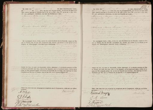 Vand Op heden den Twintigsten Januarij des Jaars Achttienhonderd Dertig, des morgens ten Elf uren, zijn voor ons Ondergeteekende, als Lid van den Raad dezer Stad, daartoe ingevolge de Besluiten van Z. M. van 14 Febr. 1823, No. 59 en van 11 Jan. 1828, No. 108, gedelegeerd, verschenen, ten einde een Huwelijk aan te gaan, Marinis Johannis d'o Hont. Apothekersbediende, Geboren te Middelburg, wonende Achier Oud Twintig Iarin, Minderjarige zoon van Adriaan d' Hont, overleden en en Maria Johanna Questhoudt, particuliere wonende te Middelburg,- ter Eene. En Cornelia Jacoba Klok. Geenberoep Geboren te Alkmaar, wonende Achier Aend Dertig Jaren, Meerderjarige Dochter van Klaas Keok Cz: en Johanna Carolina Magdalina Job:- beiden overleden ter andere zijde.De voorafgaande Acten, welke, nevens het zesde Hoofdstuk van het Huwelijk, volgens de Wet van 25 Ventose van het Jaar Elf, voorgelezen zijn, bestaan, ten eersten: in een Extract uit het Register der Afkondigingen, behoorlijk zonder verhindering Alhier in te Middelburg geschied den Twintig en Zeven en twintig December A.o Vo en Zeven en twintig December Ao p. n derden dezer ten 2dende Doopcedullen der verloofden ten 3dende Doodsedullen hunner vaders ten 4den Notarisl konsent der Moeder van den bruidigiten 5den doodsedul der Moeder van de bruid= die ons met de ondergemelde getuigen onder aanbord van eede verklaarde den dood, of schoon onbehendheid der plaats van overlyden of laatste woonplaats haar Groot Ouders. waarna- wij hun, bij name en lafzonderlijk, hebben afgevraagd: of zij elkander aannamen als Man en Vrouw; het welk door hun, iederin het bijzonder, met ja beantwoord zijnde, hebben wij in naam der Wet uitspraak gedaan: dat zij door het Huwelijk zijn vereenigd; alles ingevolge het derde Hoofdstuk der Wet van 20 Ventose, van het Jaar Elf, en in tegenwoordigheid van Fredrik Spelting, kleevenmaker, Oud Drie en Vyftig Jan Carel Coenraads, Zeepouderskrecht oud Vyf en TwintigJacobus Ernestus van Essen Metselaarstrele oud Ngenen Dertig in Gerardus vander Meulen, Metselaarsknecht, oud Zevenen Vyftig Jaren Allen wonende Altier. Zijnde deze Acte, door ons vervaardigd en voorgelezen aan de Comparanten, welke met ons hebben n geteekend. van Winter M: J:d Hont C J Klok F Speltug J:C: Coenraadt J: E: Van Essien J van Termeulen J. Kense oli WdL.V Op heden den Twee en Twintig Januarij des Jaars Achttienhonderd Dertig, des middags ten twaalf uren, zijn voor ons Ondergeteekende, als Lid van den Raad deze Stad, daartoe ingevolge de Besluiten van Z. M. van 14 Febr. 1823, No. 59 en van 11 Jan. 1828, No. 108, gedelegeerd, verschenen, ten einde een Huwelijk aan te gaan, Vinzens Mager. Muzykmeester, Geboren te Markt Seibersdortf wonende Achier, Oud Vyf en Dertig Jaren Meerderjarige zoon van Franz Mager; en Kajetan Tuiner. - beiden overleden- ter Eene. En Johanna Maria Lamm Fabrykante, Geboren en wonende Alhier, oud Eenen Dertig Jaren, (gedt Exang Lutt: 18 July 1798/ weduwe van Corneille Charles Cmanie van der Does, Meerderjarige Dachter van Carch Lamm overleden; en Johanna Maria Bonderman, geen beroep, wonende ichier.- ter andere zijde. Devoorafgaande Acten, welke,nevens het zesde Hoofdstuk van het Huwelijk, volgens de Wet van 25 Ventose van het Jaar Elf, voorgelezen zijn, bestaan, ten eersten: in een Extract uit het Register der Afkondigingen, behoorlijk zonder verhindering Alhier geschied den Tienden en Zeventienden dezer ten 2dende Doopsedullen der verloofden ten 3den de Doodsezullen der Ouders van den bruidegom. die ons met de ondergemelde getuigen onder aanbod van eede verklaarde den dood, of schoon onbekendheid der plaats van overlijden of laatste woonplaats zyner Groot Ouders.ten 4den de DoodCedul desvorigen Mans der bruid. ten 5den die haars vaders. En konsenteerde hare Moeder personeel in dezen Echtwaarna wij hun, bij name en afzonderlijk, hebben afgevraagd: of zij elkander aannamen als Mar en Vrouw; het welk, door hun, ieder in het bijzonder, met ja beantwoord zijnde, hebben wij in naam: der Wet uitspraak gedaan: dat zij door het Huwelijk zijn vereenigd; alles ingevolge het derde Hoofdstuk der Wet van 20 Ventose van het Jaar Elf, en in tegenwoordigheid van Jan Lamm, Broeder, Chirurgyn, Oud Vyf en Dertig Salomon Rappel Zwager der Echtgenoote, fortepranomaker Oud Zevenen Twintig Pieter Jouph van Tennenbroek, kantoorbediende, oud Vyfentwintig, en Joscht Fonlyn, koopman, oud NegenenDertig Jarn Allen worende Alhier Zijnde deze Acte door ons vervaardigd en voorgelezen aan de Comp „welke met ons hebben. geteekend, verklarende de presente Moeder niet te kunnen schryven. VanWenter Aimeens Magerp J: M: Lamm J: Lamm S: Rappel G van Pennenbroet