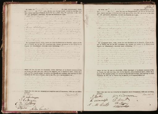 Op heden den ZevenenTwintig Januarij des Jaars Achttienhonderd Dertig, desmorgens ten Elf uren, zijn voor ons Ondergeteekende, als Lid van den Raad deze Stad, daartoe ingevolge de Besluiten van Z. M. van 14 Febr. 1823, No. 59 en van 11 Jan. 1828, No. 108, gedelegeerd, verschenen, ten einde een Huwelijk aan te gaan, Albertus Beyne Tjouwer, Geboren en wonende Achie„ Oud Zes en Twintig Iaren (ged:t Nieuwek 23 Nov.o 1803. Meerderjarige zoon van Jan Christoffel Beijne, Koorndragen en Cotharina Parbara Tulling wonende Actier ter Eene En Anna Scholmijjer gien beroep Geboren en wonende Altier, And Vyfen Twintig Iaren (ged.t Noorder k: 10 Aug 1303) Meerderjarige Dochter van Frederik Scholmijjer en Anna Tim. - beiden overleden. - ten andere zijde.— En konsenteerden de Ouders des bruidegoms personeel in dezen Echt. De voorafgaande Acten, welke, nevens het zesde Hoofdstuk van het Huwelijk, volgens de We van 25 Ventose van het Jaar Elf, voorgelezen zijn, bestaan, ten eersten: in een Extract uit het Register der Afkondigingen, behoorlijk zonder verhindering Alhier geschied den zeventien- en Veren twintig dezer ten zdin de Doopcedullen der verloofden. ten 3den de Doodcedul der Moeder van de bruid: die ons met de ondergemelde getuigen onder aanbod van eede verklaarde den dood, ofschoon onmogelykheid daarvan behoorlyke bewijzen te produceren, van haren vader en Groot Onders.- waarna wij hun, bij name en afzonderlijk, hebben afgevraagd: of zij elkander aannamen als Man en Vrouw; het welk door hun; ieder in het bijzonder, met ja beantwoord zijnde, hebben wij in naam der Wet uitspraak gedaan: dat zij door het Huwelijk zijn vereenigd; alles ingevolge het derde Hoofdstuk der Wet van 20 Ventose, van het Jaar Elf, en in tegenwoordigheid van des Echtgenoots Vader, oud Achten Veertig Abraham Tim Vergulden, oom der Eehtgenoote, oud Acht en Veertig, Hendrik Cupidoo, Verguldens knecht Ond Acht en Dertig, en Albertus van Grieken, Idem Oud Negenentwintig Iaren. — Allen wonende Alhier. Zijnde deze Acte door ons vervaardigd en voorgelezen aan de Comparanten, welke met ons hebben geteekend. A: Beijne van Winter A scholejer A: C: Beyne B: Tulling ACem Tmm H Cep Doo A Van Greke JvdL. G Op heden den Zevenentwintig Januarij des Jaars, Achttienhonderd Dertig des morgens ten Elf uren, zijn voor ons Ondergeteekende, als Lid van den Raad deze Stad, daartoe ingevolge de Besluiten van Z.M. van 14 Febr. 1823, No. 59 en van 11 Jan. 1828 No. 108, gedelegeerd, verschenen, ten einde een Huwelijk aan te gaan, Joannes Baltes. Mr Schoenmaker Geboren te Emmerik in Pruissen, wonende Achier oud Zevenen Dertig Jaren, weduwenaar van Regina Rusner Meerderjarige zoon van Ioannes Kupper Cut Mater asserit) wiens aanwezen onbekend is en Anna Maria Baltes, overleden. - ter Eene „ En Hendrina Andriessen. Dienstoode, Geboren te Nymegen wonende Achier, Oud Zevenen Twintig Iaren, Meerderja rige Dochter van Petrus Andriessen overleden „ en Anna Margarita Pits, gienbevoep, wonende te Zalt-bommel. - ten andere zijde. En konsenteerde de Moeder der beud personeel in dezen Echt. De voorafgaande Acten, welke, nevens het zesde Hoofdstuk van het Huwelijk, volgens de Wet van 25 Ventose van het Jaar Elf, voorgelezen zijn, bestaan, ten eersten: in een Extract uit het Register der Afkondigingen, behoorlijk zonder verhindering Achier geschied den Zeventien- en Vier en twintig dezer. ten 2dende Doopceduellen der verloofden ten 3den de DoorCedul der vorige Vrouw des bruidigame ten 4den die, zyner Moeder- en verklaarde ons de bruidegom met de ondergemelde getuigen onder aanbod van eede de onbekendheid van het aanwezen zyns vaders Sents 1792 en het overlyden, ofschoon onbekendheid der laatste woonplaats zynen Groot Ouders„ ten 5 der de Doodfedel des vaders van de bruid. waarna wij hun, bij name en afzorderlijk, hebben afgevraagd: of zij elkander aannamen als Man en Vrouw; het welk door hun, ieder in het bijzonder, met ja beantwoord zijnde, hebben wij in naam der Wet uitspraak gedaan: dat zij door het Huwelijk zijn vereenigd; alles ingevolge het derde Hoofdstuk der Wet van 20 Ventose van het Jaar Elf, en in tegenwoordigheid van Willem Andriessen, Oom, Tapper oud Zevenen Veertig Jan Smit, Schuitervoerder, oud Vyf en Zestig Jan Joseph Miner Mr kleevermaker, Oud Vyf en Veertig en en Nicolaas Steevenberg Huisbewaarder Oud Vyf en Dertig Jaren. — Allen wonende Aezer. Zijnde deze Acte door ons vervaardigd en voorgelezen aan de Com met ons hebben geteekend. Wetudriesee vanstriten J: Baltur handeriesse J: Sm P J:F: Minen, M. Ciets V Steerenber