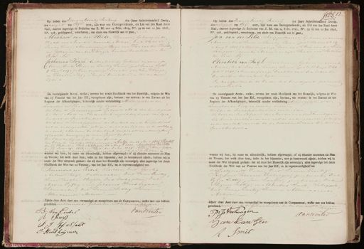 Op heden den Zevenentwintig Januarij des Jaars Achttienhonderd Dertig, des morgens ten Elf uren, zijn voor ons Ondergeteekende, als Lid van den Raad dezer Stad, daartoe ingevolge dé Besluiten van Z. M. van 14 Febr. 1823, No. 59 en van 11 Jan. 1828, No. 198, gedelegeerd, verschenen, ten einde een Huwelijk aan te gaan, Abraham van der Heide. Sjouwer, Geboren in de Vlakte van Naarden wonende Achier, oud Acht en Dertig Jaren, Meerderjarige zoon van Ian van der Heide en Catharina van den Berg- beiden overleden. - ter Eene. - En. Catharina Foppé buitenberoep, Geboren en wonende Alhier, And Negen en Dertig Iaren (gedt Evang. Luth: 9 Ian 1791 Meerderjarige Dochter van Jan Poppe en Iohanna Weijg.- beiden overleden. — ten andere zijde.- De voorafgaande Acten, welke, nevens het zesde Hoofdstuk van het Huwelijk, volgens de We van 25 Ventose van het Jaar Elf, voorgelezen zijn, bestaan; ten eersten: in éen Extract uit het Register der Afkondigingen, behoorlijk zonder verhindering Actiergeschied den Zeventien en Vier en twintig dezer. ten 2den de Getomologiende Geboorte Ak te des bruidegoms ten 3den Akte van bekendheid wegens den dood van zyne Ouders en Groot Ouders.- ten 4den de Doodcedullen der auders van de bruid: die ons met de ondergemelde getuigen onder aan bod van eede verklaarde den dood, ofschoon enbehendheid der plaats van overlyden of laatste woonplaats taur Groot Ouders ten 5 den de Doopcedel der bruide ten der de Geboortesedullen van Antje den 11 Novr 1815, Clisabeth den 22 February 1821.- Abram 20 Aug.s 1822, Magdalena harlotta den 22 December 1826- en Jan den 2 Mei 1829: Allen Altier Geboren, welke kinderen de verlootden ons verklaarden by dese te Echten. waarna wij hun, bij name en afzonderlijk, hebben afgevraagd: of zij elkander aannamen als Man en Vrouw; het welk door hun, ieder in het bijzonder, met ja- beantwoord zijnde, hebben wij in naam der Wet uitspraak gedaan: dat zij door het Huwelijk zijn vereenigd; alles ingevolge het derde Hoofdstuk der Wet van 20 Ventose, van het Jaar Elf, en in tegenwoordigheid van Bernardus van tersel Schilder, oud Veertig Antonie Ruijs kastenmaker, oud Eenen Veertig Simon Ianssen Hessels, Oud Zukaptein, Oud Acht en Vyftig „ en Johannes Stersheymer Schoenmaker, oud Zeven en Zestig Jaren Allen wonende Actier. Zijnde deze Acte door ons vervaardigd en voorgelezen aan de Comparanten, welke met ons hebben, geteekend, verklarende de schuwder niet te kunnen schrijven. B: Van Eersel van Winter A Ruys Jessels I: Hens heijmer WdL 12 Op heden den zevenenTwintig Januarij des Jaars Achttienhonderd Dertig, des morgens ten Elf uren, zijn voor ons Ondergeteekende, als Lid van den Raad dezer Stad, daartoe ingevolge de Besluiten van Z. M. van 14 Febr. 1823, No. 59 en van 11 Jan. 1828, No. 108, gedelegeerd, verschenen, ten einde een Huwelijk aan te gaan, Jan van der Lelie Schippersknecht, Geboren en wonende Alhier, oud Zeven en Twintig Jaren (ged:t Westerkk 13 Aug:o 1802) Meerderjarige zoon van Arie van der Lelie schipper, wonende Achieren en wijlen Iansje van Metelen ter Eene. - En Elizabeth van Tuijl. Geenberoep, Geboren en wonende Actier, oud Drie en Dertig Jaren Gedt N2 kapel 21 febr: 1796) Meirderjarige Dochter van Onbekende Ouders. — ter andere zijde. En konsenteerde de Vader des bruidegoms personeele in dezen Echt.- De voorafgaande Acten, welke, nevens het zesde Hoofdstuk van het Huwelijk, volgens de Wet van 25 Ventose van het Jaar Elf, voorgelezen zijn, bestaan, ten eersten: in een Extract uit het Register der Afkondigingen, behoorlijk zonder verhindering Actiengeschied der Zeventien en Vier en twintig dezer. ten 2dende Doopcedullen der verloofden. ten 3den de Doodcedeel der Moeder van den bruidegom De bruid verklaarde ons met de ondergemelde getuigen onder aan bod van iede de onbekendteid tarer Oenders en Groot Ouders.- waarna wij hun, bij name en afzonderlijk, hebben afgevraagd: of zij elkander aannamen als Man en Vrouw; het welk door hun, ieder in het bijzonder, met ja beantwoord zijnde, hebben wij in naam der Wet uitspraak gedaan: dat zij door het Huwelijk zijn vereenigd; alles ingevolge het derde Hoofdstuk der Wet van 20 Ventose van het Jaar Elf, en in tegenwoordigheid van des Echtgenoots Vader Oud Zevenen Veertig Prileppus Johannes Verhaagen, geen beroep, Ond Vyf en zestig, Jan Lanfen, geen beroep, Oud Negenen zestig, in Albertus Smet Schipper Oud VierenDertig Jaren. — Allen wonende Actier. Zijnde deze Acte door ons vervaardigd en voorgelezen aan de Comparanten, welke met ons hebben geteekend, verklarende de Gehuwden in de vader niet te kunnen schrijven Pr J Verhoogen vanwinter Jan Lanten
