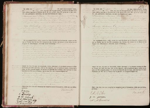 Op heden den Twintigsten Januarij des Jaars Achttienhonderd Dertig des morgens ten Elf uren, zijn voor ons Ondergeteekende, als Lid van den Raad deze Stad, daartoe ingevolge de Besluiten van Z. M. van 14 Febr. 1823, No. 59 en van 11 Jan. 1828. No. 108, gedelegeerd, verschenen, ten einde een Huwelijk aan te gaan, Barend van Dam, Huisknecht, Geboren te Roteerdan wonende Actier, Oud Vyf en Twintig Jaren, Meerder„ jarige zoon van Abraham van Dam, Venter, en Duifje de Vries, wonende te Roteerdam ten Eene; En Jetje Zilverberg. Dienstbode en Geboren te Medemblik wonende Achien, oud Een en Twintig Iaren, Meerderja- rige Dochter van Joseph Abraham Leij, en Ractel Salomans. - beiden overleden.- ter andere zijde De voorafgaande Acten, welke, nevens het zesde Hoofdstuk van het Huwelijk, volgens de We van 25 Ventose van het Jaar Elf, voorgelezen zijn, bestaan, ten eersten: in een Extract uit het Register der Afkondigingen, behoorlijk zonder verhindering Achier geschied den tienden en Zeventienden dezer. ten 2dende Gehomologierde Geboorte Akten der verloofden ten 3den Notarisl konsent der Elnders van den bruidigs ten 4den de doorfedullen der Ouders van de Bruid. die ons met de ondergemelde getuigen onder aan bod van iede verklaarde ren dood, of schoon onbekendteid der plaats van overlijden of laatste woonplaats harer Groot Ouders.- er Vrouw, het welk door bun, ieder in het bijzonder, met ja beantwoord zijnde, hebben wijn v beroune vij huy bij name en afzonderlijk, hebben afgev of zij elkander :„ ndam der Wet uitspraak gedaan: dat zij door het Huwelijk zijn vereenigd; alles ingevolge het derde Hoofdstuk der Wet van 2e Verkose, van het Jaar Elf, en in tegenwoordigheid van Abraham Meyer Hamel, geen beroep Oud Drie en en Vouw; het welk door bun, ieder in het bijzonder, met ja beantwoord zijnde, hebben wijn waarna wij hun, bij name en afzonderlijk, hebben afgevraagd: of zij elkander aannamen als Mai