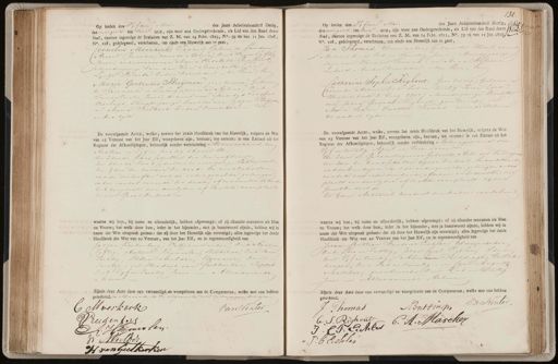 Op heden den Vifden Mei des Jaars Achttienhonderd Dertig, des morgens ten tien uren, zijn voor ons Ondergeteekende, als Lid van den Raad dezer Stad, daartoe ingevolge de Besluiten van Z. M. van 14 Febr. 1823, No. 59 en van 11 Jan. 1828, No. 108, gedelegeerd, verschenen, ten einde een Huwelijk aan te gaan, Cornelus Moerkerk, Tapper, Geboren te Leerdam Arrondt Gorinctem, wonende Achier, Oud Eenen Vyftig Jargen, weduwenaar van Maria Elisabeth Qupffert, Meerderjarige zoon van Jan Moerkerken en Lyntje Pieterse, beiden overleden. — ten eene; En Maria Gertrudis Pluijmen. geen beroep, Geboren te Roermonde in Limburg, wonende Achier, And Twee en Veertig Jaren, weduwe van Gerardus Jacobus Kienhuijs, Meerderjarige Dochter van Casper Sluijmen en Maria Rulkens, beiden overleden.— ten an dere zyde. De voorafgaande Acten, welke; nevens het zesde Hoofdstuk van het Huwelijk, volgens de Wet van 25 Ventose van het Jaar Elf, voorgelezen zijn, bestaan; ten eersten: in een Extract uit het Register der Afkondigingen, behoorlijk zonder verhindering Alhier geschied den Achttien en Vyf en twintig April ll. ten 2dende Doopseduller der verloofden ten 3dende Doorse dullen hunner vooige Echtgenooten ten 4den die hunder ouders: En verklaarden ons de verloofden met de ondergemelde getuigen onder aanbod van eede den daad, of sezoon onbekend heid derplaats van overlyden of laatste woonplaats turrer Groot Ouders. „waarna wij hun, bij name en afzonderlijk, hebben afgevraagd: of zij elkander aannamen als Man en Vrouw; het welk door hun, ieder: in het bijzonder, met ja beantwoord zijnde, hebben wij in naam der Wet uitspraak gedaan: dat zij door het Huwelijk zijn vereenigd; alles ingevolge het derde Hoofdstuk der Wet van 20 Ventose, van het Jaar Elf, en in tegenwoordigheid van Catper Vreedenberg, koffyhuistonder, Ond Acht en Vyftig, Antonie Heymoolen, Winkelier, oud Eenen Veertig, Willen Mulder, Hovenien, ons Veertig, en Hendrik van Geelkerken, Tapper Oud Vyf en veertig Jaren. — Allen wonende Actier Zijnde deze Acte door ons vervaardigd en voorgelezen aan de Comparanten, welke met ons hebben geteekend, verklarende de Echtgenoote riet te kunnen schrijven van Winter P Hoerkerk Vreedenzers A: Heyrarten. W Mulder J van Geelkerken 130. Op heden den Sijfden Mei des Jaars Achttienhonderd Dertig, des morgens ten tien uren, zijn voor ons Ondergeteekende, als Lid van den Raad dezer WZZ Stad, daartoe ingevolge de Besluiten van Z. M. van 14 Febr. 1823, No. 59 en van 11 Jan. 18288 No. 108, gedelegeerd, verschenen, ten einde een Huwelijk aan te gaan, Jan Thomas. Kleirenmaker, Geboren te Wezel wonende Achier, Oud zes en Twintig Jaren, Meerderjarige zoon van Herman Tromas, in Anna Rebicaa Laders.- beiden overleden.- ter Eene; En Catherine Sophie Righout: Geenberoep, Geboren en wonende Achier, oud zes en twintig Jaren (ged Waalsche kerk 2 Iuny 1803 / Meerderjarige Dochter van Johan Gerard Righout, geen beroep, en Marie Soptie Dorottie Tzomas wonende alhier. ter andere zyde. De voorafgaande Acten, welke, nevens het zesde Hoofdstuk van het Huwelijk, volgens de Wet van 25 Ventose van het Jaar Elf, voorgelezen zijn, bestaan, ten eersten: in een Extract uit het Register der Afkondigingen, behoorlijk zonder verhindering Achirgeschied dan Vyf en twintig April en twee dezer ten zden de Gehomologierde Geboorte Acte des truidegoms ten 3der de Doodsedullen zyner Ouders: En verklaarde ont de bruidegom met de ondergemelde getuigen onder aan bod van eede den dood, ofschoon onbekendkeid der plaats van overlyden of laatste voorplaats zyner Groot Onders. ten Idenr Notarisel kondert der ouders van de bruid= waarna wij hun, bij name en afzorderlijk, hebben afgevraagd: of zij elkander aannamen als Mar en Vrouw; het welk door hun, ieder in het bijzonder, met ja beantwoord zijnde, hebben wij in naam der Wet uitspraak gedaan: dat zij door het Huwelijk zijn vereenigd; alles ingevolge het derde Hoofdstuk der Wet van 20 Ventose van het Jaar Elf, en in tegenwoordigheid van Johann Christian Frudrich lichler, kleevenmaker, oud Drie en Zestig, Joran Carel Eichler, Idem, oud Vyf en twintig, Abraham Raddingh, tabaks kooper, Oud zes entwintig, in Cart August Mascher, gienberoep, oud Zes en twintig Allen wonende Alzier. Jaren Zijnde deze Acte door ons vervaardigd en voorgelezen aan de Comparanten, welke met ons hebben geteekend. J Thomas Buddimyp vntenter I C:P: Achler C: A: Mascher Ce S. Righout. J: C Eistelen