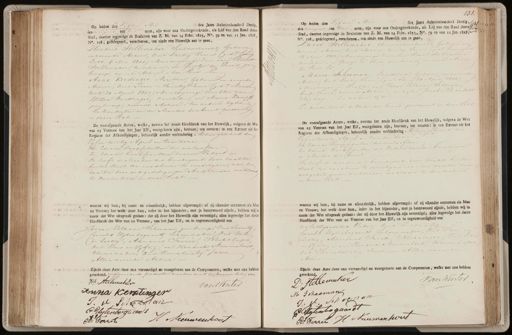 Op heden den Vijfden Mei des Jaars Achttienhonderd Dertig : des morgens ten tien uren, zijn voor ons Ondergeteekende, als Lid van den Raad dezer 15 Stad, daartoe ingevolge de Besluiten van Z. M. van 14 Febr. 1823, No. 59 en van 11 Jan. 1828. No. 108, gedelegeerd, verschenen, ten einde een Huwelijk aan te gaan, Hendrik Hellemaker Schilderskrecht, Geboren in wonende Actier, oud Dertig Jaren (gedt Exans Lath: 4 Mei 1800/ Meerderjarige zoon van Eldert Stellemaker, overleden en Guietje de Vries, geen beroep, wonende Achier.- ten Eene.En Anna Kerstinger Naester, Geboren en wonende Actier, oud Zeven en Twintig Jaren Cod=s Nieuwe kerk 20 April 1803) Meerderjarige Dochter van Willem kerstinger, overleden, en Maria Kempp geen beroep, wonende Actier.- ter andere zyde En konsenteerde de Moeder der brend personeel in dezen Echt. De voorafgaande Acten, welke, nevens het zesde Hoofdstuk van het Huwelijk, volgens de Wet van 25 Ventose van het Jaar Elf, voorgelezen zijn, bestaan; ten eersten: in een Extract uit het Register der Afkondigingen, behoorlijk zonder verhindering Achier geschied den Vyf en twintig April en twee dezer ten zdende Doopcedullen der verloofden ten 3derde Doodcedullen hunner Vaders En heeft de Moeder det bruidegoms, door zwakte buiten staat ter raadhuize te verschynen, aan den daartoe door onsgedelegeerde Ambteraar verklaard te konsenteren in dezer Echt. waarna wij hun, bij name en afzonderlijk, hebben afgevraagd: of zij elkander aannamen als Man en Vrouw; het welk door hun, ieder in het bijzonder, met ja beantwoord zijnde, hebben wij is naam der Wet uitspraak gedaan: dat zij door het Huwelijk zijn vereenigd; alles ingevolge het derde Hoofdstuk der Wet van 20 Ventose, van het Jaar Elf, en in tegenwoordigheid van Johann Volkman Schoeman, geen beroep, Oud Zeventig Cornelis Ugterbogaard, Schoenmaker oud twee en zestig, Adrianus Ferrie Klikslager oud Drie en Vyftig, en Hendrik Nieuwenhout kleevermaker, oud Vierentwintig Jaren Allen worende Altur. Zijnde deze Acte door ons vervaardigd en voorgelezen aan de Comparanten, welke met ons hebben geteekend, verklarende de presente moeder niet te kunnen schrijven. 7: Hellemaker van Winter Anna Keralinger J. v Sitxenan C Wytenbegaant H Neeuwenkour A: Ferzit 131: Op heden den Vijfden Mei des Jaars Achttienhonderd Dertig, 1 des morgens ten tien uren, zijn voor ons Ondergeteekende, als Lid van den Raad dezer1 Stad, daartoe ingevolge de Besluiten van Z. M. van 14 Febr. 1893, No. 59 en van 11 Jan. 1828,0 No. 108, gedelegeerd, verschenen, ten einde een Huwelijk aan te gaan, David Hellemaker. kleirenmakersknecht, Geboren en wonende Achier, Oud Acht en twintig Jaren Eged:t Evang, Lutt 12 April 1802) Meerderjarige zoon van Eldert Stellemaker overleden en en Grietje de Vries, verberoep, wonende Achier„ ten Eene Ex Maria Schoeman. Dienstbode, Geboren en wonende Achier, oud Dertig Jaren, (ged=e Idem 20 April 1800/ Meerderjarige, Dochter van Johan Volkman Schoeman buiten beroep, wonende Alhier en wijlen Jacoba Elizabeth, Renberg - ten andere zijde Enkonsenteerde te Vader der breid personeel in dezen Echt„ De voorafgaande Acten, welke, nevens het zesde Hoofdstuk van het Huwelijk, volgens de Wet van 25 Ventose van het Jaar Elf, voorgelezen zijn, bestaan, ten eersten: in een Extract uit het Register der Afkondigingen, behoorlijk zonder verhindering Achiergeschiedt den Vyf entwintig April en tweeden dezer ten 2dende Doopsedullen der verloofden ten 3dende Doocpdullen des Vaders van den bruidegom en Moeder der brind. En heeft de moeder des bruidegoms, door zwakte buiten staat ten raadhuize te verschijnen, aan den daartoe door onsgedelegeerden ambtenaar verklaard te kontentever in dezen Echt. waarna wij hun, bij name en afzonderlijk, hebben afgevraagd: of zij elkander aannamen als Man en Vrouw; het welk: door hun, ieder in het bijzonder, met ja beantwoord zijnde, hebben wij in naam: der Wet uitspraak gedaan: dat zij door het Huwelijk zijn vereenigd; alles ingevolge het derde Hoofdstuk der Wet van ao Ventose van het Jaar Elf, en in tegenwoordigheid van: der Echtgenootes Vader, Ond Zeventig Cornelis Uyterbogaarde Schoenmaker, Oud Twee en Zestig, Adrianus Ferrce Blikslager, Ond Drie en Vyftigen in Hendrik Nieuwenhout kleerenmaker oud Vier entwintig Jaren. — Allen wonende Alzier Zijnde deze Acte door ons vervaardigd en voorgelezen aan de Comparanten, welke met ons hebben geteekend, van Winter D: Stelennker M Schaeman J: d. Schoeman 8 AyCents gaardt R: Ferzel H Nieuwenhout