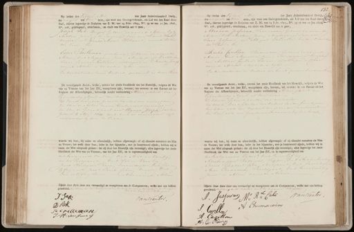 Op heden den Vijfden Mei des Jaars Achttienhonderd Dertig, des morgens ten tien uren, zijn voor ons Ondergeteekende, als Lid van den Raad dezer Stad, daartoe ingevolge de Besluiten van Z. M. van 14 Febr. 1823, No. 59 en van 11 Jan. 1828, No. 108, gedelegeerd, verschenen, ten einde een Huwelijk aan te gaan, Joseph Sak. Kruyer, Geboren en wonende Achier, Oud Achttien Jaren Minderjarige zoon van David Sak, kingen, en Aranka Moses Witmont, wonende actien ter Eene. Ester Brilleman. geen beroep, Geboren en wonende Achier, oud Negentien Jaren Minderjarige Dochter van Isaal Hartog Builleman, uitdrager en Branke Josepp wonende Alhier. — ten andere zyde. En konsenteerden hunne Ouders personeel in dezer EchtDe voorafgaande Acten, welke, nevens het zesde Hoofdstuk van het Huwelijk, volgens de Wet van 25 Ventose van het Jaar Elf, voorgelezen zijn, bestaan; ten eersten: in een Extract uit het Register der Afkondigingen, behoorlijk zonder verhindering Achier geschied den Vyf entwintig April en twee dezer. ten 2dende betryd- en GeboorteCedullen der verloofden. ten 3den de Acten hunnen Camilienaams-aannemigt ten Iden de Geboortesedel van Hyman Joseph alhier Geboren 4 April 1830: welk kind de verloofden ons verklaarden by deze te Echten. waarna wij hun, bij name en afzonderlijk, hebbenafgevraagd: of zij elkander aannamen als Man en Vrouw; het welk door hun, ieder in het bijzonder, met ja beantwoord zijnde, hebben wij in naam der Wet uitspraak gedaan: dat zij door het Huwelijk zijn vereenigd; alles ingevolge het derde Hoofdstuk der Wet van 20 Ventose, van het Jaar Elf, en in tegenwoordigheid van: des Echtgenoots vader, oud Acht en Veertig, du der Echtgenoote; oud Zes en Veertig Jacob Hartog van Praag, Diamarlaryder, oud Vier en Vyftig in in Jacob David Cohen kruger, Oud Drie en vyftig Jaren. Allen wonende Achier Zijnde deze Acte door: ons vervaardigd en voorgelezen aan de Comparanten, welke met ons hebben geteekend, verklarende de Echtgenoote, de moeders in de lactste getuigen niet te kunnen schrijven J Sek van Wenter D Sak Je briceman J. H. van Braaq 132. Op heden den Vijfden Mei des Jaars Achttienhonderd Dertg, des morgens ten tien uren, zijn voor ons Ondergeteekende, als Lid van den Raad dezer 1702 Stad, daartoe ingevolge de Besluiten van Z. M. van 14 Febr. 1823, No. 59 en van 11 Jan. 1828— No. 108, gedelegeerd, verschenen, ten einde een Huwelijk aan te gaan, Abraham Jessurun, Schoenmaker, Geboren en wonende Achier, Oud Achttien Jaren, Minderjarige zoon van Itaac Jessurun en Abigael Delvalte, beiden overleden ter Elte „ En Simha Carillon. Bordaarster Geboren en wonende Achier, Ond Negentien Jaren, Minderjarige Dochters van Anthoine Carillon, Lieraar, en Merjam a Cohen wonende Achier.- ter andere zyde. Enkonsenteerden de Onders der brend personeel in desen Echt De voorafgaande Acten, welke, nevens het zesde Hoofdstuk van het Huwelijk, volgens de Wet van 25 Ventose van het Jaar Elf, voorgelezen zijn, bestaan, ten eersten: in een Extract uit het Register der Afkondigingen, behoorlijk zonder verhindering Achier geschied den Vyf en twintig April en twee dezer. ten 2dende Geboortesedullen der verloofden. ten zdende DoodCedullen der Ouders van den bouidegom. ten 4den acte van kondert der gehouden familieraad. ten 5 den acte van familienaamsaannening der bruid waarna wij hun, bij name en afzorderlijk, hebben afgevraagd: of zij elkander aannamen als Man en Vrouw; het welk door hun, ieder in het bijzonder, met ja beantwoord zijnde, hebben wij in naam der Wet uitspraak gedaan: dat zij door het Huwelijk zijn vereenigd; alles ingevolge het derde Hoofdstuk der Wet van 20 Ventose van het Jaar Elf, en in tegenwoordigheid van der Echtgenootes Vader, oud Eenen Vyftig Abraham soren Rodriquer, Tapper, Oud AchtenVeertig ihous Kaptael Calo Murykant, oud zeventig, en Aron Chumareud Preologant Oud Eenentwintig Jaren. — Allen wonende Actier Zijnde deze Acte door ons vervaardigd en voorgelezen aan de Comparanten, welke met ons hebben geteekend verklarinde de noeder niet te kunnen schrijven A. Jesserun v J No blo van Winter A Chumarem S. Carllon A. Cavillon