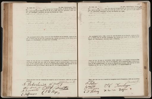 Op heden den Vijfden Mei des Jaars Achttienhonderd Dertig, des mongers ten Elf uren, zijn voor ons Ondergeteekende, als Lid van den Raad dezer Stad, daartoe ingevolge de Besluiten van Z. M. van 14 Febr. 1823, No. 59 en van 11 Jan. 1828 No. 108, gedelegeerd, verschenen, ten einde een Huwelijk aan te gaan, Hendrik Haberlandt. Kastenmaker, Geboren in wonende Achier, End Drie en Twintig Jaren (ged ieuwekerk 22 April 1807) Meerderjarige zoon van Hendrik Haberlandt, overleden es en Anna Roerman Margelhoudster, wonende Alhier. ter Eene; Maria Dorothea Aarhold. Dienstoode, Geboren en wonende Achier, Oud Twee en Veertig Jaren /gedt Noorderkerk 20 April 1788) Meerderjarige Dochter van Christotte Aarhold, en Beatrie Hoop beiden overleden. ter andere zyde. En konderteerde de Moeder hes bruidegoms personn in dezen Echt. De voorafgaande Acten, welke, nevens het zesde Hoofdstuk van het Huwelijk, volgens de We van 25 Ventose van het Jaar Elf, voorgelezen zijn, bestaan; ten eersten: in een Extract uit het Register der Afkondigingen, behoorlijk zonder verhindering Ackiergeschied den Vyfentwintig April El en twee dezer. ten 2dende Doopcedullen der verloofden ten 3den de Doodcedal des vaders van den brendegom ten taen de Dooscedullen der ouders van de bruid di ons met de ondergemelde getuigen onder aan bos van iede verklaarde een dood, of schoon onbekendteid der plaats van overlyden of laatste woonplaats hare Groot Onders.- waarna wij hun, bij name en afzonderlijk, hebben afgevraagd: of zij elkander aannamen als Man en Vrouw; het welk door hun; ieder in het bijzonder, met ja beantwoord zijnde, hebben wij in naam der Wet uitspraak gedaan: dat zij door het Huwelijk zijn vereenigd; alles ingevolge het derde Hoofdstuk der Wet van 20 Ventose, van het Jaar Elf, en in tegenwoordigheid van Christiarus Hoffreeger, broodbakker, oud Negen en veertig, Hendrik Joosting, kleevermaker, ond zes en Veertig, Carl Wilhelm Angust Schwarts kastermaker, oud Negenenveertig, in Cevel fretro Engelbertus Lange, Timmerman oud Die en twintig Iaren Allen worende Actier. „ .„Zijnde deze Acte door ors vervaardigd en voorgelezen aan de Comparanten, welke met ons hebben geteekend. A: Haberlandt H Joosting Tnsonten MD Aartel C: WA Schoort D Viermond C J E Langer C Stoffreegen 135. Op heden den Vyfden Mei des Jaars Achttienhonderd Dertig, 1 t Stad, daartoe ingevolge, de Besluiten van Z. M. van 14 Fchr, 1823, No. 59 en van 11 Jan. 1828,C des morgens ten Elf uren, zijn voor ons Ondergeteekende, als Lid van den Raad dezer8o No. 108, gedelegeerd, verschenen, ten einde een Huwelijk aan te gaan, Hendrik Blom. Beeldhouwer, geboorte plaats on„ bakend, wonende Achier, oud Vier en Twintig Iaren, Meerderjarige zoon van Hendrik Bom. - en. beiden abbent. ter Eene En. Zara Veereling. - Dierstbode, Geboorte plaats onbe kend wonende Altier, oud Zevenen Twintig Iaren Meerderjarige Dochter van Hendrik Veerelinge en Elisabeth van Leeuwen beiden overleden ter andere zijde. De voorafgaande Acten, welke, nevens het zesde Hoofdstuk van het Huwelijk, volgens de Wit van 25 Ventose van het Jaar Elf, voorgelezen zijn, bestaan, ten eersten: in een Extract uit het Register der Afkondigingen, behoorlijk zonder verhindering Alhir geschied den Vyf entwintig April El en tweeden dezer ten 2den Extracten uit de registers der administratie van de stads bestedilingen waaruit constiert de onderdom der verloofden. — die ons met de ondergemelde getui„ gen onder aanbod van iede verklaarden de onbekendheid van het aan wezen der ouders en Groot Ouders van den brundegom; en den dood of schoor onbekendheid der plaats van overlyden of laatste woonplaats harer Ouders in Groot Ouders.- waarna wij hun, bij name en afzorderlijk, hebben afgevraagd: of zij elkander aannamen als Man en Vrouw; het welk door hun, ieder in het bijzonder, met ja beantwoord zijnde, hebben wij in naam der Wet uitspraak gedaan: dat zij door het Huwelijk zijn vereenigd; alles ingevolge het derde Hoofdstuk der Wet van 20 Ventose van het Jaar Elf, en in tegenwoordigheid van Jan Plugers, beildhouwer, Oud Drie en Dertig Carel Fredrik Helweg, kastermaker, nde Negens Een Twintig, Jan Coerraad Tuijnebuijn, Schoenmaker Oud Acht en twintig en Hendricus van der Heijder broodbakker, Oud Dertig Jaren. — Allen worende Alzier. ,welke met ons hebben Zijnde deze Acte door ons vervaardigd en voorgelezen aan de Compa geteekend. VanWinter. H Blomr 9 Junebuipn P Hurleng F:O J: PEuezers. H Van der Heyden P: F: Helweg