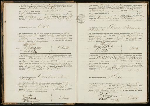 Op heden den Achtten November Achttienhonderd Drie-en-Veertig, is voor ons ondergeteekende Ambtenaar van den Burgerlijken Stand der Stad Amsterdam, verschenen: lo Roeli van beroep koopman oud vifentwintig Jaren, wonende Singel Kanton 3 Op den No. 187 welke heeft verklaard dat — of den dezer des na middags ten twee ure, in het huis staande als booe is geboren een kind van het magplik geslacht, ui Louisa Maria Rietveld van beroep gun wonende als boven zijn echtgenoot velkindig gervond oude Otto var welke Verklaring wij deze Akte hebben opgemaakt in tegenwoordigheid van Abrakam alt harar van der Vier van beroep hakelaar oud achtendertig Jaren, wonende O.Z. Voorburgwak 17 en van Boctius Iynatius Klin van beroep commissionair oud tweenvyftig Jaren, wonende Kerkstraat N 333 en is deze Akte door ons, benevens den Vader en de Getuigen, na voorlezing onderteekend. Ottohaelsts A W Van der Wel Deutz. B. I. Klyn Op heden den Echtstin November Achttienhonderd Drie-en-Veertig myf is voor ons ondergeteekende Ambtenaar van den Burgerlijken Stand der Stad Amsterdam, verschenen Slanshunnissen ookgenaamd Thunissen van beroep Smid oud Llerk Jaren, wonende loovensteeg Kanton 3 No. 1, welke heeft verklaard dat — op den Zesdig dezer des na middags ten zaht ure, in het huis, staande als boven is geboren een Kind van het vrouwelyk geslacht, uit linna Cheresia Lensen van beroep gun wonende als boven zyn echtgenoote welk kind ial getaamd worden Anna Francisca endrika van welke Verklaring wij deze Akte hebben opgemaakt in tegenwoordigheid van Coenraad Willem subert van beroep smid oud vegendertig Jaren, wonende her N 101 en van Abrahan van Vliet van beroep smaid oud vifenviftig Jaren, wonende N. Z. Achterbwal N363 en is deze Akte door ons, benevens den Vader de Getuigen, na voorlezing onderteekend. Thumissen C W Libert Deutz A Van Op heden den lettitig November Achttienhonderd Drie-en-Veertig, is voor ons ondergeteekende Ambtenaar van den Burgerlijken Stand der Stad Amsterdam, verschenen: Cornilia Neis van beroep vroedvrouw oud viftig Jaren, wonende O.Z. Achterburgwal Kanton1 No. E21 welke heeft verklaard dat in hantegenwoordigheid op den Vyfden dezer des middags ten twaalf ure, in het huig, staande koote Singel N. 264 is geboren een kind van het Vrouwelijke geslacht, uit Anna Elizabet Ryjs van beroep gun wonende alshoern welk Kind zal genaamd worden Carolina Anna Elizabet van welke Verklaring wij deze Akte hebben opgemaakt in tegenwoordigheid van Petrr dhannesfredericus Fuchs van beroep kantoorbediende oud zegentwintig Jaren, wonende haarlemmerdijk N 103. en van Roilon Hessing van beroep kastenmaker oud Dertig Jaren, wonende Noorderstraat N 10 en is deze Akte door ons, benevens dHangufsten de Getuigen, na voorlezing onderteekend. C Neir JJ F: Fach Deutz A Berkne Op heden den Achtstig November Achttienhonderd Drie-en-Veertig, is voor ons ondergeteekende Ambtenaar van den Burgerlijken Stand der Stad Amsterdam, verschenen: HbliseEfens uuur van beroep kleermaker oud zevenedertig Jaren, wonende Marmorsstraat Kanton No. 121, welke heeft verklaard dat— op den Zesdin dezer des na middags ten vier ure, in het huis, staande alsbovent is geboren een kind van het marrelyke geslacht, uit Hebé Sronk van beroep gun wonende als boven zine echtgenoote welk kind aal gemaand warden Hage van welke Verklaring wij deze Akte hebben opgemaakt in tegenwoordigheid van Jan Boirs van beroep gran oud zevenzestig Jaren, wonende Warmarrstraat N 97 en van Hindrik Winsegvrs van beroep Commissionair oud Driendertig Jaren, wwonende bZ. Voosburgval N13 en is deze Akte door ons, benevens denvader de Getuigen, na voorlezing onderteekend. A Stuin Jan Boers Dentz A Wennegers