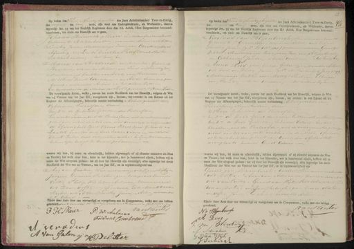 Op heden den Twee enTwintig Augustus des Jaars Achttienhonderd Twee-en-Dertig, des morgens ten tien uren, zijn voor ons Ondergeteekende, als Wethouder, daartoe ingevolge Art. 95 van het Stedelijk Reglement door den Ed. Achtb. Heer Burgemeester benoemd: verschenen, ten einde een Huwelijk aan te gaan, Johann Heinrich Meier. Suikersrafnadeursknecht Geborem te Schledehausem, wonende Alhier, oud AchtenTwintig Jaren, Meerderjarige Zoom van Christian Meijer Afwezig, en Luise Dorothea Potts, werkster teSchledehausen. - ten Eene; En Maria van Bredérode, winkelierster , Geboren te Haarlem, wonende Alhier, oud Twee en Twintig Jaren Meerderjarige Dochter van Dirk van Brederode, in Militoire Dienst Overleden - en Alida Schraders, geen beroep, wonende Alhier.- ten andere zyde.— En konsenteerde de Moeder der Bruid personeel in dezen EchtDe voorafgaande Acten, welke, nevens het zesde Hoofdstuk van het Huwelijk, volgens de Wet van 25 Ventose van het Jaar Elf, voorgelezen zijn, bestaan, ten eersten: in een Extract uit het Register der Afkondigingen, behoorlijk zonder verhindering Alhier geschied den Vyfden en Twaalfden dezer ten 2en de Geboorte Cedullen der Verloofden En verklaarden ons de Verloofden met de ondergemelde getuigen onder aanbod van eede namelyk eerstgemelde de afwezigheid zyns vaders zedert zyne geboorte en Laatst gemelde den dood haars vaders in militaire Dienst zonder daar van echter instaat te zyn hier van eenbehoorlyk bewys te kunne produceren.— waarna wij hun, bij name en afzonderlijk, hebben afgevraagd: of zij elkander aannamen als Man en Vrouw; het welk door hun, ieder in het bijzonder, met ja beantwoord zijnde, hebben wij in naam der Wet uitspraak gedaan: dat zij door het Huwelijk zijn vereenigd; alles ingevolge het derde Hoofdstuk der Wet van 20 Ventose, van het Jaar Elf, en in tegenwoordigheid van Arij van Jaalen Timmerman, oud zes en zestig. Jurgen Heinrich Pelster, geen beroepg oud zeven en Veertig Philip Wil helvy Aulman, kleerenmaker oud zesen vyftig, en Friedrictn Eisenbrand varken Slagten, oud Achten Twintig Jaren.- Allen wonende JAlhier.— Zijnde deze Acte door ons vervaardigd en voorgelezen aan de Comparanten, welke met ons hebben geteekend verklarende de Echtgenoote niet te kunnen schryve vantinter J H Mreier P: W: Anbouwr Twiedene Cosenbrand F Averdsins A Van Galen y op A Belster Op heden den Twee en Twintig Augustus des Jaars Ao eid Twee-en-Dertig, des morgens ten tien uren, zijn voor ons Ondergeteekende, als Wethouder, daartoe ingevolge Art. 95 van het Stedelijk Reglement door den Ed. Achtb. Heer Burgemeester benoemd verschenen, ten einde een Huwelijk aan te gaan, Nicolaas van Blijenburgh, Timmermansknecht Geboren te 's Gravenhage, wonende Alhier, oud zes en Twintig Jaren (ged:t 27 Oct=r 1805) weduwenaar van Gerritje Dekker, Meerderjarige zoom van Jan van Blyenburgh en Catharina Jansen. — beide Overleden. — ter Eene En Anna Boos geen beroep, Geboren en wonende Achien oud Drie en Dertig Jaren /ged=t Noorderkerk 2 Juny 1799. Meerderjarige Dochter van Mattijs Roos, en Elbrigie van Swacten. — beide overleden. — ter andere zyde. De voorafgaande Acten, welke, nevens het zesde Hoofdstuk van het Huwelijk, volgens de Wet van 25 Ventose van het Jaar Elf, voorgelezen zijn, bestaan, ten eersten: in een Extract uit het Register der Afkondigingen, behoorlijk zonder verhindering Achier geschied den Twaalfden Negentienden dezer te 2 Doop bedullen der Verloofden ten 3en de Dood Cedul der vorige Echtgenoote de Boruudegon ten 4=en de Dord Cedullen hunner Ouders: En ver klaarden ons de Verloofden, met de ondergemelde getuig onder aanbod van eede verklaarde den dood, ofschoon onbekendheid der plaats van Overlyden oflaatste woonplaats hunner Groot Ouders.waarna wij hun, bij name en afzonderlijk, hebben afgevraagd: of zij elkander aannamen als Man en Vrouw; het welk door hun, ieder in het bijzonder, met ja beantwoord zijnde, hebben wij in naam der Wet uitspraak gedaan: dat zij door het Huwelijk zijn vereenigd; alles ingevolge het derde Hoofdstuk der Wet van 20 Ventose van het Jaar Elf, en in tegenwoordigheid van Gerard van Blyenburgh, broeder Timmmermansknecks oud Dertig. Adriaan Adriaans, kantoorbediende oud vierendertig, Gerrit van Wyk, Broodbokker, oud drie en Dertig; en Jan Sieborgh, geen beroep, oud Twee een vyftig Jaren. — Allen wonende Alhier Zijnde deze Acte door ons vervaardigd en voorgelezen aan de Comparanten, welke met ons hebben geteekend. van Winter N v Blenburgh 1 A Roos J: Van Blijenburgz A Adriaans K: G Van Wijk ieter