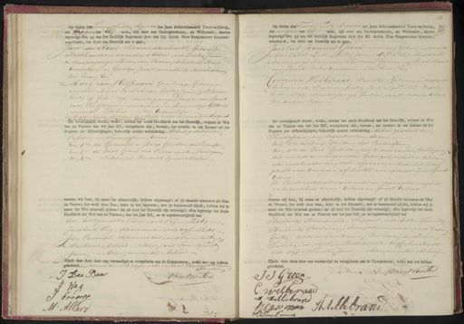 waarna wij hun, bij name en afzonderlijk, hebben afgevraagd: of zij elkander aannamen als Man en Vrouw; het welk door bun, ieder in het bijzonder, met ja beantwoord zijnde, hebben wijin aaan der wder uiepruak gelaun: det zij door het Mumelijk uin vereenign, ales ingevoige het derde Hoofdstuk der Wet van 2e Ventose, van het Jaar Ek, en in tegenwoordigheid van der Echtgenootes Vader / oud Vyfen Zestig Jacobus Weg, schoenmaker joud vyfenveertig Jan Broerder, Schoenmaker, oud Tweeendertig, en Martinus Allard. Idem, oud Tweeen & Twintig Jaren: — Allen wonende Alhier— Zijnde deze Acte door ong vervaardigd en voorgelezen aan de Comparanten, welke met ons hebben gemekend verklarende de Echtgenoote en haar vader niet te kunnen schryven J Dee Buer van Kinter JWe J broerst 5„ M: Allard Op heden den Twee en Twintig Augustus des Jaars A d Twee-en-Dertig, des voorgens ten tig uren, zijn voor ons Ondergeteekende, als Wethouder, daartoe ingevolge krt. 95 van het Stedelijk Reglement door den Ed. Achtb. Heer Burgemeester benoemd: verschenen, ten einde een Huwelijk aan te gaan; Jan de Boer. Schoenmakersknecht, geboren te Holthansen, wonende Achier, oud Dertig Jaren Meerderjarige Zoom van Harin Alberts de Boer Overleden, en Grietje Jans, wonende te Holthaizen, ten Eene En¬ Mary van Vlissingen. Geem beroep, Geboren, en wonende Achier, oud Acht en Dertig Jaren (ged: Noorder. kerk 19 febr:i 1794) Meerderjarige Dochter van Barent van Vlissingen, winkelier, en Lammertje Godtwals, wonende Alhier - ten Eendere zyde. Een konsenteerde de vader der Bruid mede in naam zyner Echtgenoot versopeel in dezen Echt. De vooralgaande Acten, welke, nevens het zesde Hoofdstuk van het Huwelijk, volgens de Wet van 25 Ventose van het Jaar Elf, voorgelezen zijn, bestaan, ten eersten: in een Extract uit het Register der Afkondigingen, behoorlijk zonder verhindering Alhier geschiedden Vyfden en Twaalfden dezer ten 2en de Geboortd en Doop Cedullem der Verloofden ten 3= de Dood Cedue des Vaders van den Bruidegom ten 4en Notarieel konrent zyner Moeder„ waarna wij hun, bij name en afzonderlijk, hebben afgevraagd: of zij elkander aannamen als Man en Vrouw; het welk door bun, ieder in het bijzonder, met ja beantwoord zijnde, hebben wijin aaan der wder uiepruak gelaun: det zij door het Mumelijk uin vereenign, ales ingevoige het derde Hoofdstuk der Wet van 2e Ventose, van het Jaar Ek, en in tegenwoordigheid van der Echtgenootes Vader / oud Vyfen Zestig Jacobus Weg, schoenmaker joud vyfenveertig Jan Broerder, Schoenmaker, oud Tweeendertig, en Martinus Allard. Idem, oud Tweeen & Twintig Jaren: — Allen wonende Alhier— Zijnde deze Acte door ong vervaardigd en voorgelezen aan de Comparanten, welke met ons hebben gemekend verklarende de Echtgenoote en haar vader niet te kunnen schryven J Dee Buwr van Kinter Op heden den Twee en Twintig Augustus des Jaars Achttienhonderd Twee- en-Dertig, des morgens ten Ee uren, zijn voor ons Ondergeteekende, als Wethouder, daartoe 1 ingevolge Art. 95 van het Stedelijk Reglement door den Ed. Achtb. Heer Burgemeester benoemd; verschenen, ten einde een Huwelijk aan te gaan, Jacobus Joannes Groen. Zeeman, Geboren en wonende Alhier oud Zes en Dertig Jaren, Ged=e Pool 31 Maart 1896) Meerderjarige zoom van Antonie Groem, en Anna Maria van Leelt. beide overleden. — ten lene; in Cornelia Welberaad: Vaarsten , Geboren en wonende Etehier, oud Negenen Dertig Jaren (ged=t N: Z: Kapel 12 Mei 1793) Meerderjarige Dochter van Onbekende Onder ter andere zyde. De voorafgaande Acten, welke, nevens het zesde Hoofdstuk van het Huwelijk, volgens de Wet van 25 Ventose van het Jaar Elf, voorgelezen zijn, bestaan, ten eersten: in een Extract uit het Register der Afkondigingen, behoorlijk zonder verhindering ehwod geschied den Twaalfden en Negentienden dezer ten 2en de Doop Cedullen der Verloofden ten 3=en de Dood Cedullen der Ouders van den Bruidegom die ons met de ondergemelde Getuigen onder aanbod van eede verklaarde den dood, ofschoom onbekendheid der plaats van overlyden of laatste woonplaats zyner Groot Ouders. De Bruid verklaarde ons mede in opgemelde voege de onbekendheid harer Ouders en Groot Ouders. waarna wij hun, bij name en afzonderlijk, hebben afgevraagd: of zij elkander aannamen als Man en Vrouw; het welk door hun, ieder in het bijzonder, met ja beantwoord zijnde, hebben wij in naam der Wet uitspraak gedaan: dat zij door het Huwelijk zijn vereenigd; alles ingevolge het derde Hoofdstuk der Wet van 20 Ventose van het Jaar Elf, en in tegenwoordigheid van Hendrik Hillebrand, Tappen, oud Acht en Twintig Hendrik Bosman, Scheepstemmerman, oud Eenen Dertig; willen Lankman, zeeman, oud zes en Twintig, en Anton Hillebvand, koffyhuiskuecht oud vyfen Twintig Jaren. — Allen wonende Alhier, Zijnde deze Acte door ons vervaardigd en voorgelezen aan de Comparanten, welke met ons hebben geteekend. anWanter J J Groen Wilberaad A Wellebrups CBsomman Pllebrang W