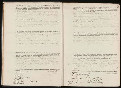 Op heden den Vyf en Twintig Januarij des Jaars Achttienhonderd Twee-en-Dertig, des morgens ten Elf uren, zijn voor ons Ondergeteekende, als Wethouder, daartoe ingevolge Art. 95 van het Stedelijk Reglement door den Ed. Achtb. Heer Burgemeester benoemd; verschenen, ten einde een Huwelijk aan te gaan, Jan Johannis Mastermaker, Geboren en wonende Achier, Oud Vyftig Iaren (ged=t Oude kerk 20 Jan 1782) weduwenaar van Grietje Elshof, Meerderjarige zoon van Jan Iohannis- en Labiena Mom beide overleden. — ter Eene—En Eliesabet Knebel. Geenberoep, Geboren en wonende Achier, Oud Pier en Dertig Jaren ged=t Oosterkerk 28 Jani 1798) weduwe van Jan de Lange, Meerderja- rige Dochter van Hendrik Knebel.- en Johanna Tiraalman. - beide overleden.— ter andere zijde De voorafgaande Acten, welke, nevens het zesde Hoofdstuk van het Huwelijk, volgens de Wet van 25 Ventose van het Jaar Elf, voorgelezen zijn, bestaan, ten eersten: in een Extract uit het Register der Afkondigingen, behoorlijk zonder verhindering Alhurgeschied den Vyftienden en Twee en Twintigsten dezer. ten 2dende Doopcedullen der verloofden. ten 3derde Doorke zullen hunner vorede Echtgenooten ten 4den die hunner Onders: En verklaarden ont de verloofden met de ondergemelde getuigen onder aanboe van iede den dood, of schoon en bekendheid der plaats van overlijden of laatste woonplaats hunner Goot Oiders. waarna wij hun, bij name en afzonderlijk, hebben afgevraagd: of zij elkander aannamen als Man en Vrouw; het welk door hun, ieder in het bijzonder, met ja beantwoord zijnde, hebben wij in naam der Wet uitspraak gedaan: dat zij door het Huwelijk zijn vereenigd; alles ingevolge het derde Hoofdstuk der Wet van 20 Ventose, van het Jaar Elf, en in tegenwoordigheid van Fredrik Johannes, broeder, Winkelier, Oud Zeven en Veertig i Jacobus Geryzelaar, Me Metselaar, Oud Twee en Vyftig Heidrik Geijzelaar, Idem, Oud Twee en Dertigen en Volkert van Halm, Masten- maker, Oud ZesenDertig Jaren. — Allen wonende Alhier. Zijnde deze Acte door ons vervaardigd en voorgelezen aan de Comparanten, welke met ons hebben geteekend. vanwenter I Johannes E knebeb H: Johannes J: Gryzeliar Vt van Halen H= Gayzelaar 8 Op heden den Vyf en Twintig Januari des Jaars Achttienhonderd Twee en Dertig desmorgens ten Elf uren, zijn voor ons Ondergeteekende, als Wethouder, daartoe ingevolge Art. 95 van het Stedelijk Reglement door den Ed. Achtb. Heer Burgemeester benoemd verscheen, ten einde een Huwelijk aan te gaan, Conrad Friedrich Timmering Broodbakker Geboren te Holzhansen in Minden, wonende Actier, Ou„ Circa Acht en Twintig Jaren, Meerderjarige zoon van Johann Hermann Timmering. - Landbouwer, wonende te Holzhausen en wijlen Anne Marie Charlotte Möller ter Eenen Alida van Laalen. Geenberoep, Geboren en wonende Alhier, Ond Eenen Dertig Jaren (ged: Westerkerk 4 De cember 1801) Meerderjarige Dochter van Dirk van Daalen. - overleden.en Hanna Drom. — Naarster wonende Achier.— ter andere zijde En konsenteerde de Moeder der bruid personeel in dezer Echt„ De voorafgaande Acten, welke, nevens het zesde Hoofdstuk van het Huwelijk, volgens de Wet van 25 Ventose van het Jaar Elf, voorgelezen zijn, bestaan, ten eersten: in een Extract uit het Register der Afkondigingen, behoorlijk zonder verhindering Alhier geschieee der Vyftienden en Twee en Twintig dezer. Den 2dende Doopcedullen der verloofden: die des bruidegoms mede inhoudende de Doodcidul zyner Moeden en konsent zyns Vaders. ten 3dende Doodcedul des Vaders van de bruid. waarna wij hun, bij name en afzonderlijk, hebben afgevraagd: of zij elkander aannamen als Man en Vrouw; het welk door hun, ieder in het bijzonder, met ja beantwoord zijnde, hebben wij in naam der Wet uitspraak gedaan: dat zij door het Huwelijk zijn vereenigd; alles ingevolge het derde Hoofdstuk der Wet van 20 Ventose van het Jaar Elf, en in tegenwoordigheid van Georg Keiser Kaarsenmaker, Oud Vyfen Veertig Jan van Bruinessen, kruiderier, And Vyfen Dertig Herricus Adrianus Brons, Tapper, Oud Zeven en Twintig en en Iohannes Besseling, Convanting man, oud Zestig Jaren. — Allen wonende Alhier. Zijnde jdeze Acte door ons vervaardigd en voorgelezen aan de Comparanten, welke met ons hebben geteekend. van Winter CP Timman a van daalen Jvan Bruinessen H A. Brone anna Drom Joh Besselingg 910.
