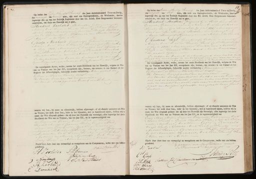 Op heden den Vijfen Twintig Januari des Jaare Achttienhonderd Twee-en-Dertig, des middags ten twaalf uren, zijn voor ons Ondergeteekende, als Wethouder, daartoe ingevolge Art. 95 van het Stedelijk Reglement door den Ed. Achtb. Heer Burgemeester benoemd; verschenen, ten einde een Huwelijk aan te gaan, Hendrik Koolsted. Heelmeester, Geboren en wonende Alhier, Oud Zeven en Twintig Jaren (ged:t Evang: Lutt. 13 Mei 1804) Meerderjarigen zoon van Hendrik Koolsted Jun:r - Heelmeester- en Johanna van Houten wonende Alhier. — ter Elpe. — En Grietje Nienhuis. Geenberoep, Geboren en wonende Alhier, Oud Drie en Twintig Saren, (ged:t Westerkrk 10 July 1808) Meerderjarige Dochter van Gerardus Jan Nienhuis- overleden. — en Elisabeth Dornbeek Winkelierster. - wonende Alhur ter andere zyde En konsenteerden de Vader des bruidegoms mede in naam zyner Echtgenoot- en de Moeder der brend personeel in dezen Echt De voorafgaande Acten, welke, nevens het zesde Hoofdstuk van het Huwelijk, volgens de Wet van 25 Ventose van het Jaar Elf, voorgelezen zijn, bestaan, ten eersten: in een Extract uit het Register der Afkondigingen, behoorlijk zonder verhindering Alhier geschied den Vyftien en Twee en Twintig dezer ten 2dende Doopsen dullen der verloofden ten 3dende DoodCedul des Vadere van de bruid waarna wij hun, bij name en afzonderlijk, hebben afgevraagd: of zij elkander aannamen als Ma- en Vrouw; het welk door hun, ieder in het bijzonder, met ja beantwoord zijnde, hebben wij naam der Wet uitspraak gedaan: dat zij door het Huwelijk zijn vereenigd; alls ingevolge het derd Hoofdstuk der Wet van 20 Ventose, van het Jaar Ek, en in tegenwoordigheid van des Echtgenoots Vader Oud Zes en Zestig Samuel Arnoldus Cramer, Heil en Vroedmeester Zwager des Echtgelogts, omd Eenen Dertig Jacobus Peterseh van Rems, zwager der Ehtgenooten Boekhouder, Oud Zesen Twintig en en gelardus Cotteter, On Drie en waarna wij hun, bij name en afzonderlijk, hebben afgevraagd: of zij elkander aannamen als Man en Vrouw; het welk door bun, ieder in het bijzonder, met ja beantwoord zijnde, hebben wijn naam der Wet uitspraak gedaan: dat zij door het Huwelijk zijn vereenigd; alls ingevolge het derde Hoofdstuk der Wet van 20 Ventose, van het Jaar Ek, en in tegenwoordigheid van des Echtgenoots Vader Oud Zes en Zestig Samuel Arnoldus Cramer, Heil en Vroedmeester Zwager des Echtgelogts, omd Eenen Dertig Jacobus Peterseh van Rems, zwager der Ehtgenooten Boekhouder, Oud Zesen Twintig en en gelardus Antonius van Meurs, Apotheker, Ond Drie en Dertig Jaren. — Allen wonende Alhier. Zijnde deze Acte door ons vervaardigd en voorgelezen aan de Comparanten, welke met ons hebben geteekend. vanwinter H: Voolsted. I A kramer J: Dretersen van Remf T Nienhuys G: A=o Van Meurs J Koolszod Dornheck Op heden den ZevenenTwintig Januarij des Jaars Achttienhonderd Twee en Dertig, ta des morgens ten Elf uren, zijn voór ons Ondergeteekende, als Wethouder, daartoe ingevolge Art. 95 van het Stedelijk Reglement door den Ed. Achtb. Heer Burgemeester benoemd: verscher en, ten einde een Huwelijk aan te gaan, Hendrik Voosten. proponent by de Herst: Evang: Luth Gemeente, Geboren en wonende Achier, Oud Circa Acht en Twintig Iaren (ged:t Herst: Luth: 29 febr. 1804) Meerderjarige zoon van Jan Hendrik Poosten, buitenberoep, in Maria Iohanna Heurman, wonende Altier. - ter Eene, En hristina Seyl. Geerberoep, Geboren en wonende Alhier, Oud Drie en Twintig Jaren (ged:t Herst: Lutt 7 Sept: 1308) Meerderjarige Dochter van Anthon„ Geijl. — in Johanna Heurmans - beide Overleden ter ondere zijde. En hebbende Ouders desbruidegoms door zich te buiten staat ten raadhurze te verschijnen, aan den daarloe door ons gedelegeerden Ambtenaar verklaard te konsenteren in dezen Echt De voorafgaande Acten, welke, nevens het zesde Hoofdstuk van het Huwelijk, volgens de Wer van 25 Ventose van het Jaar Elf, voorgelezen zijn, bestaan, ten, eersten: in een Extract uit het Register der Afkondigingen, behoorlijk zonder verhindering Alhier geschied den Vyftienden en Twee en Twintigsten dezer. ten 2dende Doopsedullen der verloofden. ten Idende Doodcedullen der Ouders van de bruid: die ons met de ondergemelde getuigen onder aanbod van eede verklaarde den dood, ofschoon onbekendheid den plaats van overlijden of laatste woonplaats harer Groot Ouders.— waarna wij hun, bij name en afzonderlijk, hebben afgevraagd: of zij elkander aannamen als Man en Vrouw; het welk door hun, ieder in het bijzonder, met ja beantwoord zijnde, hebben wij in naam der Wet uitspraak gedaan: dat zij door het Huwelijk zijn Vereenigd; alles ingevolge het derde Hoofdstuk der Wet van 20 Ventose van het Jaar Elf, en in tegenwoordigheid van Georg Adam Meijer, Zwager der Echtgenoote Onderwyzer, Oud Acht en Twintig — Gerrit Hendrik Wiede, Neef des Echtge„ noots, Metselaar, Oud Twee en Vyftig Harmanus koops Smit, Apotheker, Ond Zeven en Twintig en Antonie Johannes Christiaan van Tuijll, Geemplogeerde bij het Amortisatie Syndikaat, Oud Eenen Twintig Jaren Allen wonende Achier. Zijnde deze Acte door ons vervaardigd en voorgelezen aan de Comparanten, welke met ons hebben geteekend. Ay in dispositie van den Heer Wethouder voormeld De Staatsraad Burgeweesser. H: Joosten Vande Pole Geyl „ Anthonie Joh: Christiaan van Suyle G: H Meuer. JH: Wiese 41
