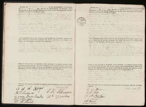 Op heden den VyfenTwintig Januarij - des Jaars Achttienhonderd Twee en-Dertig. des morgens ten Elf uren, zijn voor ons Ondergeteekende, als Wethouder, daartoe ingevolge Art. 95 van het Stedelijk Reglement door den Ed. Achtb. Heer Burgemeester benoemd; verschenen, ten einde een Huwelijk aan te gaan, Johann Henrich Wilhelm Boger Suikernafina deursknect Geboren te Erten in Lippe, wonende Alhier, Oud Eenen Dertig Jaren, Meerderjarige zoon van Johann Henrich, Boger overleden- en Anne Marie Elisabeth Kronen, Landbouw, ster, wonende te Erten. — ter Eene. — En Parbara Jacoba Laban. - Geenberoep, Geboren en wonende Achier, Oud Eenen Veertig Jaren (ged:t Waalvt Gem:e 8 Sept: 1790) Meerderjarige Dochter van Jaques Laban, overleden. - en Gerrardina van den Eden, Naaister, wonende Achier.- ter andere zijde En konsenteerden hunne Moeders personeel in dezen Echt„ De voorafgaande Acten, welke, nevens het zesde Hoofdstuk van het Huwelijk, volgens de We van 25 Ventose van het Jaar Elf, voorgelezen zijn, bestaan, ten eersten: in een Extract uit het Register der Afkondigingen, behoorlijk zonder verhindering Alhier geschied der Achtsten en Vyftienden dezer ten 2dende Doopcedullen der verloofden ten 3din de Doodsezullen hunner Vaders ten Hder de GeboorteCedul van Jacoba Maria Elizaben Boger. Alhier Geboren 22 December 1831. welk kind de verloofden ons verklaarden bij deze te Echten. waarna wij hun, bij name en afzonderlijk, hebben afgevraagd: of zij elkander aannamen als Man en Vrouw; het welk door hun, ieder in het bijzonder, met ja beantwoord zijnde, hebben wij in naam der Wet uitspraak gedaan: dat zij door het Huwelijk zijn vereenigd; alles ingevolge het derde Hoofdstuk der Wet van 20 Ventose, van het Jaar Elf, en in tegenwoordigheid van Jan Schepers, Uitdrager, Oud Acht en Twintigs Fredrik Marrito Droste, Tapper, Oend Twee en Dertig- Johann Henrich Siltmann, Suikerbakker, Ouds Vyf en Twintigen en Hendrik Kersten, Wafelbakder Oud Twee en Veertig Jaren. — Allen wonende Alhier. Zijnde deze Acte door ons vervaardigd en voorgelezen aan de Comparanten, welke met ons hebben geteekend verklarende de Moeder des Echtgenoots niet te kunnen schrijve vanWinter J H W Boger J: H: Sillmann B I Loeban G van Den Ende HK Kersten, S. Scheperz F. M. Droste Op heden den VifenTwintig Januarij des Jaars Achttienhonderd Twee en-Dertig des moogens ten Clfften uren, zin voor ons Ondergeteekende, als Wethouder, daartoe ingevolge Art. 95 van het Stedelijk Reglement door den Ed. Achtb. Heer Burgemeester benoemd: verschet en, ten einde een Huwelijk aan te gaan Cornelius Jerardus Opdam Boekbinder, Geboren te Haarlem, wonende Achier, Oud Eenen Veertig. Iaren weduwenaar van Johanna Dum, Meerderjarige zoon van Cornelis Opdam- en Anna Craaievanger beide P overleden. — ter Eene. — En UrG, Engelberta Maria Frees. Geenderoep, Geboren in 1 wonende Achier, Oud Veertig Jaren (ged:t Boom 14 April 1791) weduwe van Johannes Ooster Meerderjarige Dochter van Casparis Frees, overleden en Elisabeth Lindeman. - geen beroep, wonende Alhier ter andere zijde. En heeft de Moeder der bruid, door zickte buiten Staat ten raadhuize te verschijnen, aan den daartoe door ons gedelegeerden Ambtenaar verklaard, te konsenteren in dezen Echt- De voorafgaande Acten, welke, nevens het zesde Hoofdstuk van het Huwelijk, volgens de Wet van 25 Ventose van het Jaar Elf, voorgelezen zijn, bestaan, ten eersten: in een Extract uit het Register der Afkondigingen, behoorlijk zonder verhindering Achier geschuedt den Vyftienden en Twee en Twintigsten dezer ten zden de Doopsedullen der verloofden. ten 3derde Doodsdullen hunner vorige Echtgenooten. ten tden die der Ouders van den bruidegen: die ons met de ondergemelde getuigen onder aanbod van iede verklaardeden door, of schoon onbekendheid der plaats van overlijden of laatste woonplaats zijner Groot Ouders. ten 5der de Doodcedel des Vaders van de bruid waarna wij hun, bij name en afzonderlijk, hebben afgevraagd: of zij elkander aannamen als Mar en Vrouw; het welk door hun, ieder in het bijzonder, met ja beantwoord zijnde, hebben wij in naam der Wet uitspraak gedaan: dat zij door het Huwelijk zijn vereenigd; alles ingevolge het derde Hoofdstuk der Wet van 20 Ventose van het Jaar Elf, en in tegenwoordigheid van Antonius Bernardus Nrands, Hoedermaker, Oud Eenen Twintig Petrus Gulleman, Timmerman, Oud Zes en Twintig — Otto Brand, Corsettenmaker, Oud Zevenen Vyftig is in Cornelis van Doon, Metselaar Oud Acht en Dertig Jaren. — Allen wonende Actier Zijnde deze Acte door ons vervaardigd en voorgelezen aan de Comparanten, welke met ons hebben geteekend. van Winter le: G: Gpdam C H. Frees A B Bare P Gulleman Otto Brand C van Doort