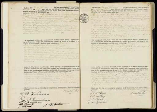 Op heden den Vierden Januari des Jaars Achttienhonderd Twee en-Dertig, des morgens ten Elf uren, zijn voor ons Ondergeteekende, als Wethouder, daartoe ingevolge Art. 95 van het Stedelijk Reglement door den Ed. Achtb. Heer Burgemeester benoemd: verschenen, ten einde een Huwelijk aan te gaan, Heinrich Rudolp Sleckmann Mitselaar, Geboren te Rassum en Hoijk Hannover, wonende Actier, Aud Zeven en Veertig Jaren, weduwenaar van Cattarina Loerman, Meerderjarige zoon van Johann Ladwig Heek nage. - geen beroep wonenden te Bassum. - en vylenGeschen Schweer.- ter Eene En hatrina Klingenheevet. — Gienberoep Geboren in wonende Actien, oud Drie en Dertig Jaren edt Westerkerk 25 febr: 1798) Meerderjarige Dochter van Henderik Klingenheevet en Cattarina Haaring beide overleden. ter andere zijde. De voorafgaande Acten, welke, nevens het zesde Hoofdstuk van het Huwelijk, volgens de Wet van 25 Ventose van het jaar Elf, voorgelezen zijn, bestaan, ten eersten: in een Extract uit het Register der Afkondigingen, behoorlijk zonder verhindering Achurgesheid der Elfden in Achttiender December lt. ten Edende Doopcedullen der verloofden. ten 3den de DoodCedul der vooigevrouwdes buidegoms. ten tden die zijners Moeder ten 5den Notarieel konsent zyns Vaders. ten den de Loodcedullen der Ouders van de bruid: die ons met de ondergemelde getuigen onder dan bod van eede verklaarde den dood, ofschoon onbekendteid der plaats van overlijden of laatste woonplaats tarer Groot.- Oenders. waarna wij hun, bij name en afzonderlijk, hebben afgevraagd: of zij elkander aannamen als Ma en Vrouw; het welk door hun, ieder in het bijzonder, met ja beantwoord zijnde, hebben wij: naam der Wet uitspraak gedaan: dat zij door het Huwelijk zijn vereenigd; alles ingevolge het dere Hoofdstuk der Wet van 20 Ventose, van het Jaar Elf, en in tegenwoordigheid van Franciscus Heerman; Metselaarskrecht, Oud Vieren, Veertig Machuel Burck, Metselaar, End Vyfen Veertigen Ian Wissink, Idem Oud zes en Dertig en Atrie de Poeten, Idem, oud Vyfen Dertig Jaren. — Allen wonende Alhur Zijnde deze Acte door ons vervaardigd en voorgelezen aan de Comparanten, welke met ons hebben geteekend. van Wonter H R Beekans K Klingenheever Frs Beerman M Burch De weten A:d J: Wolhe Op heden den Vierden Januarij des Jaars Achttienhonderd Twee en-Dertig, 6 des morgens ten Elf uren, zin voor ons Ondergeteekende, als Wethouder, daartoe ingevolge Art. 95 van het Stedelijk Regtement door den Ed. Achtb. Heer Burgemeester benoemd; verscher en, ten einde een Huwelijk aan te gaan, Hartog Mozes Staliaander Sjouwer, Geboren en D wonende Achier, Oud Twee en Twintig Jaren, Meerder 5 jarige zoon van Mozes Hartog Haliaander, Overleden NG. en Mietje Mozes Lisse geen beroep, wonende Altier 1 ter Eene — En Mariane Jacob. Workum Geenbrroep, Geboren en wonende Alhier, Oud Twee en Twintig Jaren, Meerderjarige Dochter van Jacob Workam Schoen lapper, en Sara Aron de Iong. - wonende Acteer ter ondere zijde.— En konsenteerden de Moeder des bruidegoms en Ouders der bruid personeel in dezen Echt„ De voorafgaande Acten, welke, nevens het zesde Hoofdstuk van het Huwelijk, volgens de Wet van 25 Ventose van het Jaar Elf, voorgelezen zijn, bestaan, ten eersten: in een Extract uit het Register der Afkondigingen, behoorlijk zonder verhindering Achier veshied den Vyfentwintig December tt en Eersten dezer.— ten dende Getomologeerde geboorte Acte des bruidegoms. ten 3den de Doodfidal zyns Vader. ten Iden degevoortecedel der Beurde waarna wij hun, bij name en afzonderlijk, hebben afgevraagd: of zij elkander aannamen als Man en Vrouw; het welk door hun, ieder in het bijzonder, met ja beantwoord zijnde, hebben wij in naam der Wet uitspraak gedaan: dat zij door het Huwelijk zijn vereenigd; alles ingevolge het derde Hoofdstuk der Wet van 20 Ventose van het jaar Elf, en in tegenwoordigheid van der Echtgenootes Vader Oud Zevenen Veertig Zadok Meyer van Praag, Loteryocrter, Out Eener Veertig Inail Samuel Hoas, Sjouwer, Oud Twee en Veertig en Gerrit Meyer Gersoni, Venten Ond Vyf en zestig Caren. — Allen wonende Achier. Zijnde deze Acte door ens vervaardigd en voorgelezen aan de Comparanten, welke met ons hebben geteekend. verklarende de sehuwden in de ouders niet te kunnen schrijven van Wenter I J Workom L. M. van Buag J. S. Bous J: m: Gersond
