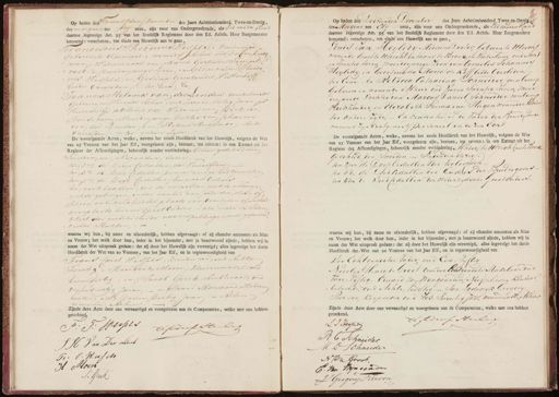 Op heden de Twaalfden December des Jaars Achttienhonderd Twee en Dertig, des morgens ten Vef uren, zijn voor ons Ondergeteekende, als Gid van den Kaar daartoe ingevolge Art. 95 van het Stedelijk Reglement door den Ed. Achtb. Heer Burgemeester benoemd: verschenen, ten einde een Huwelijk aan te gaan. Franciscus Theodorus WesselS. kruidender Geboren te Oldenzaal, wonende Achier, oud Drie en Dertig jaren, Weduwenaar van Maria Gertjudis Trippel. „ voet, Meerderjarige Loon van Franciscus Theodo „rus Wessels, en Gesina Geertrudis Westerhoff, beide overleden. — ter Eene En Joanna Helena van der Linden winkeliersten geboren en Wonende Alhier, oud Zevenen dertig Jaren ged Vreede duufje 10 October 1795) Weduwe van Dirk van Beusekom, Meerderjarige Dochter van Johannes van der Linden en Helena Huysman. - beide overleden. ter andere zijde De voorafgaande Acten, welke, nevens het zesde Hoofdstuk van het Huwelijk, volgens de We van 25 Ventose van het Jaar Elf, voorgelezen zijn, bestaan, ten eersten: in een Extract. uit het Register der Afkondigingen, behoorlijk zonder verhindering Alhier geschiedden Tweedem en Negenden dezer ten 2en de Doop Cedullem der Verloofden ten 3a de Dood bedullen hunner vorige Echtgenooten ten 3en de Dood Cedullen hunner Ouders En verklaarden ons de verloofden met de onderge„ melde getuigen onder aanbod van eede den dood, of schoom onbekendheid der plaats van Overlyden of Laatste woonplaats hunner Groot Ouders. - als mede de Iden titeit der verschillende naamspellingen inde geprodu ceerde stukken, waarna wij hun, bij name en afzonderlijk, hebben afgevraagd: of zij elkander aannamen als Man en Vrouw; het welk door hun, ieder in het bijzonder, met ja beantwoord zijnde, hebben wij in naam der Wet uitspraak gedaan: dat zij door het Huwelijk zijn vereenigd; alles ingevolge het derde Hoofdstuk der Wet van 20 Ventose, van het Jaar Elf, en in tegenwoordigheid van Frans Carel Wessels, kruidenier, oud Achten Twintig: Hendrik Moem, kleerenmaker, oud Eenendertig, en Jacob Griek, Ambtenaar, oud Vyfenveertig Jaren. — en Henri Moichand, Hoeden maker, oud Drieen Dertig Jaren. — Allen wonende Alhier. Zijnde deze Acte door ons vervaardigd en voorgelezen aan de Comparanten, welke met ons hebben geteekend. F: T: Wespels dederste len J H Van Der Linote F: C: Wufen H Moen S: Griek Op heden den Dertienden December des Jaars Achttienhonderd Twee en- Dertig des Morgens ten Elf uren, zijn voor ons Ondergeteekende, als Eidvanden Raar daartoe ingevolge Art. 95 van het Stedelijk Reglement door den Ed. Achtb. Heer Burgemeester benoemd: verschenen, ten einde een Huwelijk aan te gaan, Louis Jan Heylidy Medicina Doctor, Geboren te Utrecht, wonende laart te Utrecht in thans te Broek, in Waterland, oud Acht en Twintig Iaren, mneerderjarige zoon van Cornelis Iohannes Heylidy, en Geertruyda Maria de Koff beide Overleden.- ter Eene: - En Rebecia Catharina Schneider geen beroep Geboren en wonende Alhier, oud Vier en Twintig Jaren, meer derjarige Dochter van Marcus Daniel Schneider van bewoep Boekhouder, en Elizab eth Forma van Hagen wonende Alhier ter andere zyde; — En konsenteerde de Vader der Bruid, mede namens zin Echtgenoot Personeel in dezen Echt De voorafgaande Acten, welke, nevens het zesde Hoofdstuk van het Huwelijk, volgens de Wet van 25 Ventose van het Jaar Elf, voorgelezen zijn, bestaan, ten eersten:in een Extract uit het Regster der Afkondigingen, behoorlijk zonder verhindering Alhier, te Utrecht, en te Broek geschied, den Tweeden- en Wegenden dezer ten zoen de Doop Cedullen der Verloofden- ten 3d„ de Dood cedullen der Ouders der Bruidegoms„ ten 4den de Doodjedullen der wederzijdsche Groot onders„ waarna wij hun, bij name en afzonderlijk, hebben afgevraagd: of zij elkander aannamen als Ma- en Vrouw; het welk door hun, ieder in het bijzonder, met ja beantwoord zijnde, hebben wij in naam der Wet uitspraak gedaan: dat zij door het Huwelijk zijn vereenigd, alles ingevolge het derde Hoofdstuk der Wet van 20 Ventose van het Jaar Elf, en in tegenwoordigheid van Der Echtoenooten Vader oud Een Nyftig Nicolaa Hemi de Groot Oan der Echtgenoote Makelaar oud Twee Vyftig- Eduard van Wyngaarden, Neef, als voren Kantoor „bediende, oud Achten Veertig - en Ian Lodewyk Gregory Pier son, Koopman, oud Zes Twintig Jaren wonende alle Alhier Zijnde deze Acte door ons vervaardigd en voorgelezen aan de Comparanten, welke met ons hebben geteekend. ditderfsterlin L I Heyan R C Schneider M D Schneeder NHa Groot. E. van Wijnoude