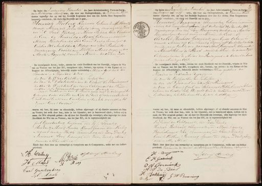 Op heden den zertienden December des Jaars Achttienhonderd Twee en-Dertiig, des Middags ten suhal uren, zijn voor ons Ondergeteekende, als Lid van den stadd daartoe ingevolge Art. 95 van het Stedelijk Reglement door den Ed. Achtb. Heer Burgemeester benoemd; verschenen, ten einde een) Huwelijk aan te gaan, Heinrich Weiberg. Koopman, Geboren te MulheimR wonende Alhier, oud Zes en Twintig Jaren meerderjarig e Zoon van J.C. Fried: Weiberg, en Maria Rahder, beide Everleden ter Eine, - En Hendrika Maas, beboren en wonende Alhier, Winkelierster oud Een in Dertio Iaren /gedt 4 October 1801. Amstelkerk/ Weduwe van Jan Barreveld- meerderjarige Dochter van Willem Maas, weger, en van Maria Bogerts, wonende Alhier — ter andere Zyde De voorafgaande Acten; welke, nevens het zesde Hoofdstuk van het Huwelijk, volgens de Wet van 25 Ventose van het Jaar Elf, voorgelezen zijn, bestaan, ten eersten: in een Extract uit bet Register der Afkondigingen, behoorlijk zonder verhindering Alhier geschied ven Tweeden-„ Negenden dezer. — ten zien de Doop cedullen der Verloofden ten van de Dood cedullen van de Ouders der Bruidegoms ten 4den de Dood cedul der vorige Echtgenoot der Bruid- ten sden, het Notariëel Consentharer Onders Voorts Verklaarde om de Bruidsgom met de ondergemelde getuigen onder aan bod van Ede den dood of schoon on bekend „heid derplaats van Overlyden of laatste woonplaats. zyner Groot Ouders waarna wij hun; bij name en afzonderlijk, hebben afgevraagd: of zij elkander aannamen als Mar en Vrouw; het welk door hun, ieder in het bijzonder, met ja beantwoord zijnde, hebben wij in naam, der Wet uitspraak gedaan: dat zij door het Huwelijk zijn vereenigd; alles ingevolge het derde Hoofdstuk der Wet van a0 Ventose, van het Jaar Elf, en in tegenwoordigheid van Cail Duackenberg Kookman, oud Vyfen Twintig Hendrik Maas, Broeder, Kommissionair oud Dertig Andries van den Bosch Timmerman, oud Zeven en dertig Adrianus Loos, behanger, oud Vieren Veertig Jaren wonende Allen Alhier. Zijnde deze Acte door ons vervaardigd en voorgelezen aan de Comparanten, welke met ons hebben geteekend. dtder sterling H. Weibug DL Josc H Maas Roos Carl quokenberg HC. Maas Op heden den Negentienden December des Jaart Achtienhonderd Zwee en Derij 2 des Morgens ten Elf uren, zijn voor ons Ondergeteekende, als lidvnden Raad daartoe ingevolge Art. 95 van het Stedelijk Reglement door den Ed. Achtb. Heer Burgemeester benoemde verschenen, ten einde een Huwelijk aan te gaan, Henricus Brugman, Schoenmaker, Geboren, en wonende „ Mlhier, oud Vier en Twintig Jaren, /ged: Kerk de Pool 24 November 1808. mneerderjarige zoon van Jan Brugman, overleden, on Agatha I Veermant geen beroep wonende Alhier, - ter Eend— En Elizabet Henrica Groenink, geen beroep geboren en wonende Alhier, oud Een Twintig Iaren / get Kerkt Hart 10 Mei 181 meerderjarige Dochter van Joannes Adol Groenink, Kleermake en Maria Helena de Baus. - wonende Alhier.- ter andere zyde Enkonsenteerden de Moeder der Bruide goms, en de Ouders der bruid personeel in dezen Echt.— De voorafgaande Acten, welke, nevens het zesde Hoofdstuk van het Huwelijk, volgens de Wet van 25 Ventose van het Jaar Elf, voorgelezen zijn, bestaan, ten eersten: in een Extract uit het Register der Afkondigingen, behoorlijk zonder verhindering Alhier geschied een Negenden en Zestienden dezer ten zien de Doopledullen der Verlootden, ten sden de Doddcedul der Vaders de Bruidegoms. ten 4den de Geboorte Cedul van Johannes Wilhelmus Alhier Geboren den Eersten Iuly t welk kind de Verloofden verklaarden by elk anderen te hebben derwekt en by deze te wettigen.— waarna wij hun, bij name en afzonderlijk, hebben afgevraagd: of zij elkander aannamen als Man en Vrouw; het welk door hun, ieder in het bijzonder, met ja beantwoord zijnde, hebben wij in naam der Wet uitspraak gedaan: dat zij door het Huwelijk zijn vereenigd, alles ingevolge het derde Hoofdstuk der Wet van 20 Ventose van het Jaar Elf, en in tegenwoordigheid van Den Vader der Echtgenoote, oud Zes en Veertig Hendrik Bakhuys, Schoenmaker oud Negen en Twintig Bartholomeus Ter Timmerman, oud Twee Twintig Gerrit Willem Bruning Sjouwer oud Negen en dertig Jare wonende allen Alhier Zijnde deze Acte door ons, vervaardigd en voorgelezen aan de Comparanten, welke met ons hebben geteekend. Verklarende de moeder des Echtgenoots niet te kunnen schryven- H. Bruyman Gtder sterlin E H Groenink J A Groenink M H De Baus H Bakhuijs G W Buuning Ter