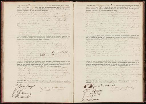 Op heden den Twaalfden December des Jaars Achttienhonderd Twee-en-Dertig, des morgens ten vier uren, zijn voor ons Ondergeteekende, als Lid van den aad daartoe ingevolge Art. 95 van het Stedelijk Reglement door den Ed. Achtb. Heer Burgemeester benoemd: verschenen, ten einde een Huwelijk aan te gaan, Jan Geerling. Blikslager, geboren en wonende Alhijer, oud Eenen, Dertig Jaren /ged=t Noord erkenk 9 December 1801/ Meerderjarige zoon, van Harma„ nus Geerling, Timmerman, wonende Alhier en Wylen kaatje Bardon - ten Eene; En Cornelia Huiser Werkster, Geboren en wonende AAlhier, oud Drie enTwintig Jaren /get Westerkerk 28 Mei 1809) Meerderjarige Dochter van Willem Huiser. koopman te 's Gravenhage, en Wijlen, Aaltje Ebbelin:g. - ten andere zyde. En konsenteerde de vader des Bruidegoms personeel in dezen Echt De voorafgaande Acten, welke, nevens het zesde Hoofdstuk van het Huwelijk, volgens de Wet van 25 Ventose van het Jaar Elf, voorgelezen zijn, bestaan, ten eersten: in een Extract uit het Register der Afkondigingen, behoorlijk zonder verhindering Behier geschiedden Tweeden en Negenden dezer ten 2en de Doop Gedullen der Verloofden ten 3en de Dood Cedullin hunner Moeders enNotarisel, konsent van den Vader der Bruid ten 43 En verklaarde ons de getuigen de Iden titeit der verkeerde Naamstelling. ten 5e de Geboorte Acte van Maltje Huijser Alhier Geboren den 7 February 1830. ik kind de Ver loofden ons verklaarden by elkander te hebben verwekt en by deze te achten waarna wij hun, bij name en afzonderlijk, hebben afgevraagd: of zij elkander aannamen als Man, en Vrouw; het welk door hun, ieder in het bijzonder, met ja beantwoord zijnde, hebben wij in naam der Wet uitspraak gedaan: dat zij door het Huwelijk zijn vereenigd; alles ingevolge het derde Hoofdstuk der Wet van 20 Ventose, van het Jaar Elf, en in tegenwoordigheid van des Echtgenoots Vader, oud Eenen Zestig Willem Gallee, schilder, oud Drieendertig Kriem Somons Kuipers, Bakker, oud vyfen Dertig; F oppe Hendriks, Zeeman, oud Veertig Jaren, - Allen wonende Alhier Zijnde deze Acte door ons vervaardigd en voorgelezen aan de Comparanten, welke met ons hebben geteekend, verklarende de Echtgenoote niet te kunnen schryven J: Geerlings Op heden den Twaalfden December des Jaars Achttienhonderd Twee en- Dertig des morgens ten Eef uren, zijn voor ons Ondergeteekende, als Lid von den saa daartoe ngevolge Art. 93 van het Stedelijk Reglement door den Ed. Achtb. Heer Burgemeester benoemd: verschenen, ten einde een Huwelijk aan te gaan. Christian Henrich Zur Kleinen Schmiede Winkelier, Geboren te Uffelen, wonende Alhier oud Een en Dertig, Meerderjarige zoon van Herman Henrich Zur kleinen Schmiede, en Grethe Maria Mathieving. - beide overleden:- ter Eene, En„ KlaasjeEverts. Dienstbode, Geboren te Hoogeveer Arrond Drentho, wonende Achier, oud Vyfen twintig jaren, Meerderjarige Dochter van Roelop Everts Tuinier, en Geesje Jans Hertman. - wonende te Hoogeveen.— ten andere zyde.- De voorafgaande Acten, welke, nevens het zesde Hoofdstuk van het Huwelijk, volgens de Wet van 25 Ventose van het Jaar Elf, voorgelezen zijn, bestaan, ten eersten: in een Extract uit het Register der Afkondigingen, behoorlijk zonder verhindering eAehier geschiedden Zevenden en Veertienden October L ten 2en de Doop Cedullen der Verloofden ten 3en de Dood tedullen, des Ouders van den Bruidegom die ons met de ondergemelde Getuigen, onder aanbod van eede verklaarde den dood, ofschoon onbekend hui der plaats van Overlyden of laatsste woonplaats zynen Groot Ouders. ten 4 Notarieel konsent der Ouders van de Bruid waarna wij hun, bij name en afzonderlijk, hebben afgevraagd: of zij elkander aannamen als Man en Vrouw; het welk door hun, ieder in het bijzonder, met ja beantwoord zijnde, hebben wij in naam der Wet uitspraak gedaan: dat zij door het Huwelijk zijn vereenigd, alles ingevolge het derde Hoofdstuk der Wet van 20 Ventose van het Jaar Elf, en in tegenwoordigheid van Carel Christiaan Fredrik Berger, Baarscheerder oud Achten Twintig, Hendrik Koelman, Bakker oud zesendertig, Iohannes van Garvel, Speksloger oud Tweeen Dertig, en Johan Georg Philip Hausamp kleerenmaker, oud Drie en Twintig Jaren. — Allen wonende Alhier.— Zijnde deze Acte door ons vervaardigd en voorgelezen aan de Comparanten, welke met ons hebben geteekend. verklarende de Echtgenoote niette kunnen schryven x & H. Jun V leinschmiede Gtderf sterlen CF:. Berger H Koelman J van Jarrel J. Hausam