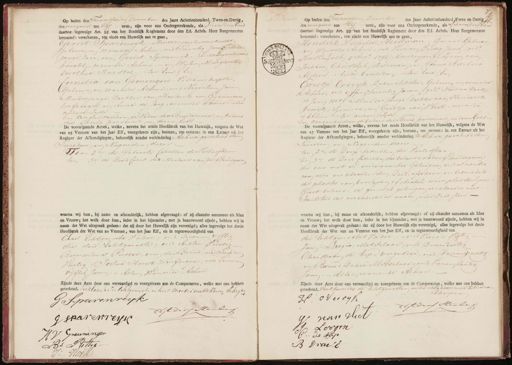 benoemd: verschenen, ten einde een Huwelijk aan te gaan, Gerrit Sparenrijk Houtzaagmolenaarsknacht geboren en wonende Achier, oud Twintig Jaren 1 Minder jarige zoon van Gerrit Sparenrijk, houtzaagmolnaard knecht, wonende Achien, - en Wijlem Margarethe Dorothea Herstel,. ter Eene Ver Cornelia van Groningen. Vischverkoopster, GGeboren en wonende Alhier, oud Negentien Jaren Minderjarige Dochter van Hendrik van Groningin twifdrager en Anna de Jong, wonende Achier— ten andert zyde En konsenteerden de Vader des Bruidegoms, en ouders der Bruid personeel in dezen Echt De voorafgaande Acten, welke, nevens het zesde Hoofdstuk van het Huwelijk, volgens de Wet van 25 Ventose van het Jaar Ek, voorgelezen zijn, bestaan, ten eersten: in een Egugen uij Met Register der Afkondigingen, behoorlijk zonder verhindering Achier geschied den Tweeden en Negenden dezer Een 2 en de Geboorte Cedulley der Verloofden ten 3e de Dood Cedul des Moeders van den Bruidegom waarna wij hun, bij name en afzonderlijk, hebben afgevraagd: of zij elkander aannamen als Man en Vrouw; het welk door hun, ieder in het bijzonder, met ja beantwoord zijnde, hebben wij in naam der Wet uitspraak gedaan: dat zij door het Huwelijk zijn vereenigd; alles ingevolge het derde Hoofdstuk der Wet van 20 Ventose, van het Jaar Elf, en in tegenwoordigheid van Elas Echtgenoots Vader, oud zevenen vyftig die der Echtgenoote, oud Achten Veertig Bernardus Putter, oom der Bruid, oud Twee en Veertig, Josua Horst, Tuifdrager, oud Twee en vijftig Jaren. — Allem Wonende Achier Zijnde deze Acte door ons vervaardigd en voorgelezen aan de Comparanten, welke met ons hebben geteekend. verklarende de Echtgenoote en hare moeder niette kunnen schryven G Sparenreypk dif dertstenden G Sarewreyk V Greuningen 161 Bs. PyWtil Op heden den Twaalfden December des Jaars Achttienhonderd Twee-en-Dertig, des morgens ten Elf uren, zijn voor ons Ondergeteekende, als Lid van den Haad daartoe ingevolge Art. 98 van het Stedelijk Reglement door den Ed. Achtb. Heer Burgemeester benoemd: verschenen, ten einde een Huwelijk aan te gaan, Gerrit Sparenrijk Houtzaagmolenaarsknacht geboren en wonende Achier, oud Twintig Jaren 1 Minder jarige zoon van Gerrit Sparenrijk, houtzaagmolnaard knecht, wonende Achien, - en Wijlem Margarethe Dorothea Herstel,. ter Eene Ver Cornelia van Groningen. Vischverkoopster, GGeboren en wonende Alhier, oud Negentien Jaren Minderjarige Dochter van Hendrik van Groningin twifdrager en Anna de Jong, wonende Achier— ten andert zyde En konsenteerden de Vader des Bruidegoms, en ouders der Bruid personeel in dezen Echt De voorafgaande Acten, welke, nevens het zesde Hoofdstuk van het Huwelijk, volgens de Wet van 25 Ventose van het Jaar Ek, voorgelezen zijn, bestaan, ten eersten: in een Egugen uij Met Register der Afkondigingen, behoorlijk zonder verhindering Achier geschied den Tweeden en Negenden dezer Een 2 en de Geboorte Cedulley der Verloofden ten 3e de Dood Cedul des Moeders van den Bruidegom Op heden den waalfden December des Jaars Achttienhonderd Twee en Dertig des morgens ten Elf uren, zijn voor ons Ondergeteekende, als Lid van den staar daartoe ingevolge Aft. 95 van het Stedelijk Reglement door den Ed. Achtb. Heer Burgemeester benoemd: verschenen, ten einde een Huwelijk aan te gaan, Hendrik Wilhelm Heidman Sjouwer, Geboren en wonende Alhier, oud Vier en Dertig Jaren /ged=e Herst: Luth: 5 Aug.s 1798 / Meerderjarige Zoom van P8 Jochem Christoph Heedman, en Anna Barbera Alders. - beide Overleden: — ten Eene; En Grietje Overyk. Dekenstikster, Geboren en wonende Alhier, oud vijfen Twintig Jaren /ged=t Nieuwe kerk 17 Juny 1807 Meerderjarige Dochter van Henderik Overyk, sjouwer, en Grietje van Vlest.- wonende Alhier — ter andere zyde En konsenteerden de Ouders der Brud personeel, in dezen Echt De voorafgaande Acten, welke, nevens het zesde Hoofdstuk van het Huwelijk, volgens de Wet van 25 Ventose van het Jaar Elf, voorgelezen zijn, bestaan, ten eersten: in een Extract uit het Register der Afkondigingen, behoorlijk zonder verhindering Alhier geschied den nTweeden en Negenden dezer. ten 2=e de Doop sedullen, der Verloofden ten 3= de Dood Redullem der Ouders van den Bruidegorm: die ons met de ondergemelde Getuigen onder aanbod van eede verklaarde den Dood, ofschoon, onbekendheid der plaats van Overlyden of blaatste woonplaats zyner Groot ouders, de gemelde getuigen verklaarde met Identiteid der verschillende naam inde 8ood Ceduc- waarna wij hun, bij name en afzonderlijk, hebben afgevraagd: of zij elkander aannamen als Man en Vrouw; het welk door hun, ieder in het bijzonder, met ja beantwoord zijnde, hebben wij in naam der Wet uitspraak gedaan: dat zij door het Huwelijk zijn vereenigd, alles ingevolge het derde Hoofdstuk der Wet van 20 Ventose van het Jaar Elf, en in tegenwoordigheid van der Echtgenootes Vader. - oud Vieren Vyftig Jan Looger, Metselaar, oud Drieen dertig Christiaan de kip, vergulder, oud Drieenveertig en Barend Drave Metselaar, oud Vieren Dertig Jaren: — Allen wonende Alhier Zijnde deze Acte door ons vervaardigd en voorgelezen aan de Comparanten, welke met ons hebben geteekend. Verklarende de Echtgenooten ende Moeder niet te kunnen schryven 5 H o Vervyk Alder stenlen van viel J Loogen . d Kijs