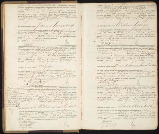 Op heden Zesentwintig september Achttienhonderd Vier-en-Vijftig, is voor ons ondergeteekende Ambtenaar van den Burgerlijken Stand der Stad Amsterdam, verschenen: Eliabeth van Dam van beroep vroedvrouw oud drieenvijftig Jaren, wonende Heerenmarkt. Buut FS. No. 260, welke heeft verklaard, dat in haar byzyn op vyfentwintig dezer des na middags ten zes ure, in het huis, staande dirk van Huffeltsteeg H 180 is geboren een Kind van het munnelyke geslacht, uit Christina Maria Paulina Fransen van beroep geen wonende als boven welk Kind zal genaamd wonden Janus Gerardus. van welke Verklaring wij deze Akte hebben opgemaakt in tegenwoordigheid van Jacobus Johannes Franssen van beroep laarzenmaker oud drieeentwintig Jaren, wonende als boven H. 580 en van Jan kniyter van beroep boaen, oud Eenenvijftig Jaren, wonende kantammerstraat No 385. en is deze At door one, benevens de Aangeefsteren de Getuigen, na voorlezing onderteekend. Evan Dans Seranss en MW Op heden Zesentwintig September is voor ons ondergeteekende Ambtenaar van den Burgerlijken Stam. Antonie Jacobus Bekker. van beroep werkman oud achtendertig Jaren, wonende Goudsbloemstraat Buurt 99. No. 495. welke heeft verklaard dat op vijfentwintig dezer des na middags ten Twee ure, in het huis, staande als boven ta geboren een kind van het mannelyke geslacht, uit Maria Gerardina Finkemeijer van beroep geen wonende als boven zyne Echtgenoot welk Kind zal genaamd worden Willem George van welke Verklaring wij deze Akte hebben opgemaakt in tegenwoordigheid van Willem Bekker van beroep smid oud zesenzestig Jaren wonende vlakkeveld BB 218, en van Antie Postema van beroep timmerma nud vierenveertig Jaren wonende Utrechtsckeustraat Z. 247. en is deze akte door ous, beneven den vader in de Gebuigen, na voorlezing onderteekend, A J Benser D W. Dekker Pos m— HG Op heden Zesentwintig september Achtienhonderd Vieren-vijtig is voor ops ondergeteekende Ambtenaaf van den Burgerlijken stand der Staa Amsterdam, verschenen: Nathans Abrdham Engelschman, van beroep jouwer: oud negen entwintig Jaren, wonende korte houtstraat Buurt P No. 225, wente heeft verklaard dat op Vierentwintig dezer des voormiddags ten vier ure, in het huis, staande als boven geboeen een Kind van het vrouwelijkgeslacht, uit Keuartje Mozes Weenen van beroep geen wonende als boven: zine Echtgenoot. welk Kind zal genaamd worden Pijtje van welke Verklaring wij deze Akte hebben opgemaakt in tegenwoordigheid van Abraham Elias sarentz van beroep geen oud zevenenveertig Jaren, wonende Langehoutstraat P. 301. en van Mozes Eliareu Pluizer van beroep gien oud achtenvijftig Jaren, wonende, korte houtstraat P. 230. en is deze Akte door ans, benevens den vader en tde Getuigen, na voorlezing onderteekend, N: R: Engeleman Rlg Barchtz . Op heden Zes en twintig september Achttienhonderd Vier-en-Vijtig, is voor ons ondergeteekende Ambtenaar van den Burgerlijken stand der Stad Amsterdam, verschenen Emmanuel Amand Fidel Constant Biairon van beroep koopman oud negenendertig Jaren, wonende Amstel. Buurt 14 No. 71., welke heeft verklaard dat op vijfentwintig dezer des voor middags ten tween ure, in het huis, staande als boven s geboren gen Kind van het mannelike geslacht, uit Henriëtte Polak van beroep geen wonende als boven: zyne Echtgenoot welk Kind zal genaamd worden manuel Amand Fidele Constant van welke Verklaring wij deze Akte hebben opgemaakt in tegenwoordigheid van Simon Palak van beroep fabrikant oud zesentwintig Jaren wonende gelderschekade N. 244, en van Heinrich Walf. van beroep geen oud vrijeenviftig Jaren, wonende Saurierstraat Er. 641 en is deze Akte koor ens, benevens den Vader en de Getuigen, na voorlezing onderteekend, Gorstr: Blairon HPolar Pegg Ht Wolft. Dit Kindisdoor Willemijntje „bij akte in dato Antonia Casteleijn. „heden, voor het „in „hare Erkend. — Zie Geb: 1884. V Regr 8 folio 47 No Amsterdam 29 Juli 1800 Vier en tachtig Drosper 15 dod heden zesentwintig sentember Achtienhonderd Vieren-Vijtig, is voor ons ondergeteekende Ambtenaar van den Burgerlijken Stand der Stad Amsterdam, verschenen: 1 „ Cuphemia Matttysten in van beroep vroedvrauw oud tweeenzestig Jaren, wonende nis Buurt A No. 293, walke heeft verklaard dat „in haar byzyn op drieentwintig dezer des namiddags ten negen — ure, in het huis, staande St Annestraat I. 367 is geboren een Kijnd van het vrouwelijk geslacht, uit Willemijntje Antonia 1astelyn 47 van beroep geen wonende als boven 9 Juli Vntig welk Kindaal genaamd worden Wilhelmina Elisabeth van welke Verklaring wij deze Akte hebben opgemaakt in tegenwoordigheid van ohannes van Adrichem van beroep geen oud zestig Jaren, wonende boomsloot n. 336 en van Daniel vander Meer van beroep kleeremaker oud vijfenveertig Jaren, wonende Oude doelenstraat B3318 en is deze Akte door ons, beterens de Aangeefsteren de Getuigen, na voorlezing onderteekend. E: Hattersen EA Len 1HG D van Der Meer. Op heden Zesentwintig sentember Achtienhonderd Vier-en-vijtig is voor ons ondergeteekende Ambtenaar van den Burgerlijken Stand der Stad Amsterdam, verschenen: Gurbe Nauta van beroep schilder oud zevenenveertig Jaren, wonende realenoiland Buurt VV. No. 87, welke heeft verklaard dat op vifentwintig dezer des na middags ten halftwaalf ure, in het huis, staande als boven is geboren een kind van he vrouwelykt geslacht, uit Wijntje Simons van beroep geen wonendeals boven zijne Echtgenoot welk kind aal geraand worden Maria Elisabeth. van welke Verklaring wij deze Akte hebben opgemaakt in tegenwoordigheid van Rein Timons, van beroep kleirsmaker oud negenenveertig Jaren wonende Aujeliersgracht O0632en van Jacobus Simans, van beroep schoenmaker oud achtendertig Jaren, wonende als boven Ob 632. en is deze Akte door ons, benevens den vader in de Getuigen, na voorlezing onderteekend. CVauta R: Simons Rug J: Simons.