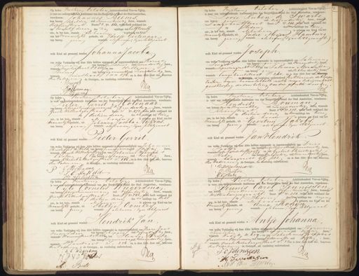 Op heden Veertien October Achttienhonderd Vier-en-Vijftig is voor ons ondergeteekende Ambtenaar van den Burgerlijken Stand der Stad Amsterdam. verschenen: Johannes Beems. van beroep schilder oud zevenentwintig Jaren, wonende Antelierstraat Buurt OO, No. 460,, welke heeft verklaard dat op twaalf dezer des na uiddags ten half twaalf ure, in het huis, staande als boveren is geboren een Kind van het vrouwelike geslacht, uit Jansie Gertenaar, van beroep geen wonende als boven, zyne Echtgenoot welk Kind zal genaamd worden Johanna Jacoba van welke Verklaring wij deze Akte hebben opgemaakt in tegenwoordigheid van Barend Herman van beroep Gandsmid oud zesendertig Jaren, wonende Anjelierstraat Oo 460/ en van Willem Beems van beroeigarenmaker oud zesentwintig Jaren wonende tuinstraat nn 376, en is deze Akte door ons, bererens den vader en de Getuigen, na voorlezing onderteekend Beeph PMG PHllerman. 1 Vier-en-Vijftig Op heden Veertien October Achttien is voor ons ondergeteekende Ambtenaar van den Burgerijken Stand der Stad Jnsterdam, verschenen: Levie Ruben de Swarte van beroep gen oud achtendertig Jaren, wonende Langehoutstraat Buurt P. No. 304, weke heeft verklaard dat op Heden des voormiddags ten tien ure, in het huis, staande als boven is geboren een Kind van het mannelyke geslacht, uit Jndic Meijer Hamburg van beroep geen wonende als boven zijne Echtgenoot. welk Kind zal genaamd worden Josept. van welke Verklaring wij deze Akte hebben opgemaakt in tegenwoordigheid van Saloman Swart van beroep geen oud vierendertig Jaren, wonende Siprozengracht P.82en van Salaman Miranda van beroep geen oud achtendertig Jaren, wonende langehoutstraat P. 240. en is deze Akte door ous Geneveng de Getuigen, na voorlezing onderteekend. Vyklarende de kompe ranten, wegens kunnen sabbath niet te mogen schrijven;¶ met goedkeuring der doorhaling van drie gedrukte woorden Bttg my Op heden Veertien October Achttienhonderd Vieren-Vijtig is voor ops ondergeteekende Ambtenaar van den Burgerlijken Stand der Stad Amsterdam, verschenen Hotenaar. ieter Gerrit van beroep scheepstimmerman oud vijfendertig Jaren, wonende groote Wittenbgerstraat Buurt No. 472, welke hecht verklaard da 6p dertien dezer des namiddags ten tien ure, in het huis, staande als boven is geboren een Kind van het mannelijkgeslacht, uit Johanna Jacoba Aijkens, van beroep geen wonende als boven: zijne Echtgenoot. welk Kind zal genaamd worden Pieter Gerrit van welke Verklaring wij deze akte hebben opgemaakt in tegenwoordigheid van Johannes christoftel de Wilde van beroep timmerman oud vijftig Jaren wonende groote Wittentgerstraat, en van Johannes Henrichs kosteren van beroep als boven oud veertig Jaren, wonende Kleine Kattenkgerstraat . 666, en is deze Akte door ans, benevens den Vader en de Getuigen, na voorlezing onderteekend P G Holenaar JG J: C. De WUde Op heden Veertien October Achttienhonderd Ver-en-Vitig, is voor ons ondergeteekende Ambtenaar van den Burgerlijken Stand der Stad Amsterdam, verschenen: Hendrik Douman van beroep modellenmaker oud zesenveertig Jaren, wonende Rozenstraat Buurt EE. No. 278,, wolke heeft verklaard dat op dertien dezer des voormiddags ten twee ure, in het huis, staande als boven is geboren een kind van het mannelyke geslacht, uit Geertrui Jakob van beroep geen wonende als boven zine Echtgenoot welk Kind zal genaamd worden Jan Hendrik van welke Verklaring wij deze Akte hebben opgemaakt in tegenwoordigheid van Dries aater van beroep nodellinm aker oud zesenveertig Jaren, wonende Korte Leijdschedistraat en van Gysbert Christiaan Rake van beroep yrerfieter oud twee enveertig Jaren 1 wonende baangracht GG 183. en is deze Akte door ons berevens den vader en de Getuigen, na voorlezing onderteekend. :Boreman J9 D Paster 72 Op hedenveertien October Achttienhonderd Vier-en-Vijtig is voor em opdergeeekende hmbtenaar van den Burgerher stand der Stad Amsterdam, verschenen: Lijle Cornelis Wiegersman. van beroep scheepstimmerman oud vijfendertig Jaren, wonende grootte Kattenbgerstraat Buurt J7 No. 746., vekke heeft verklaard de Dp dertien dezer des na middags ten acht ure, in het huis, staande als braven 19 is geboren een Kind van het mannelijke geslacht, uit Cbeltje Comkes van beroep geen wonende als boven: zyne Ehtgenoot welk Kind zal genaamd worden Hendrik Jan van welke Verklaring wij deze Akte hebben opgemaakt in tegenwoordigheid van Heere lans vander schaar van beroep schipper oud vijfenvijftig Jaren, wonende Warmoesstraat M. 443 van Hinri Bretz van beroep timmerman oud tweeendertig Jaren, wonende SJanstraat 7. 346, en is deze Afte door ous, beneven. den vaderen de Getuigen, na voorlezing onderteekend. E C Wiegertman V119 H D V d Petar H:: Bretz id GJh. G Op heden Veertien Octobi Achtienhonderd Vieren-Vijtig is voor ons ondergeteekende Ambtenaar van den Burgerlijken Stand der Stad Amsterdam, verschenen: Leunis Carel Teunissen van beroep wirkman oud vijfentwintig Jaren, wonende wittenkurgergracht. Buurt J. No. 250,, welke heeft verklaard dat Heden des voormiddags ten negen ure, in het huis, staande als boven is, geboren een Kind van ke vrouwelijke geslacht, uit Anna Rohijn van beroep geen wonende als boven; zyne Echtgenoot welk Kind zal genaamd worden Antie Johanna van welke Verklaring wij deze Akte hebben ovennaakt in tegenwoordigheid van Hyrmen Tennissen van beroep oorman oud vijftig Jaren, wonende kadijk, n 659, en van Zebastianus totephus franciscus van Leeuwen van beroep lastenmaker oud vijftig Jaren, wonende groote Oostenburgerstraat I. 53, en is deze Akge door ons, benevens den Vaderen de Getuigen, na voorlezing onderteekend. H Peunieen 4119 H Twulegen J P van Leeusten